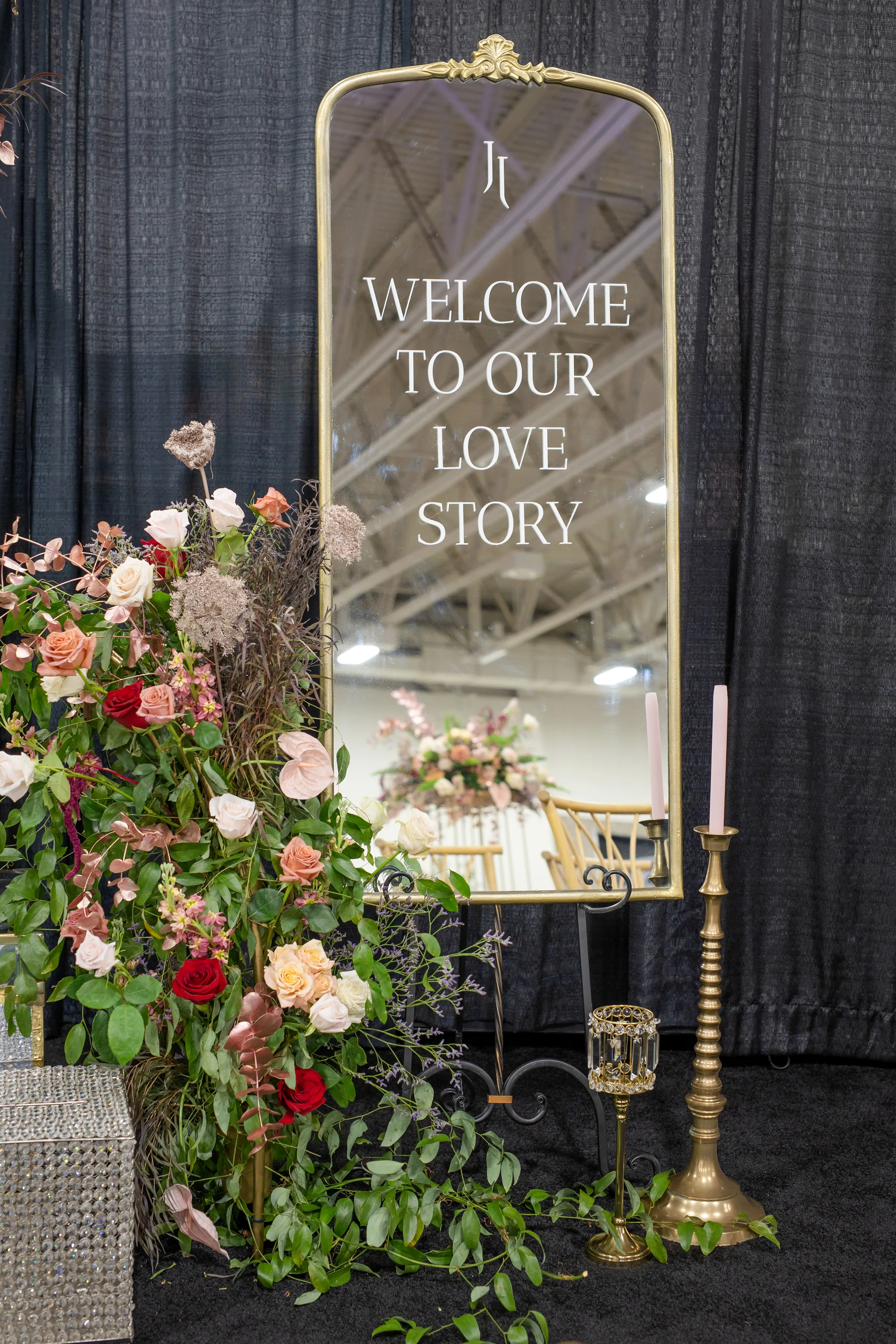 Beside the dessert table, a welcome sign—an antique mirror with cut vinyl lettering—helped further bridge the gap between Regency era and modern.