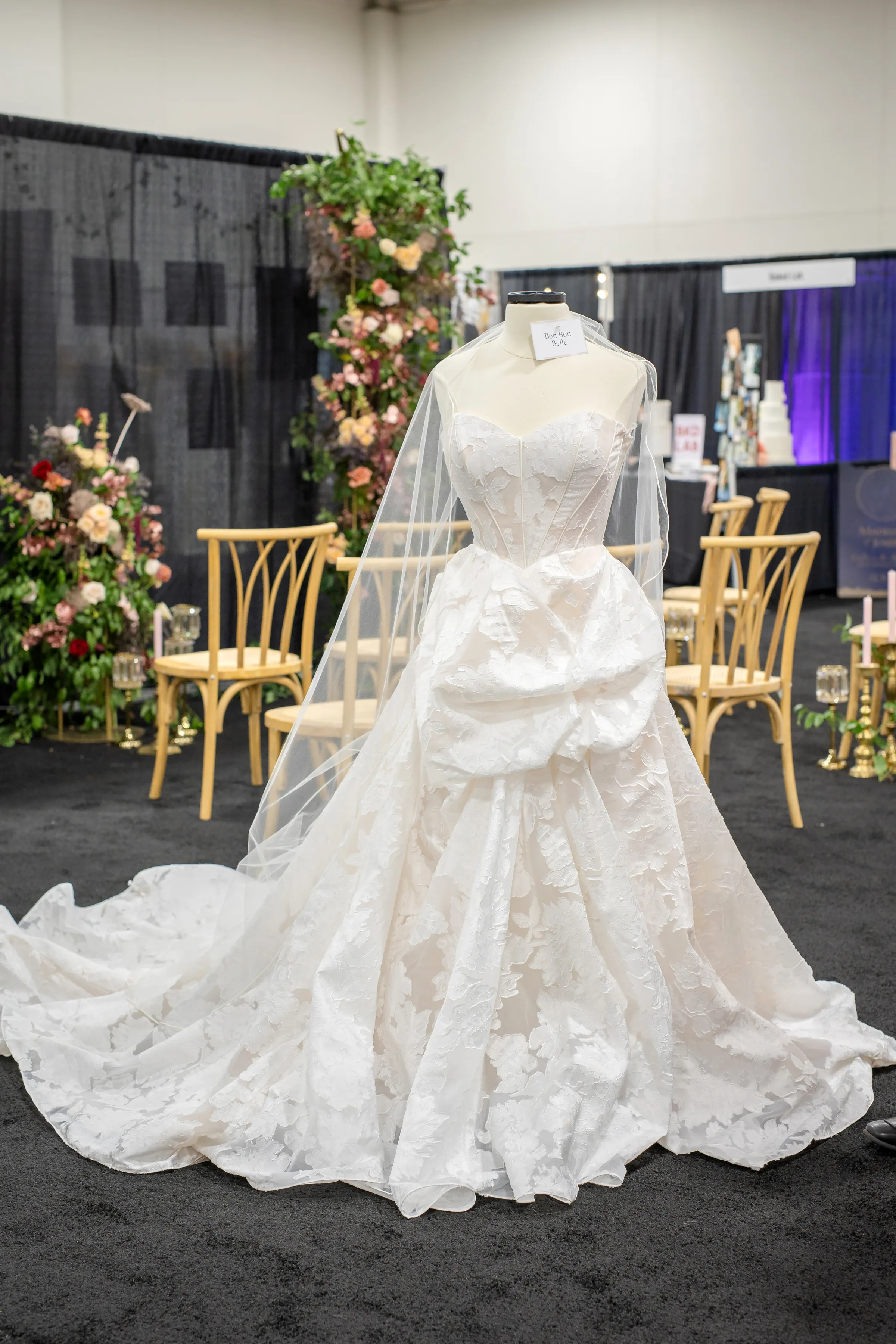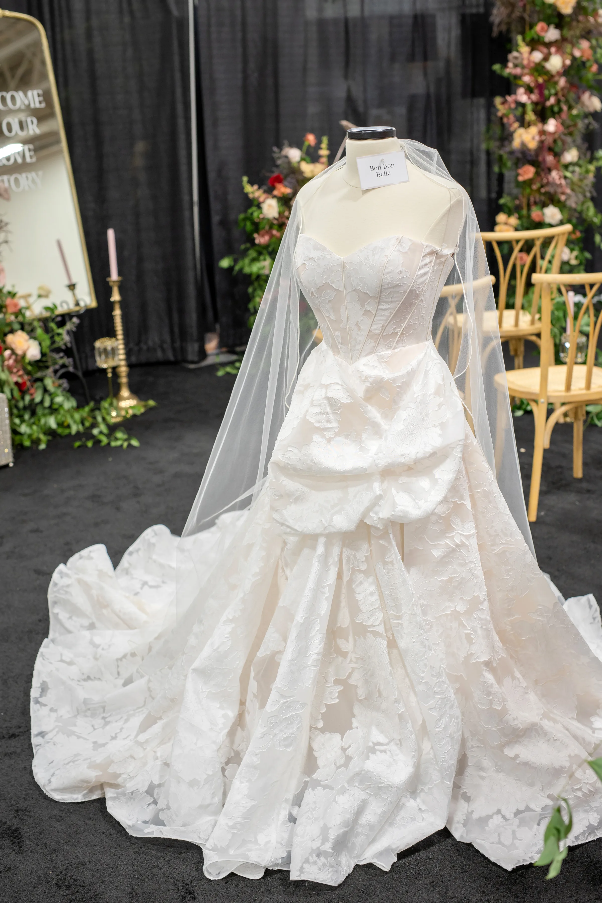 Basque waist princess silhouettes are among the biggest trends in bridal fashion this year and are perfectly suited to a modern regency theme. Bon Bon Belle selected a strapless gown with a structured corset waist and voluminous, layered skirt. The fabric was a unique, sophisticated Jacquard Organza with floral patterns sewn directly into the airy, sheer weave. The dress was accessorized with a simple, floor-length veil.