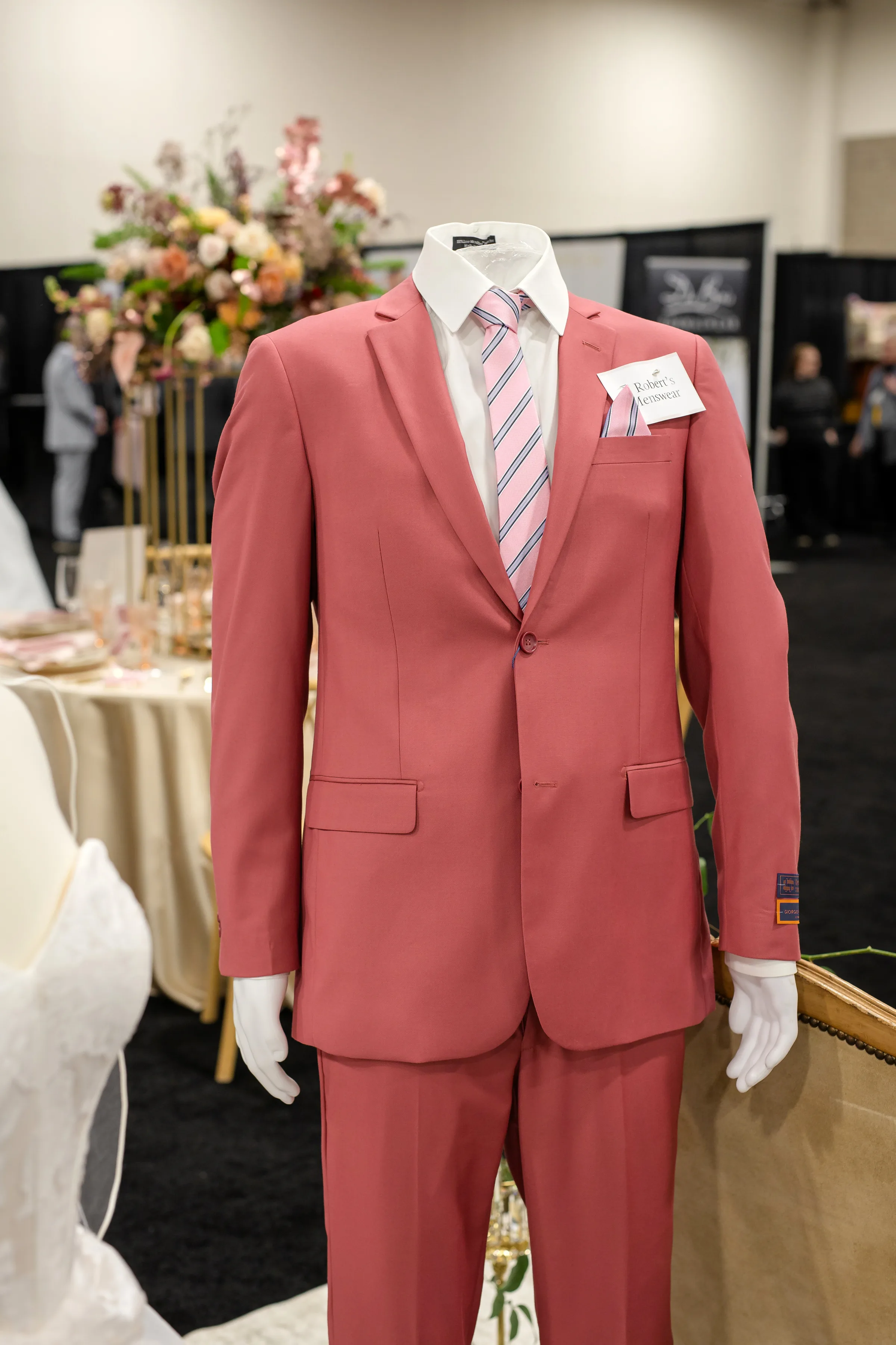 J. Robert’s Menswear outfitted the groom in a rich mauve suit, a white undershirt, and a matching tie and pocket square.