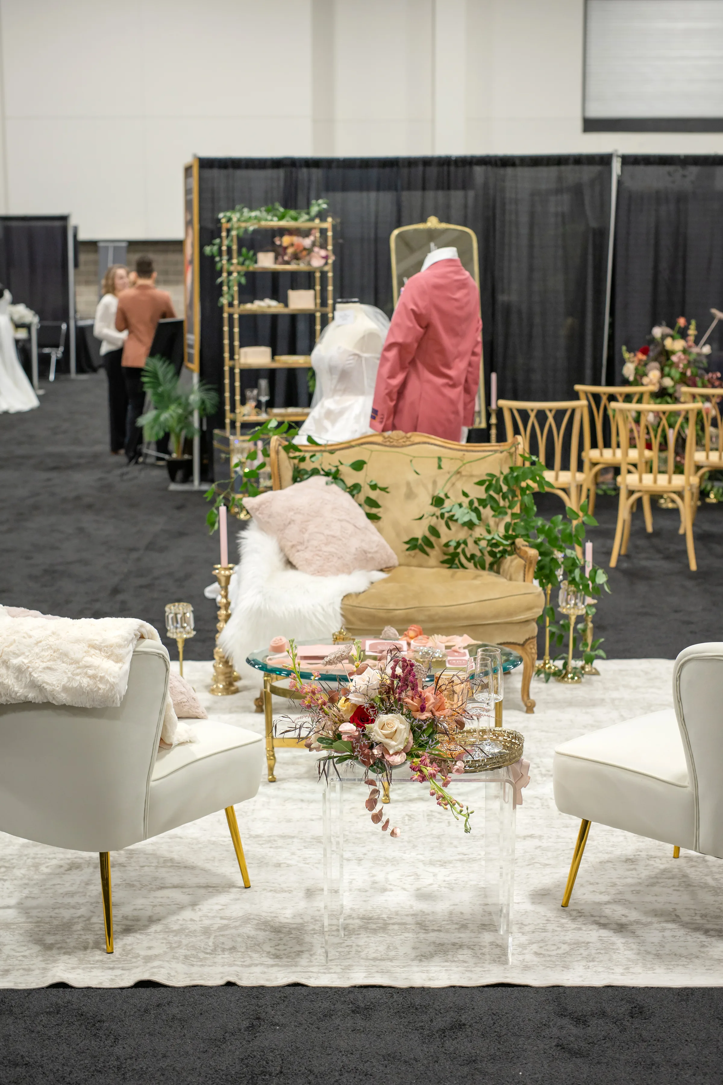 The lounge, set atop a textured white rug, included a mix of vintage and contemporary furniture pieces including white shell chairs, a tan settee, a glass coffee table, and clear acrylic end tables.