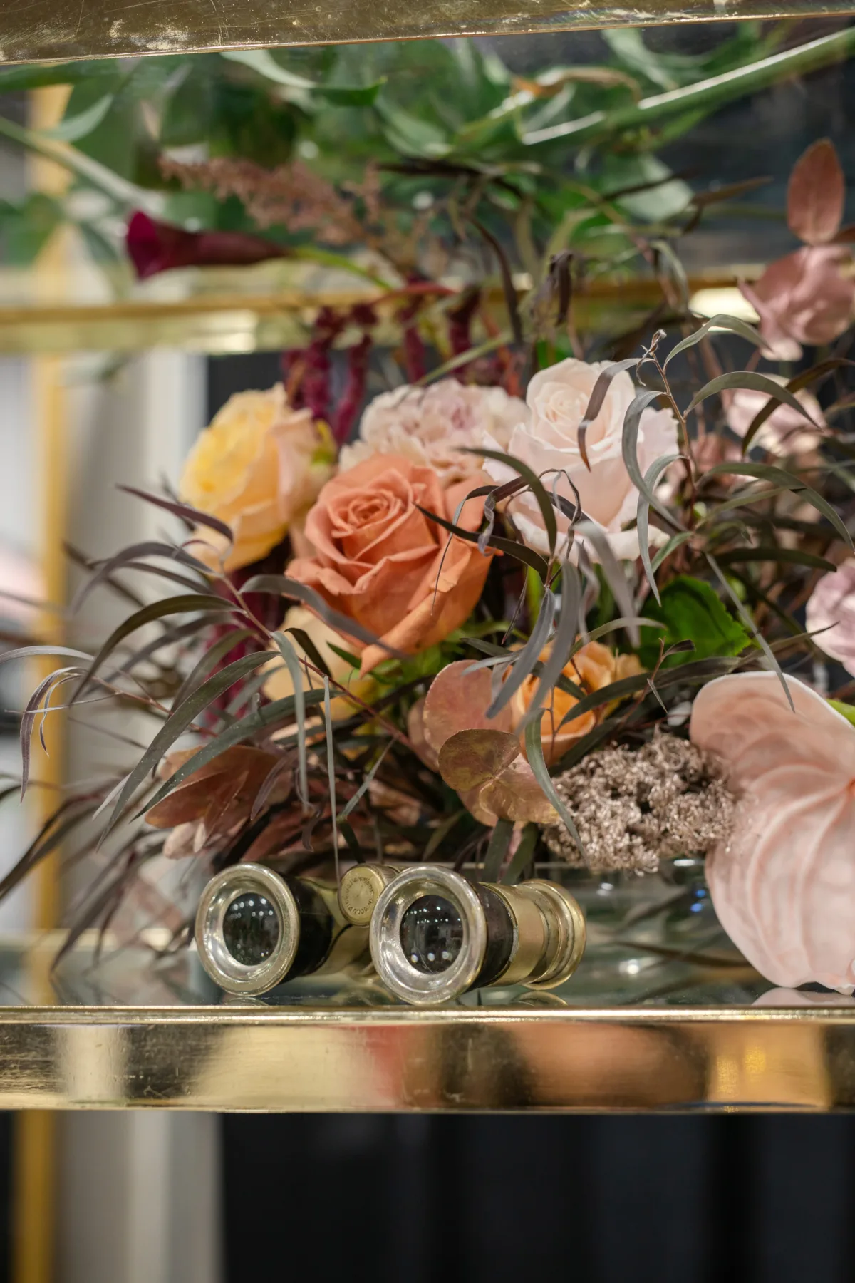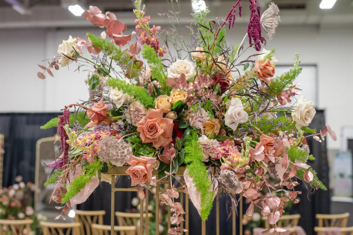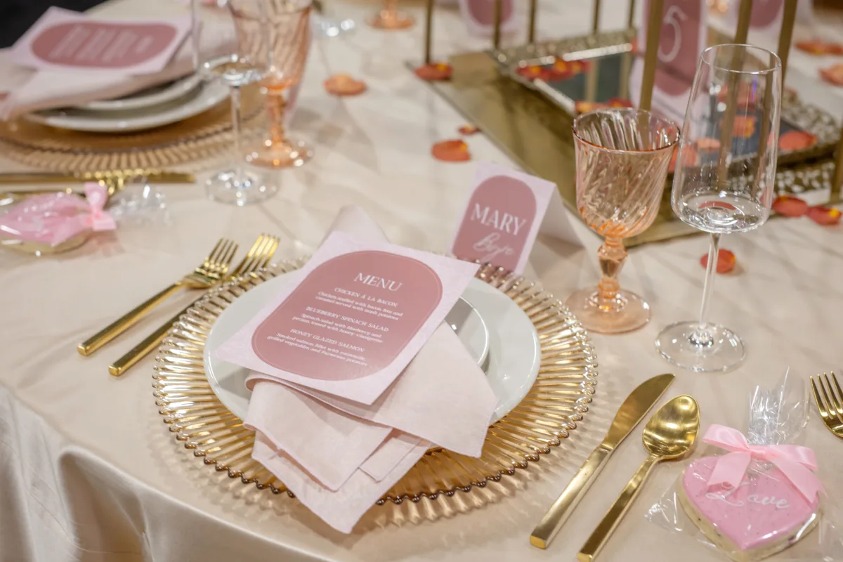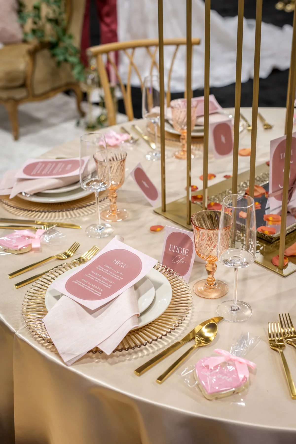 A towering tablescape was a must. Cosmic Gardens provided the florals for the scape, beginning with a grand centerpiece. Blooms and greenery included roses, amaranthus, anthurium, snapdragons, crawling greenery, and painted eucalyptus. The centerpiece was surrounded by clear and tinted crystal glassware, crimped-edge chargers, white plating, gold silverware, and champagne and blush satin linens. Event Essentials and Velvet Rentals provided rental pieces throughout the design.