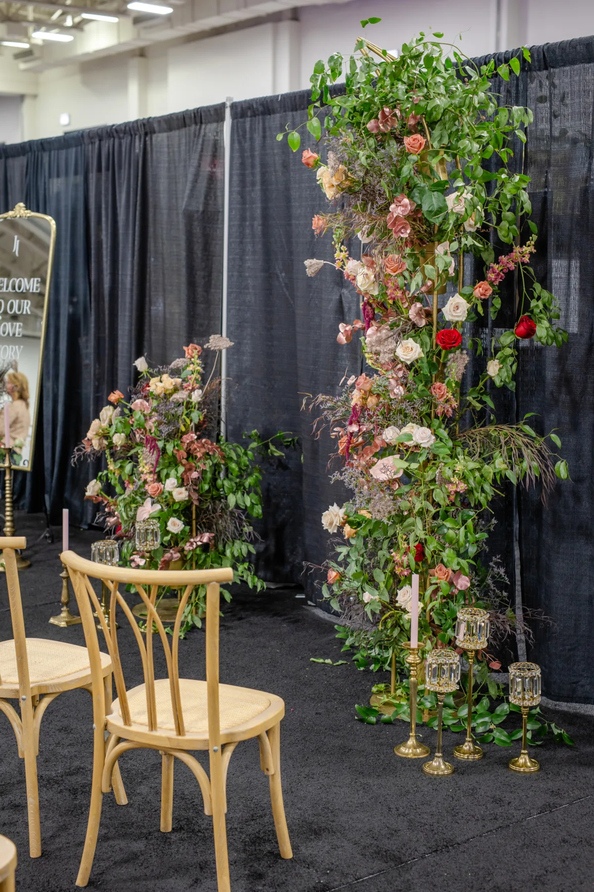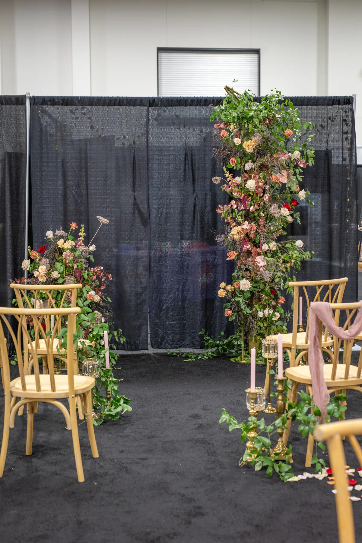 Florals continued at the ceremony scene, which featured a lush, asymmetrical arch backdrop. Other details included natural willow rattan seating, tulle draping, shimmering candle holders, and blush candles in brass candle holders of varying heights and designs.