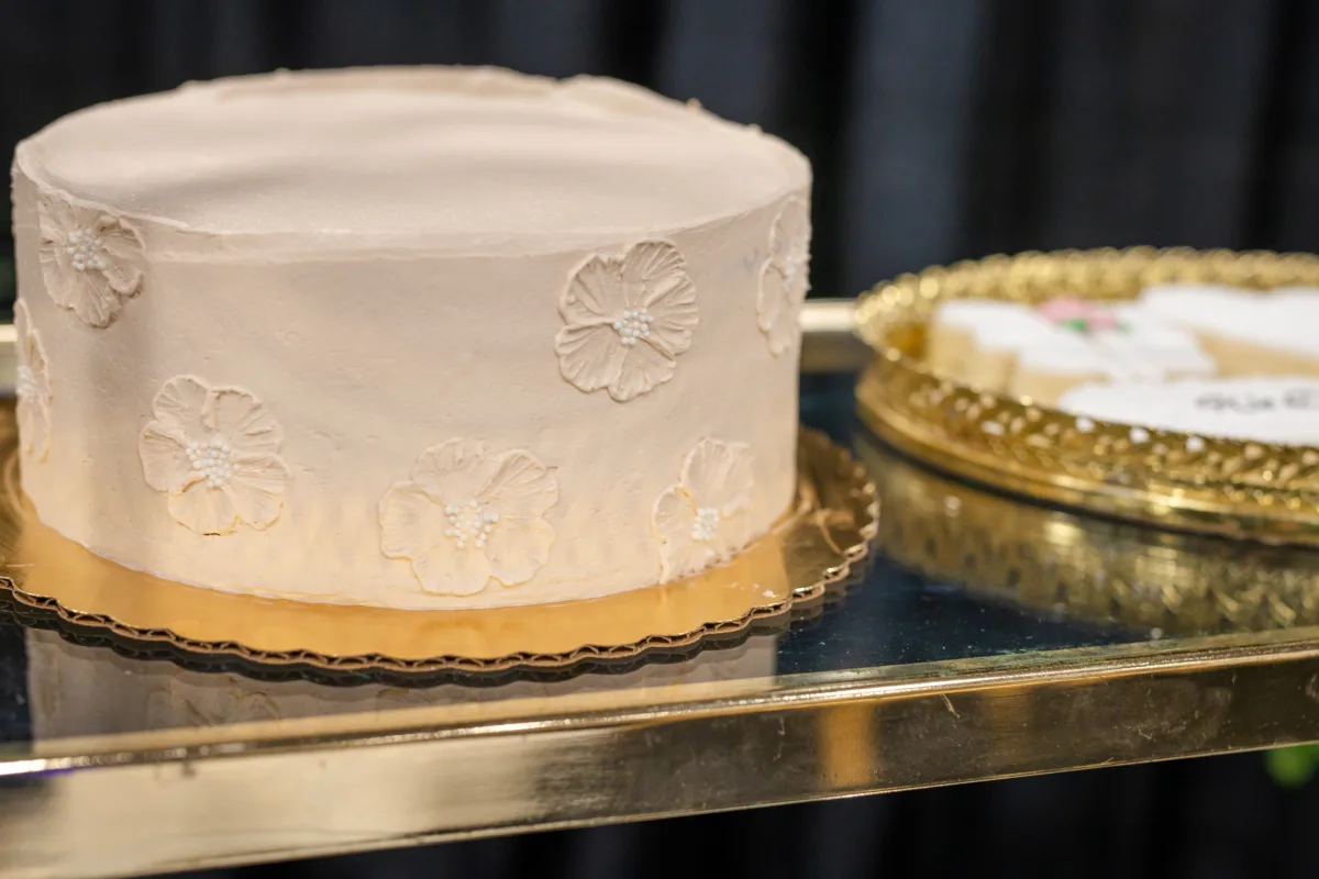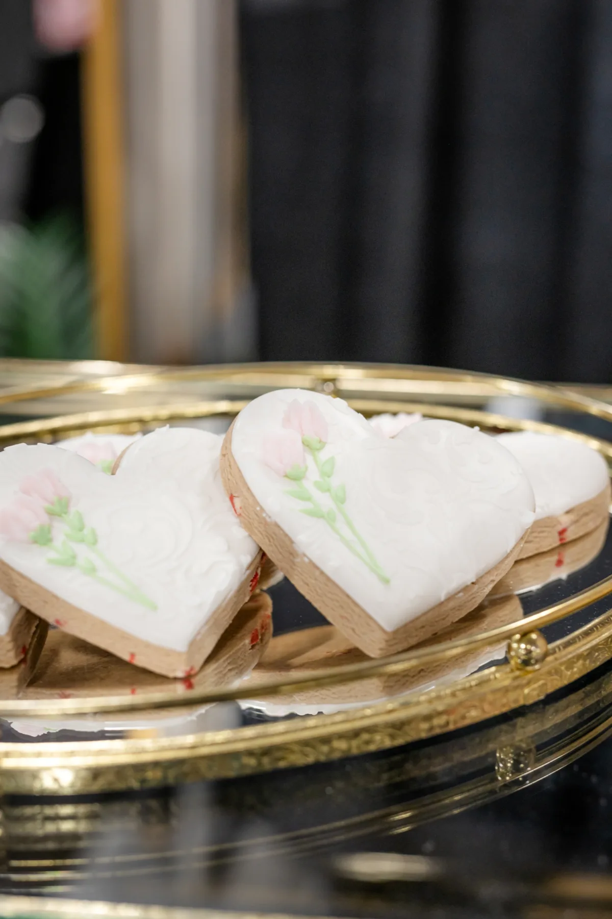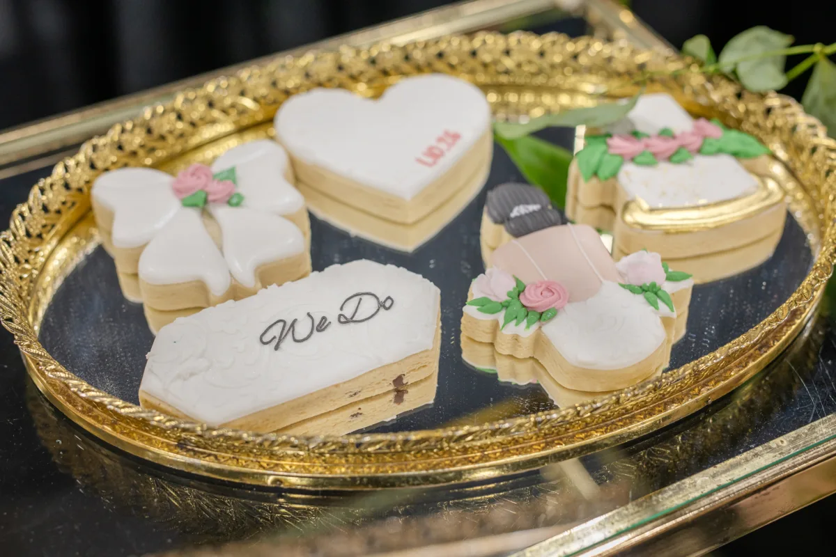 Sandy Cakes designed a three-tier cake, with separate layers artfully arranged across the levels of an antique shelf. Cookies from Princess J Cookie Creations also adorned the shelves and served as favors at the tablescape.
