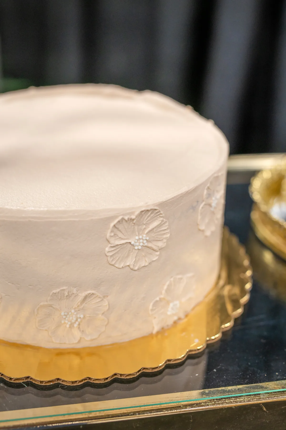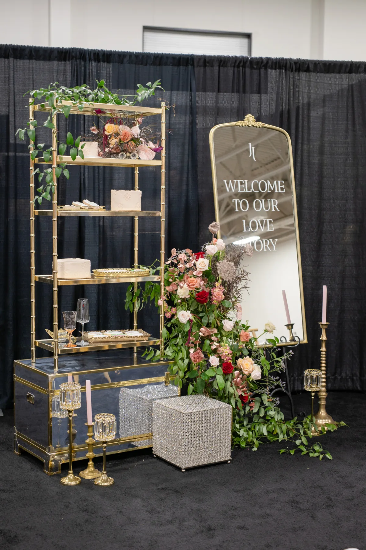 Beside the dessert table, a welcome sign—an antique mirror with cut vinyl lettering—helped further bridge the gap between Regency era and modern.