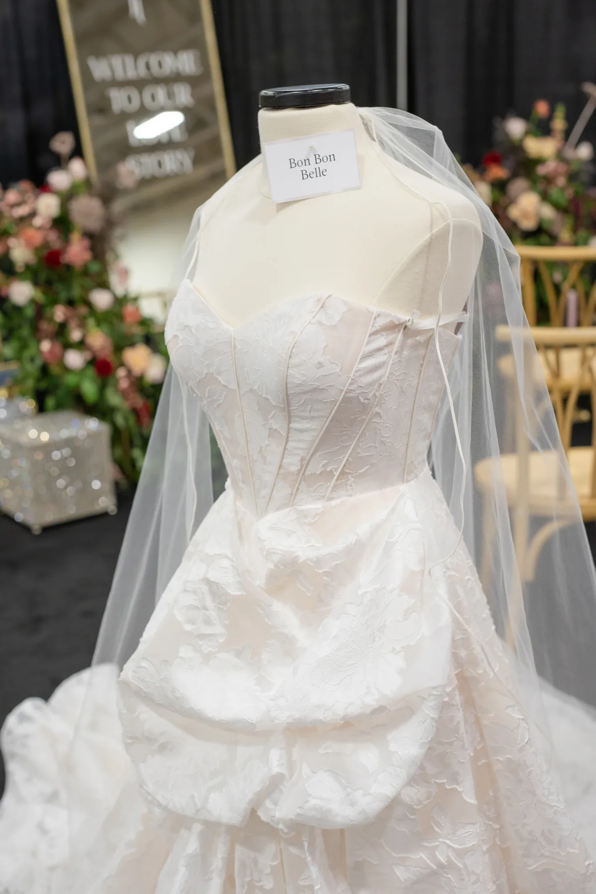 Basque waist princess silhouettes are among the biggest trends in bridal fashion this year and are perfectly suited to a modern regency theme. Bon Bon Belle selected a strapless gown with a structured corset waist and voluminous, layered skirt. The fabric was a unique, sophisticated Jacquard Organza with floral patterns sewn directly into the airy, sheer weave. The dress was accessorized with a simple, floor-length veil.