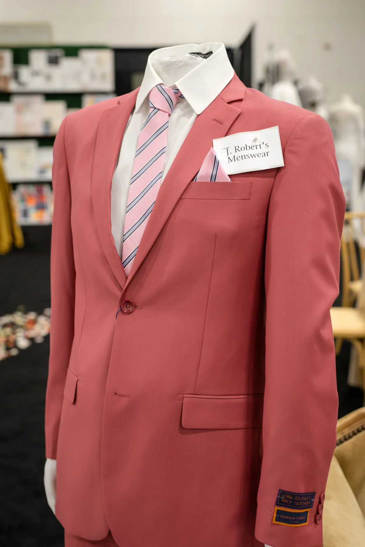 J. Robert’s Menswear outfitted the groom in a rich mauve suit, a white undershirt, and a matching tie and pocket square.