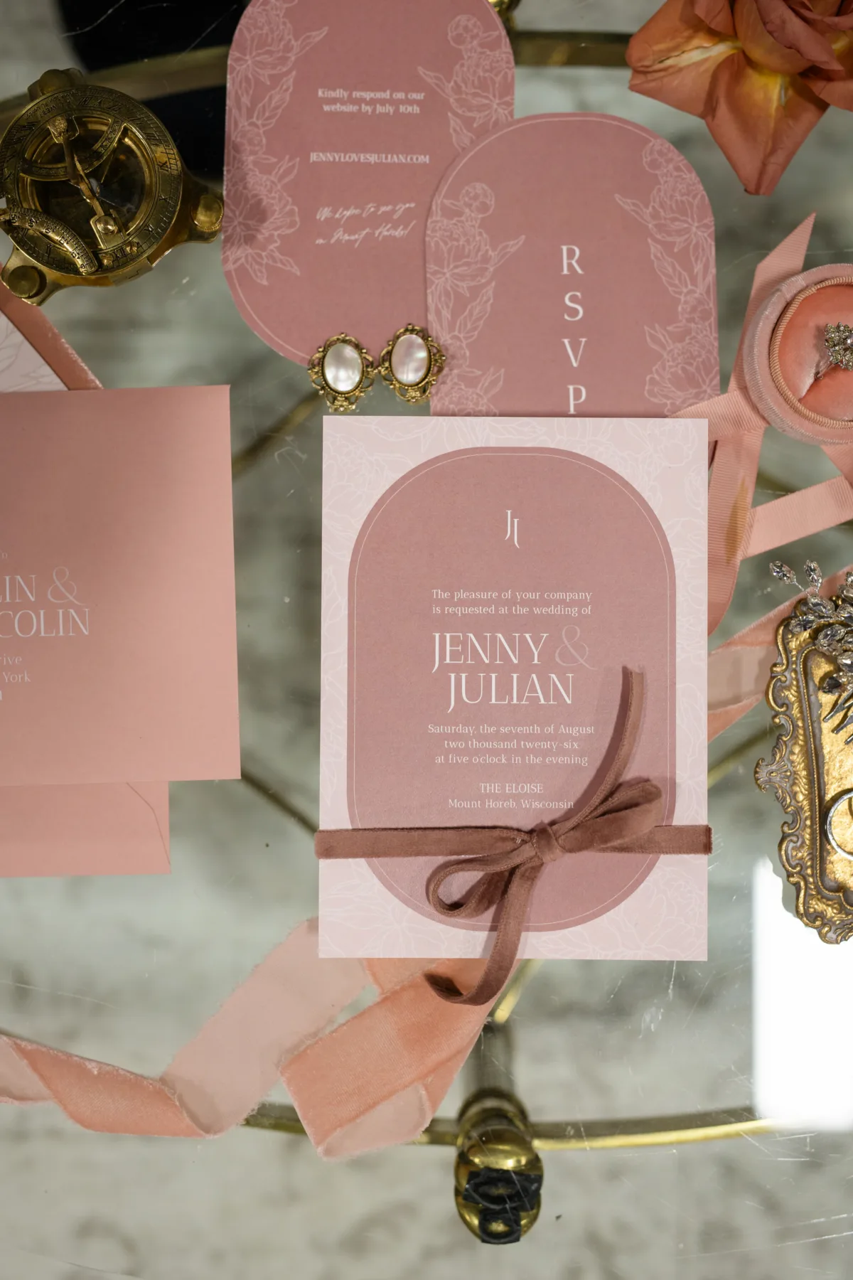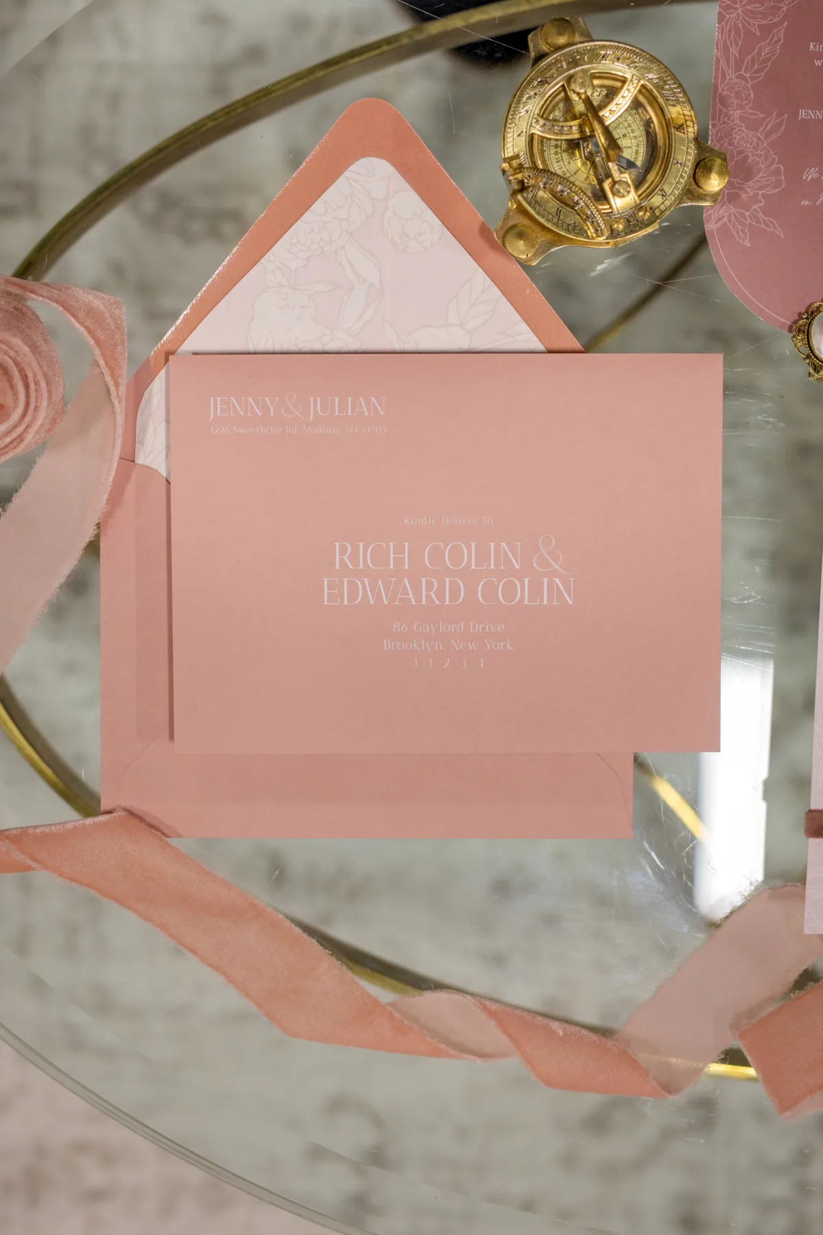 Coordinator LK Bridal drew inspiration from Regency Era romances, like those of Jane Austen and more recent cultural phenomena like Bridgerton, but also strove to incorporate modern elements into the styling. They began by creating a stationery suite that combined solid colors with contour cuts and detailed, monochromatic, flower motifs.