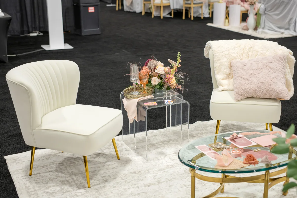 The lounge, set atop a textured white rug, included a mix of vintage and contemporary furniture pieces including white shell chairs, a tan settee, a glass coffee table, and clear acrylic end tables.