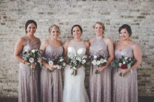 winter wedding, mauve sequin metallic bridesmaid dresses