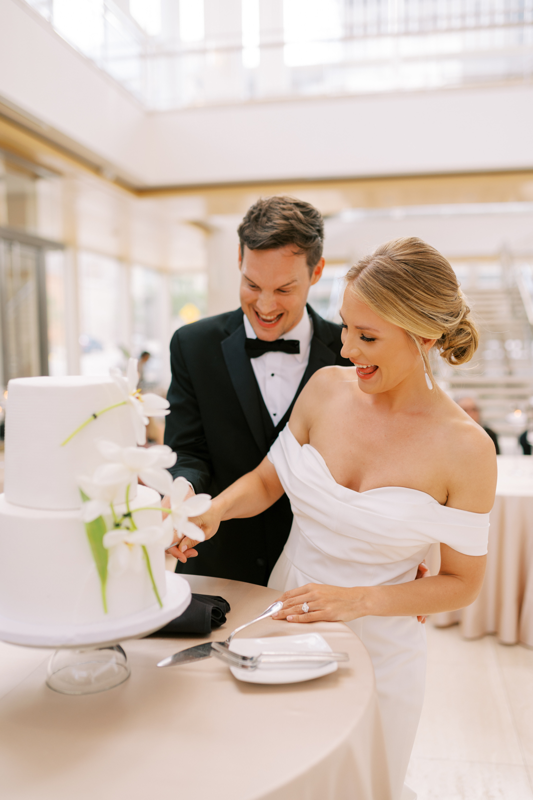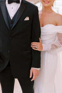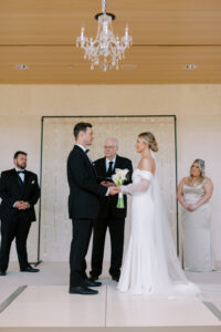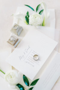 Kelsey and Sam’s minimalist style was nothing short of stunning with each simple yet intentional detail they incorporated like a textured, monochromatic stationery suite and cake, elegant Calla Lily floral arrangements, casual lounge reception seating, and more. With light brunch fare, Bloody Marys, and a live jazz band, enjoy every element of their celebration below.