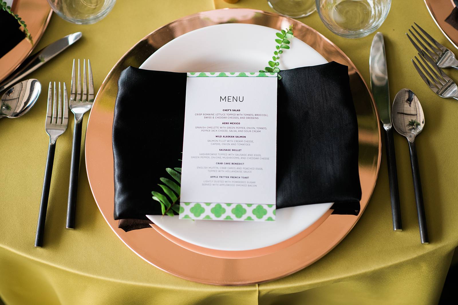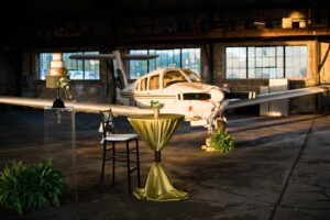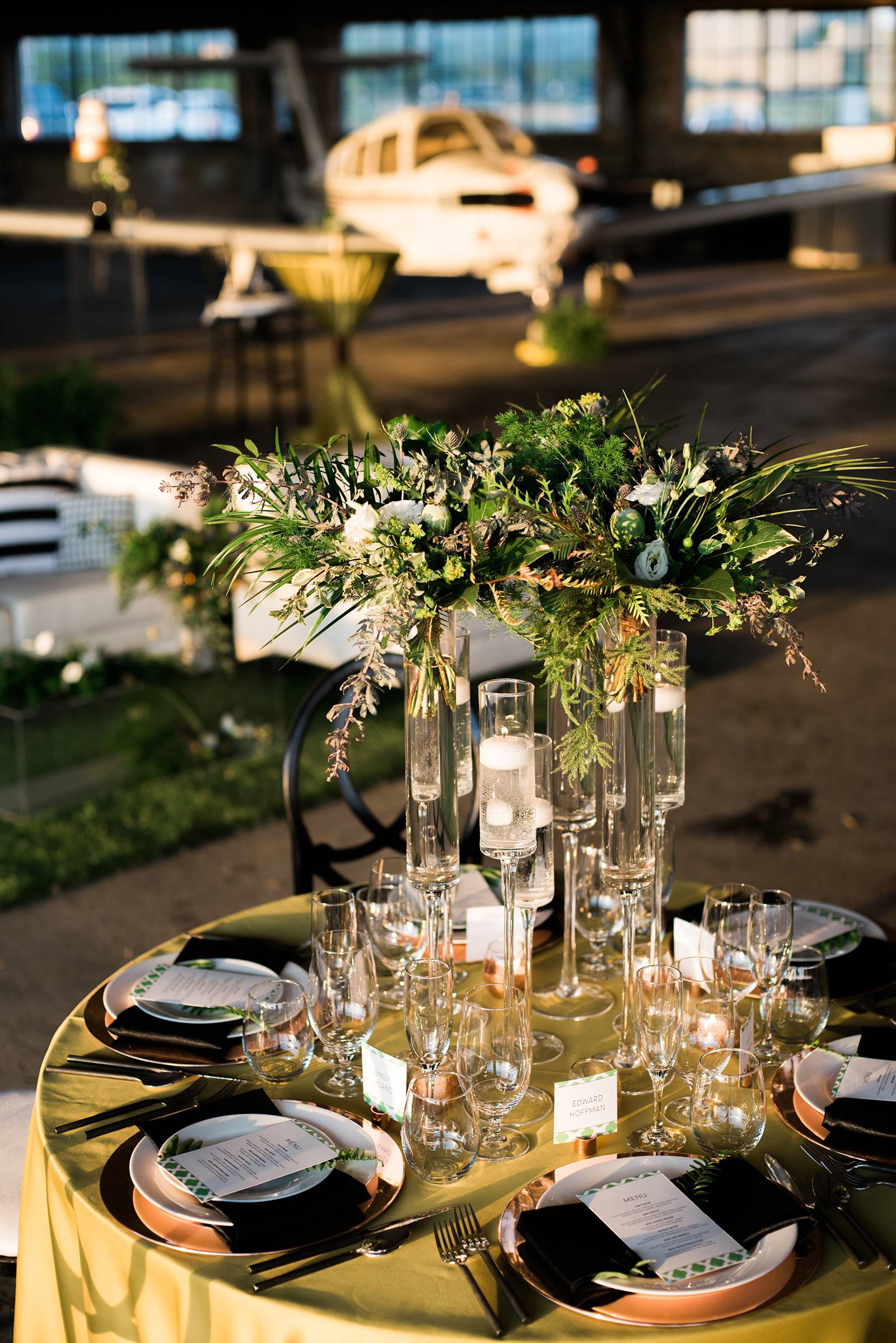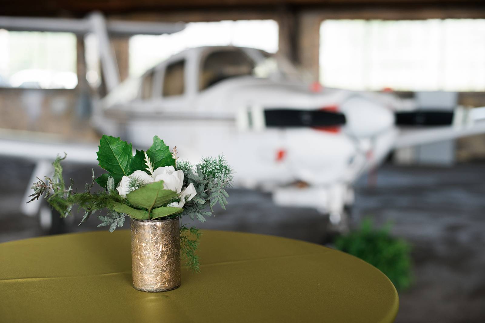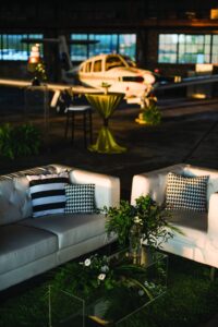 An airport hangar might be the last place you would think of for a wedding venue, but after taking one look at this modern aviation shoot, you may just want to reconsider. This airport hangar at Wisconsin Aviation was beautifully transformed into a modern chic space by Korrine with Event Essentials. Infused with a green, black and white color palette, copper accents, and an elegant lounge area, the warm golden light reflecting through just as the sun was setting is icing on the cake. See all the pretty results in the gallery below captured by Tim Fitch Photography.