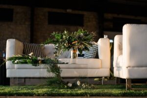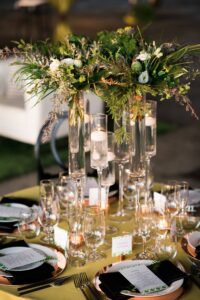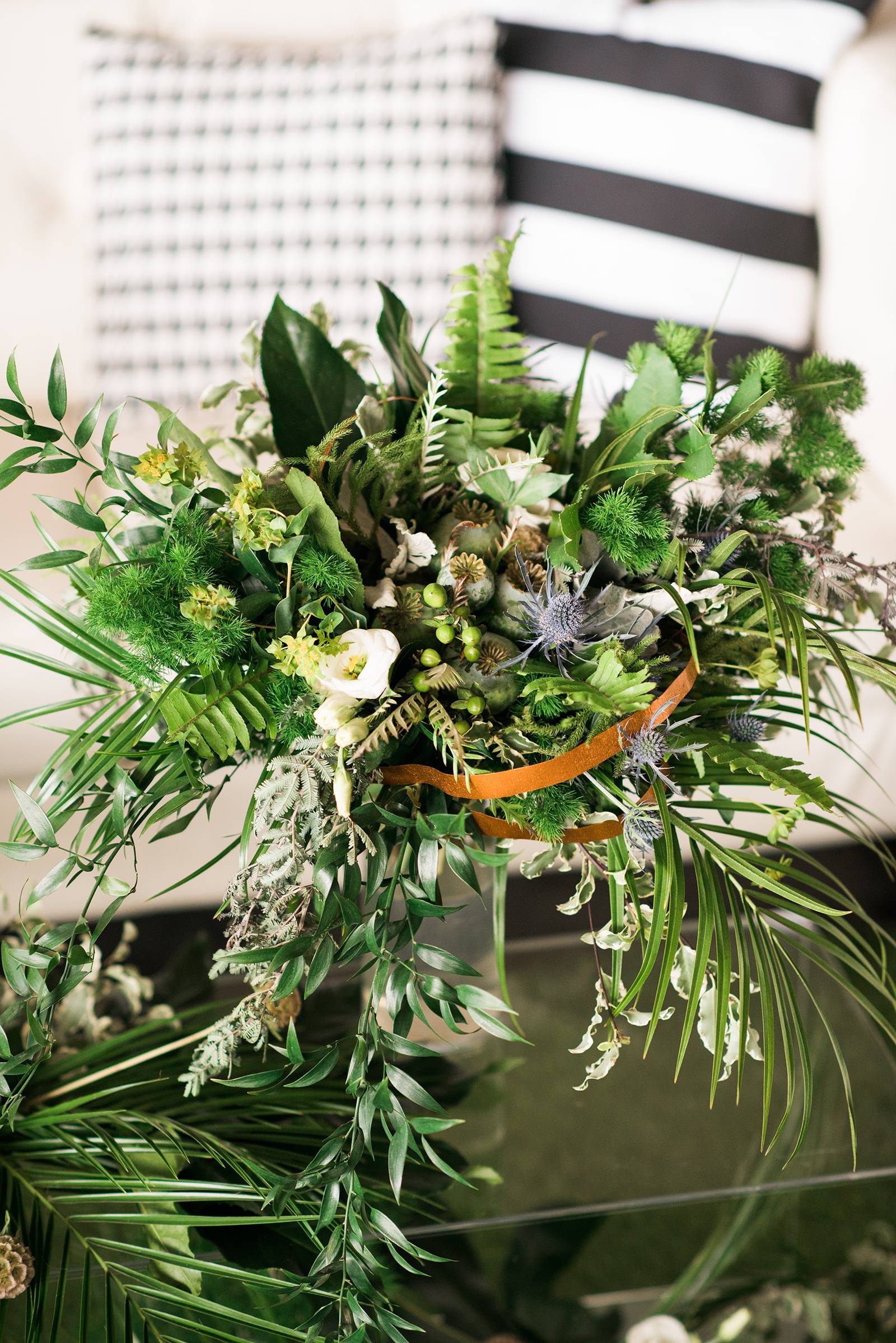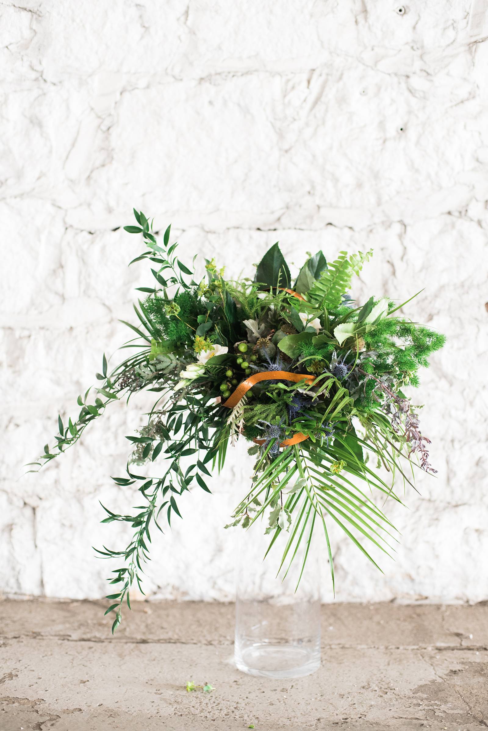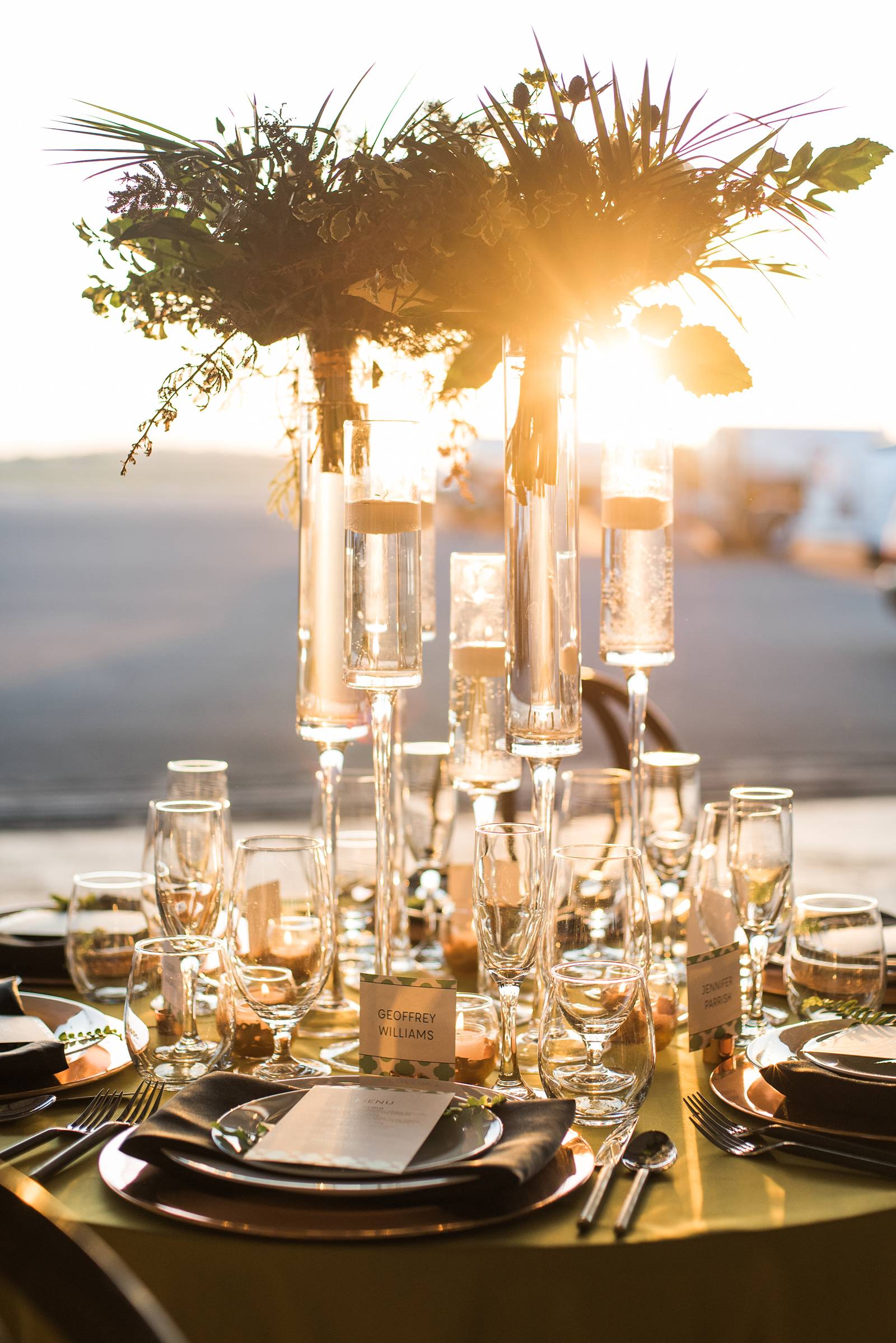 An airport hangar might be the last place you would think of for a wedding venue, but after taking one look at this modern aviation shoot, you may just want to reconsider. This airport hangar at Wisconsin Aviation was beautifully transformed into a modern chic space by Korrine with Event Essentials. Infused with a green, black and white color palette, copper accents, and an elegant lounge area, the warm golden light reflecting through just as the sun was setting is icing on the cake. See all the pretty results in the gallery below captured by Tim Fitch Photography.