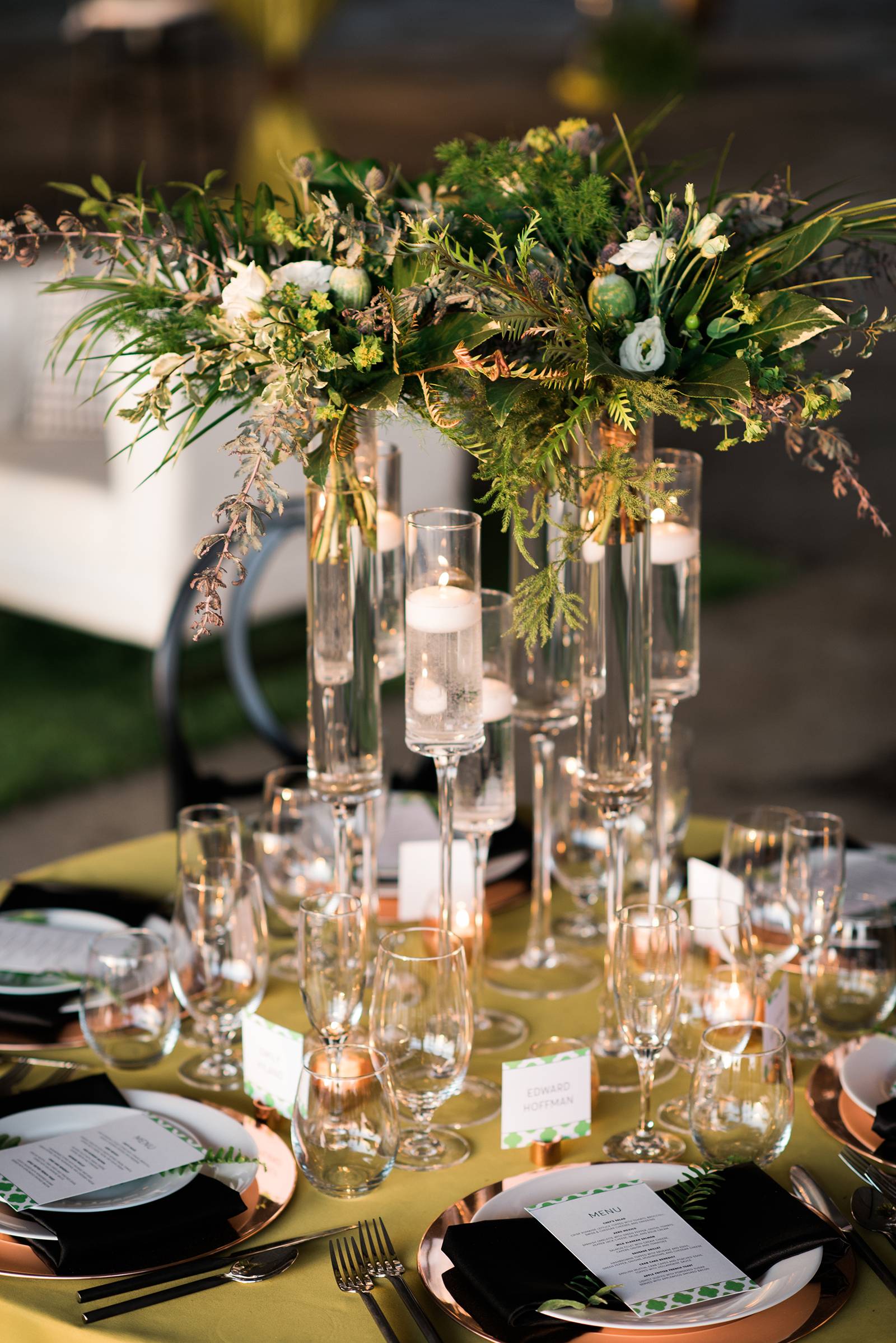 wedding reception design, green table linens, tall floral centerpieces, black specialty chair rental