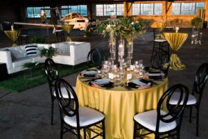 airplane hangar wedding reception venue space, green cocktail tables, cocktail hour, cocktail recept