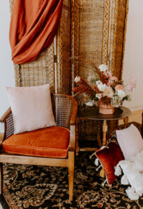 We love our bride’s simple and free-flowing boho look in her gown from Marah’s Elegant Bridal against this stunning and cozy scene made up of pieces from Velvet Rentals! Adding a seating area to your wedding day design creates an intimate area for you and guests to chat and enjoy each other’s company even more.