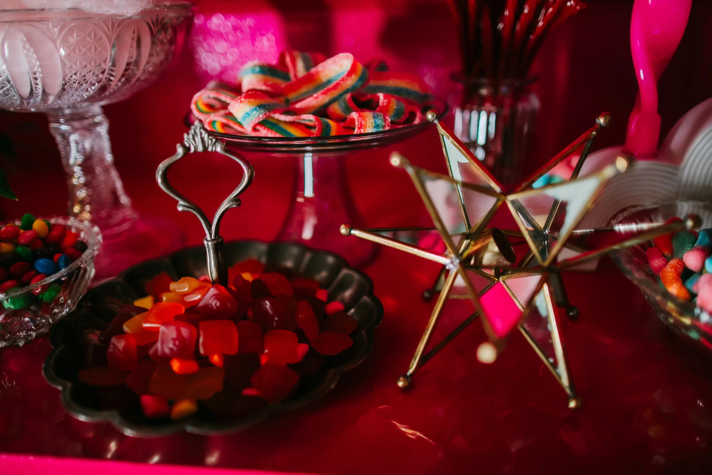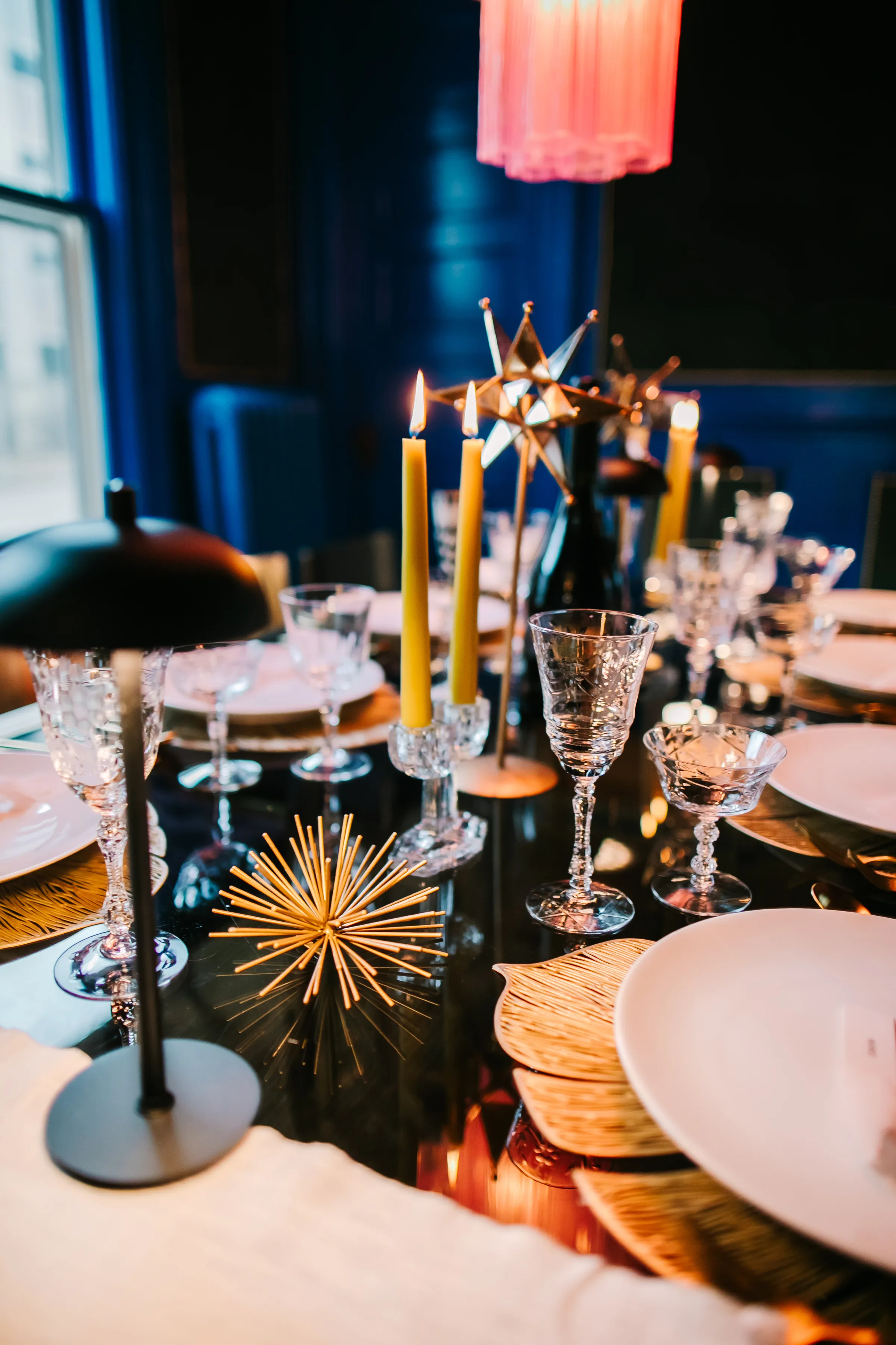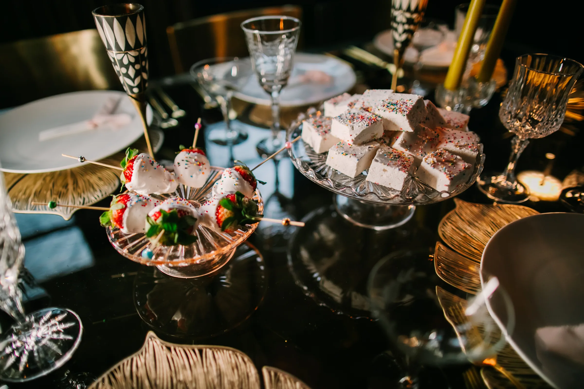 Textural details from Velvet Rentals elevated the setting with mirrored stars and starbursts, crystal glassware, matte-black table lamps, white dinner plates, and gold flatware. Gold leaf chargers, colored flute glasses, glowing candles, candy, and desserts by Happy Joy Hospitality, along with a cutting cake from Madison Sourdough, brought the entire look together with flair.