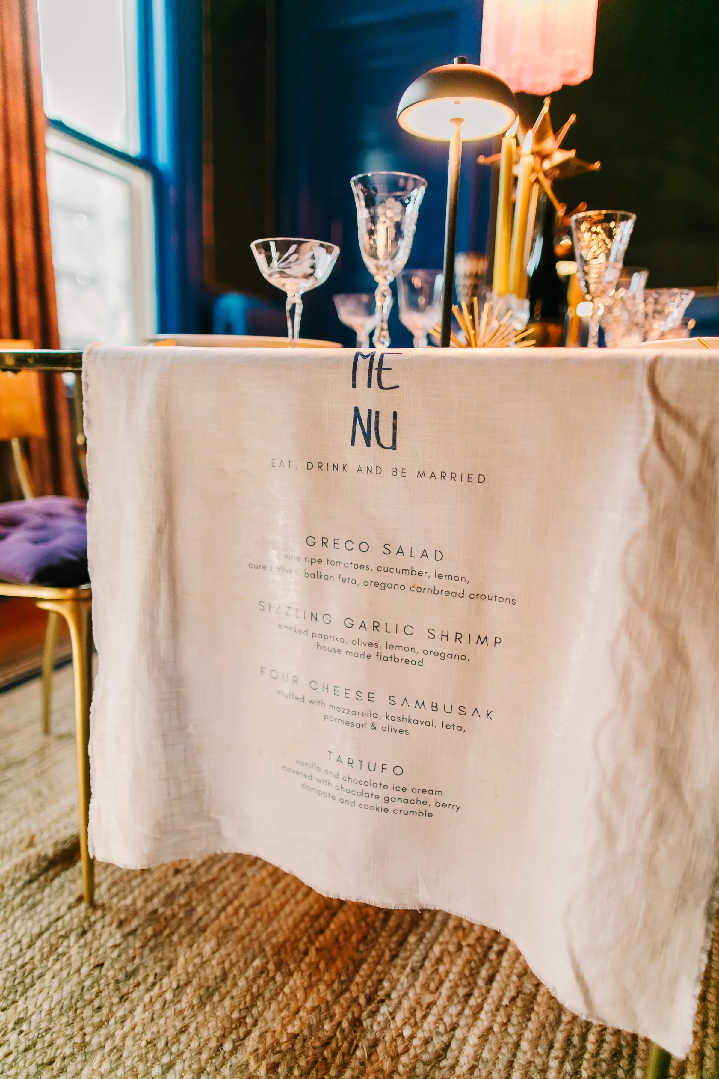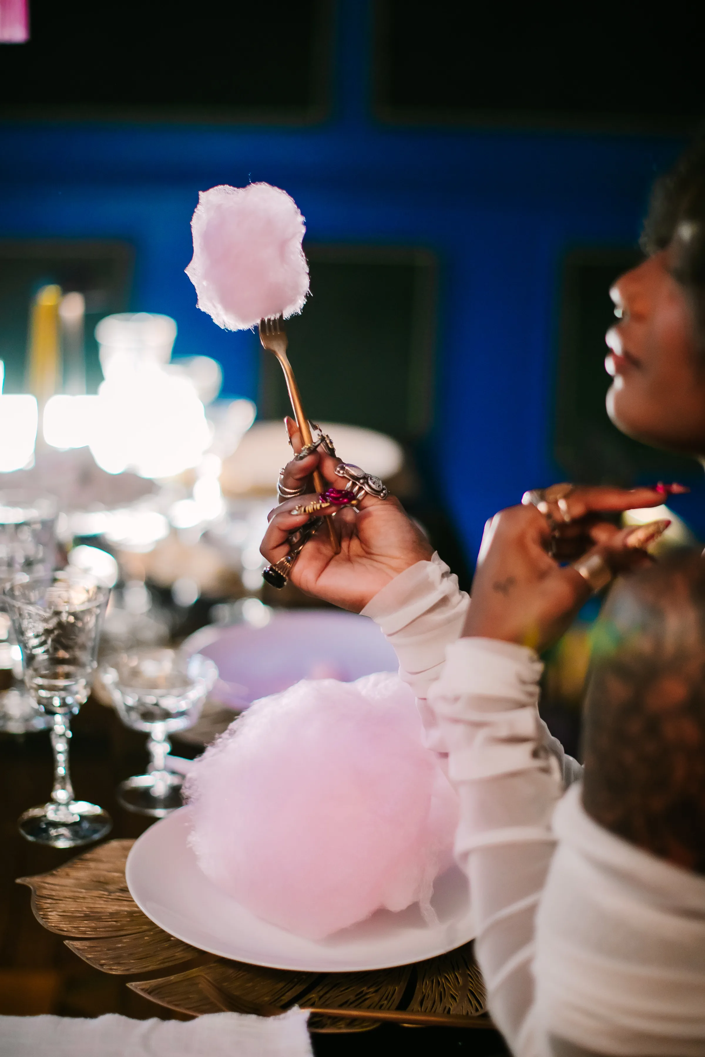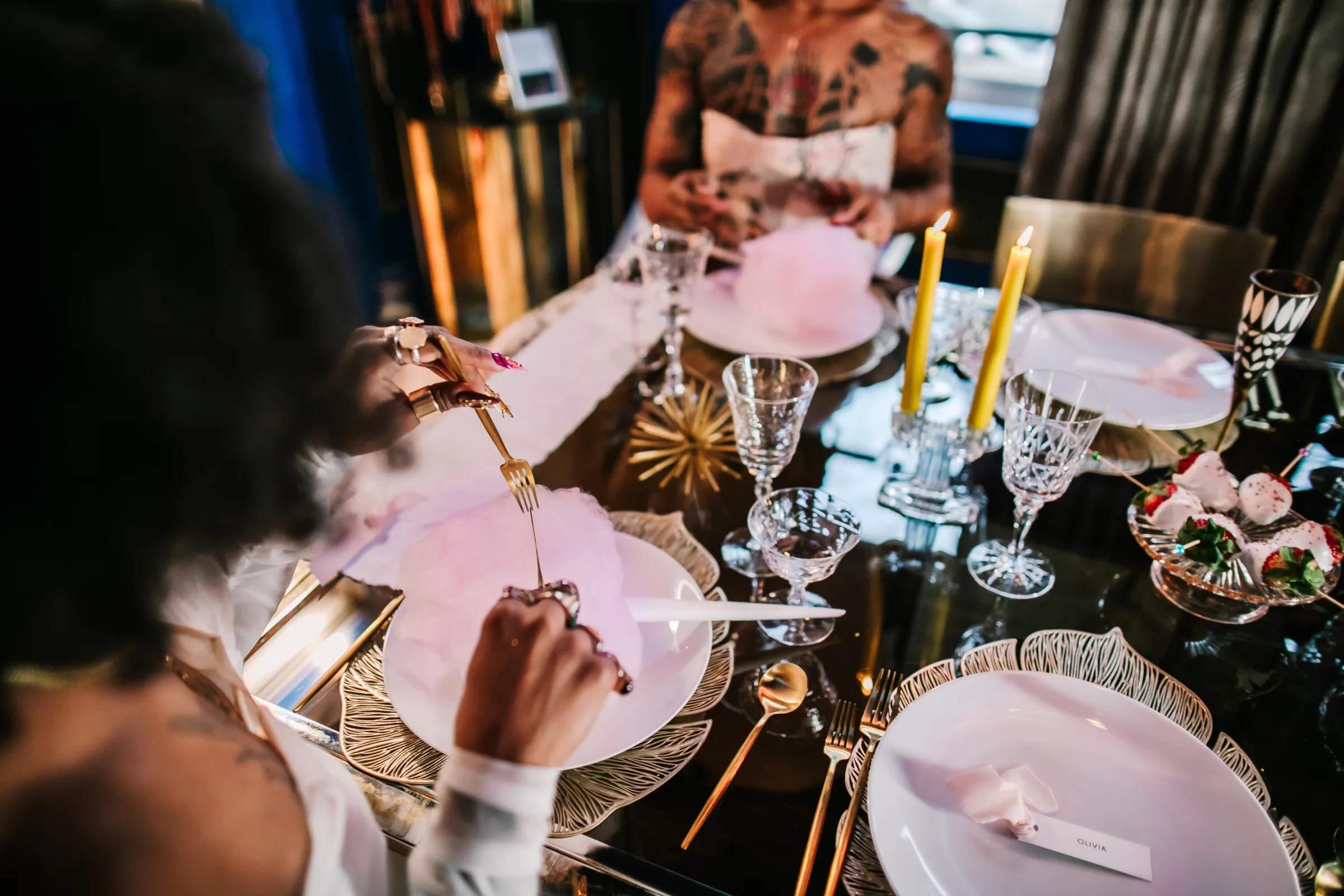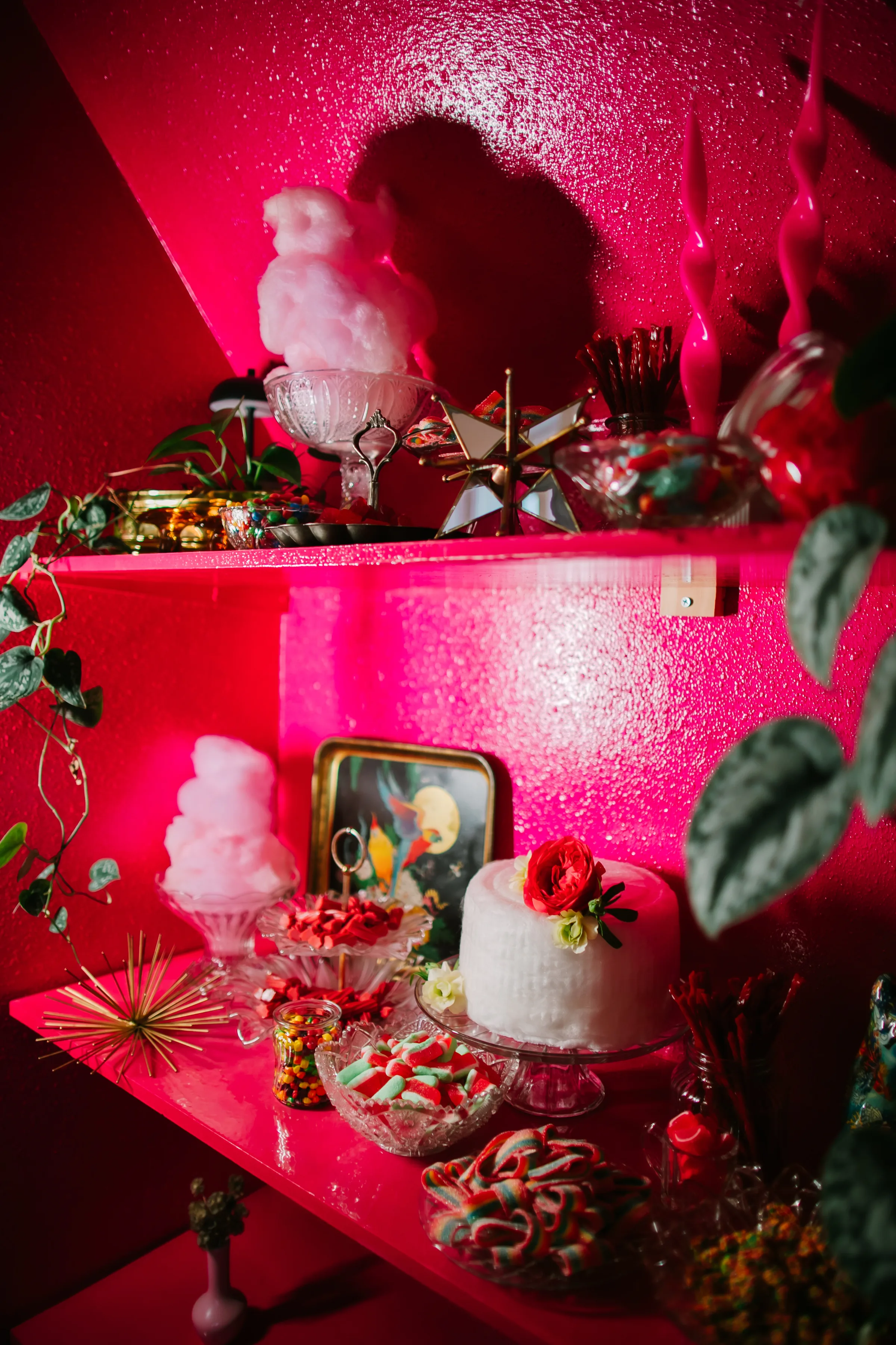 Textural details from Velvet Rentals elevated the setting with mirrored stars and starbursts, crystal glassware, matte-black table lamps, white dinner plates, and gold flatware. Gold leaf chargers, colored flute glasses, glowing candles, candy, and desserts by Happy Joy Hospitality, along with a cutting cake from Madison Sourdough, brought the entire look together with flair.