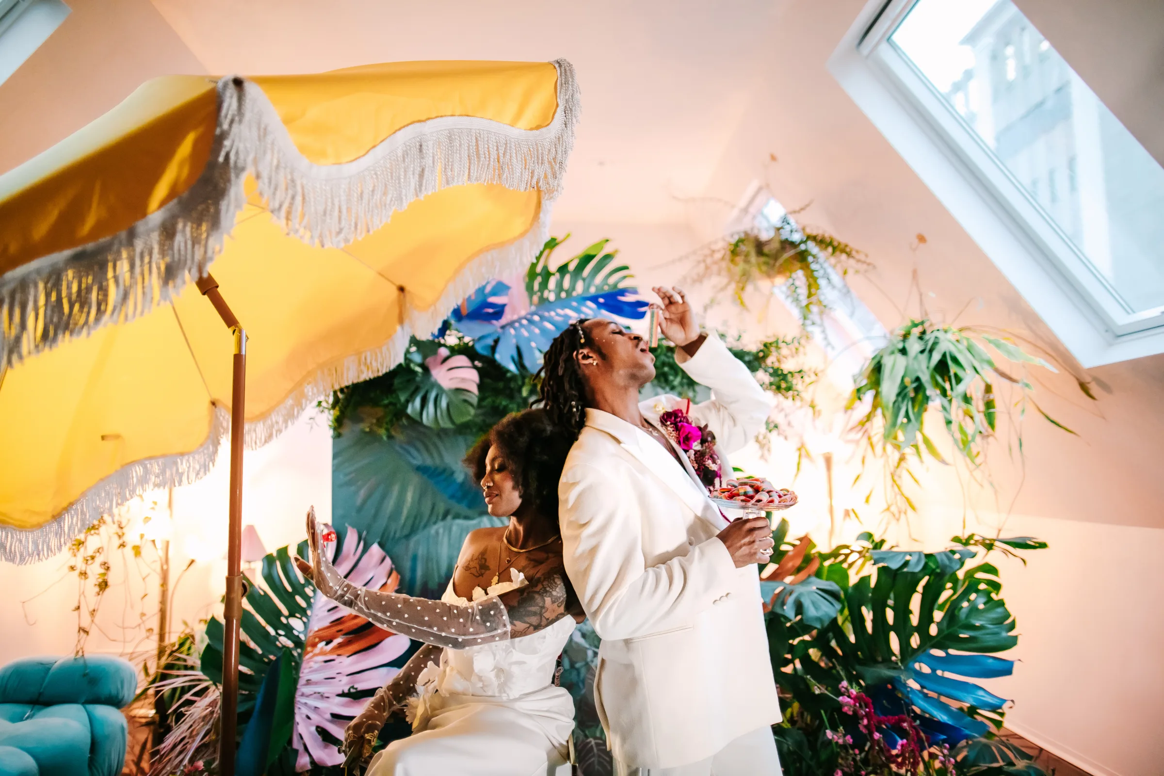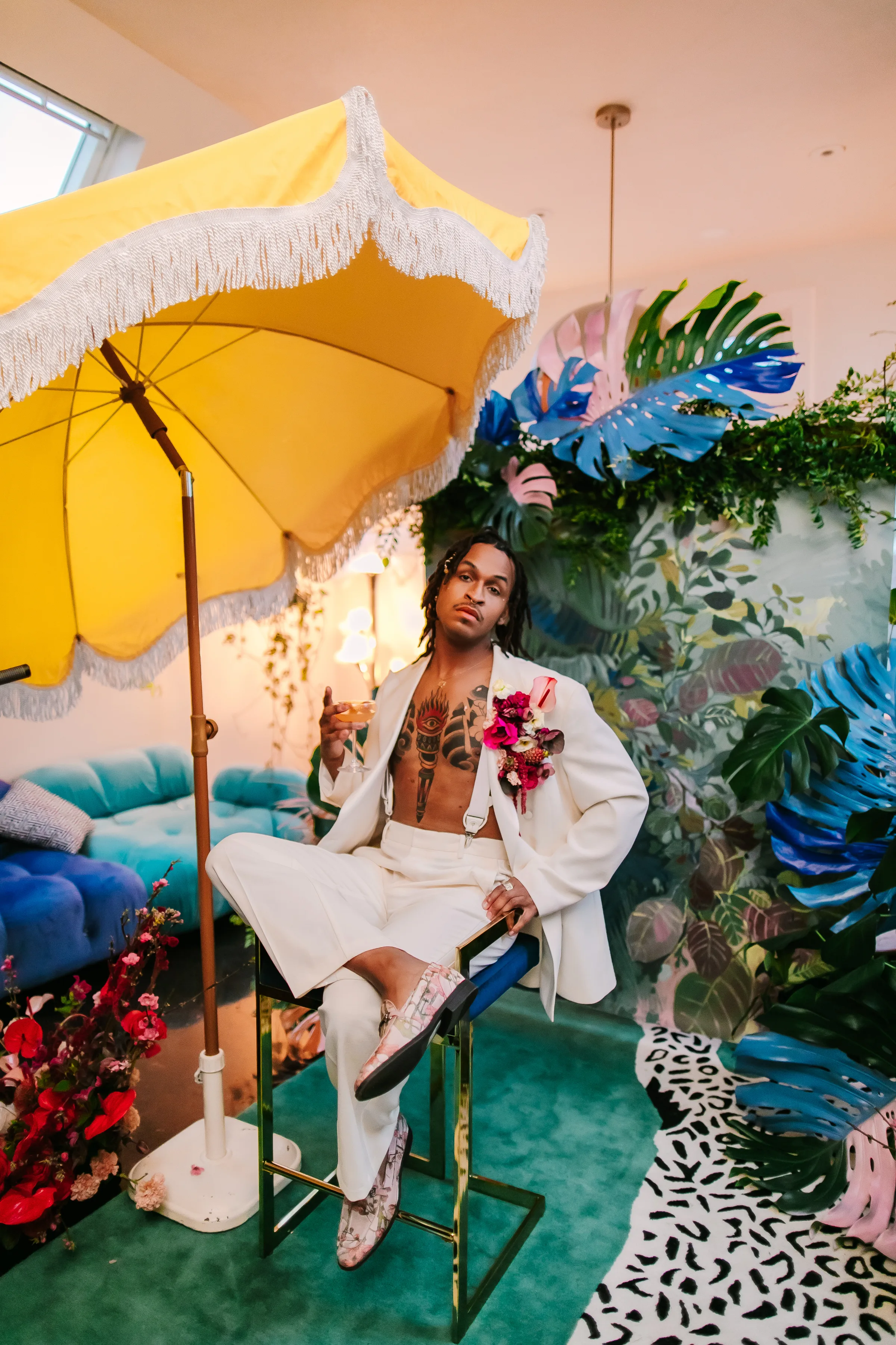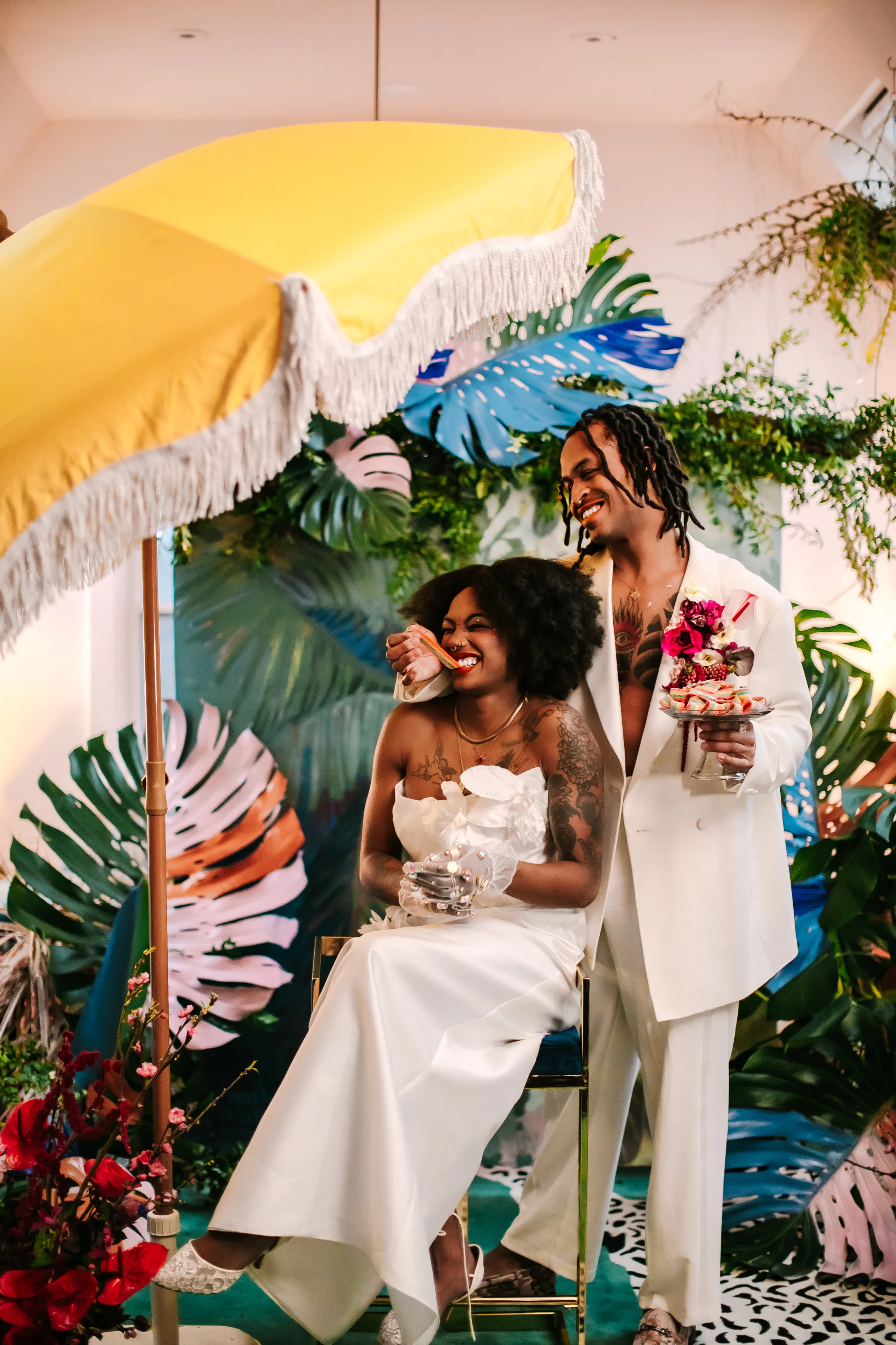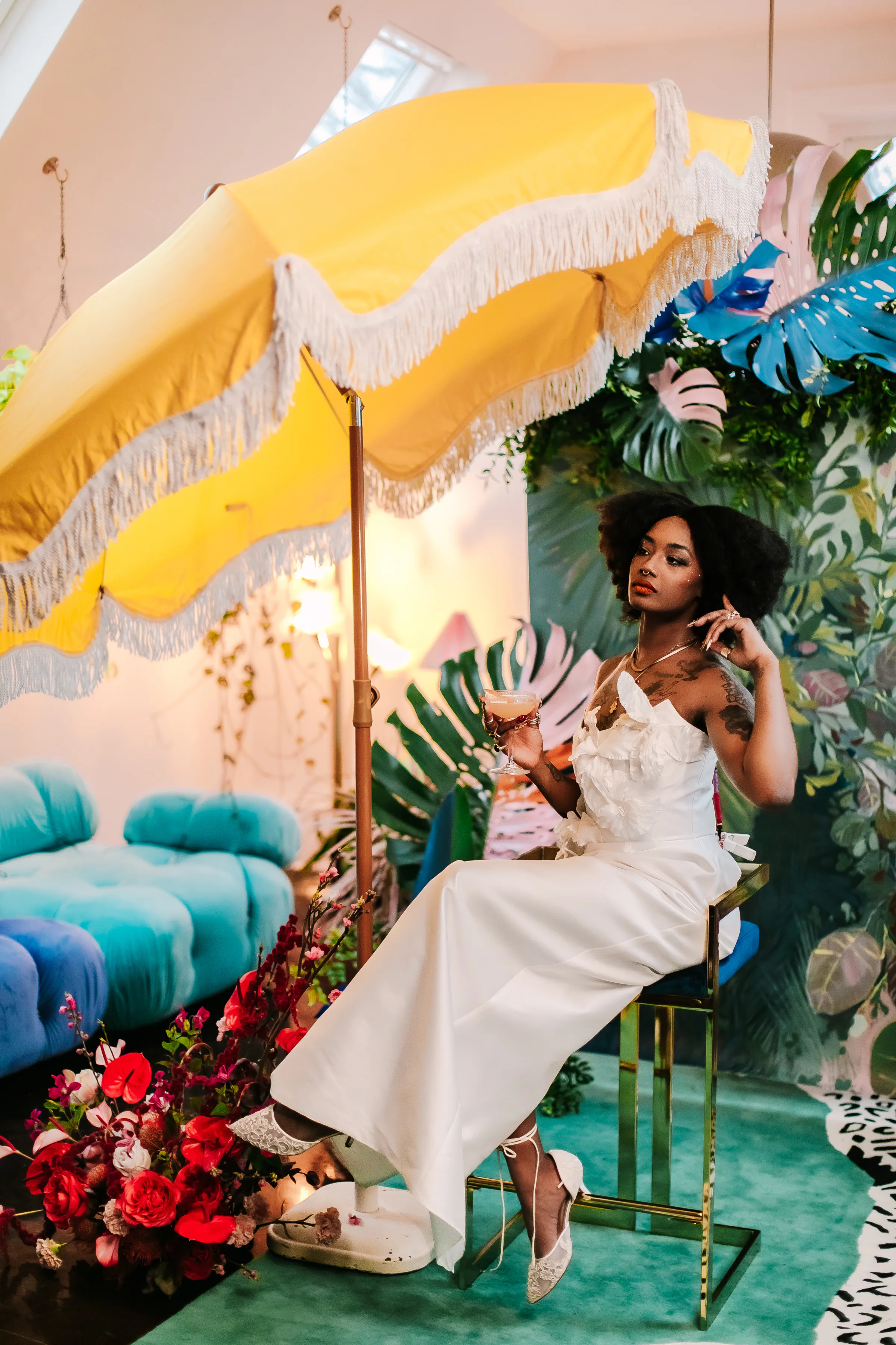 The couple debuted a second look alongside artful cocktails from Nomadic Beverage Co., then headed back to the tropical setting for portraits beneath a yellow tasseled umbrella.