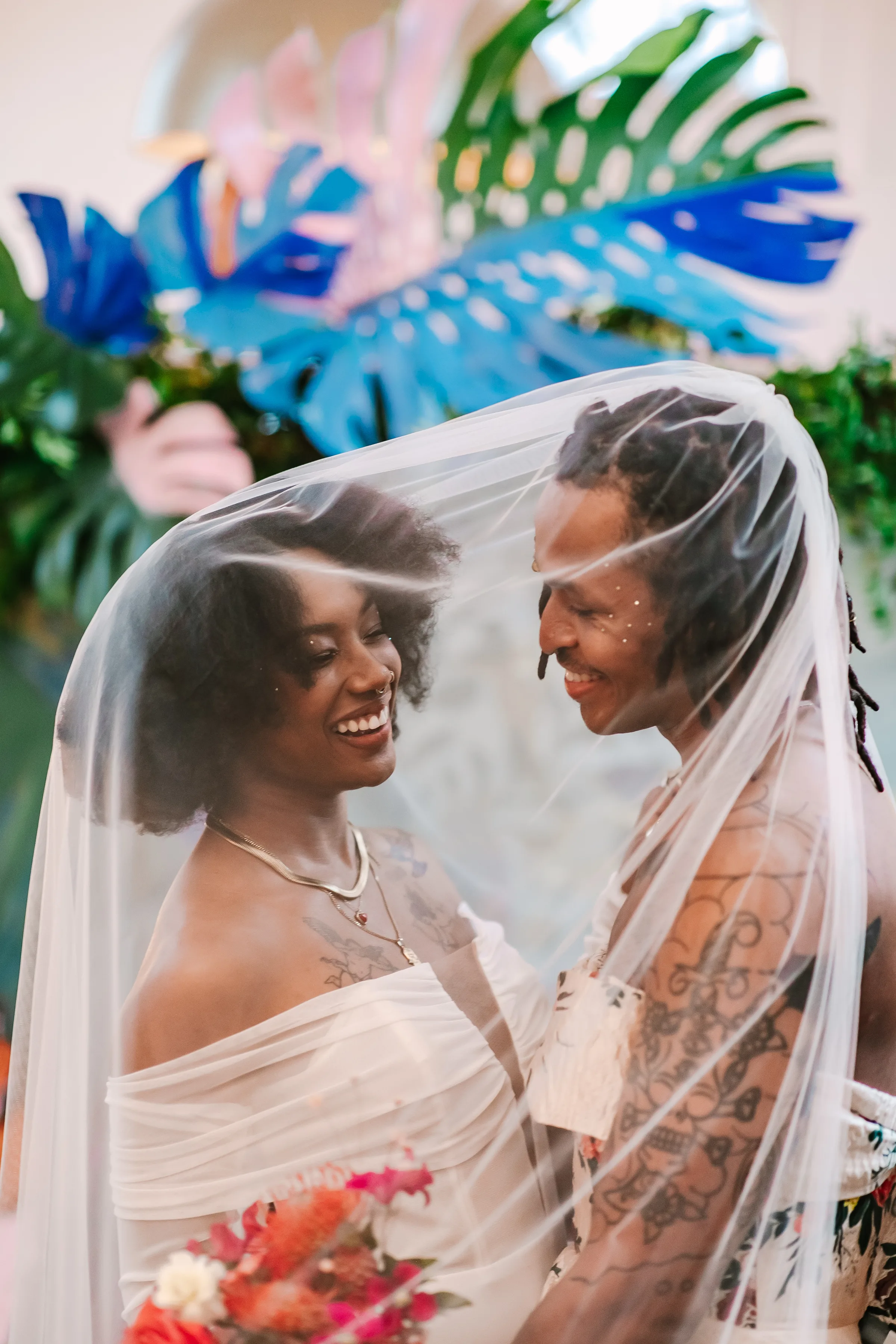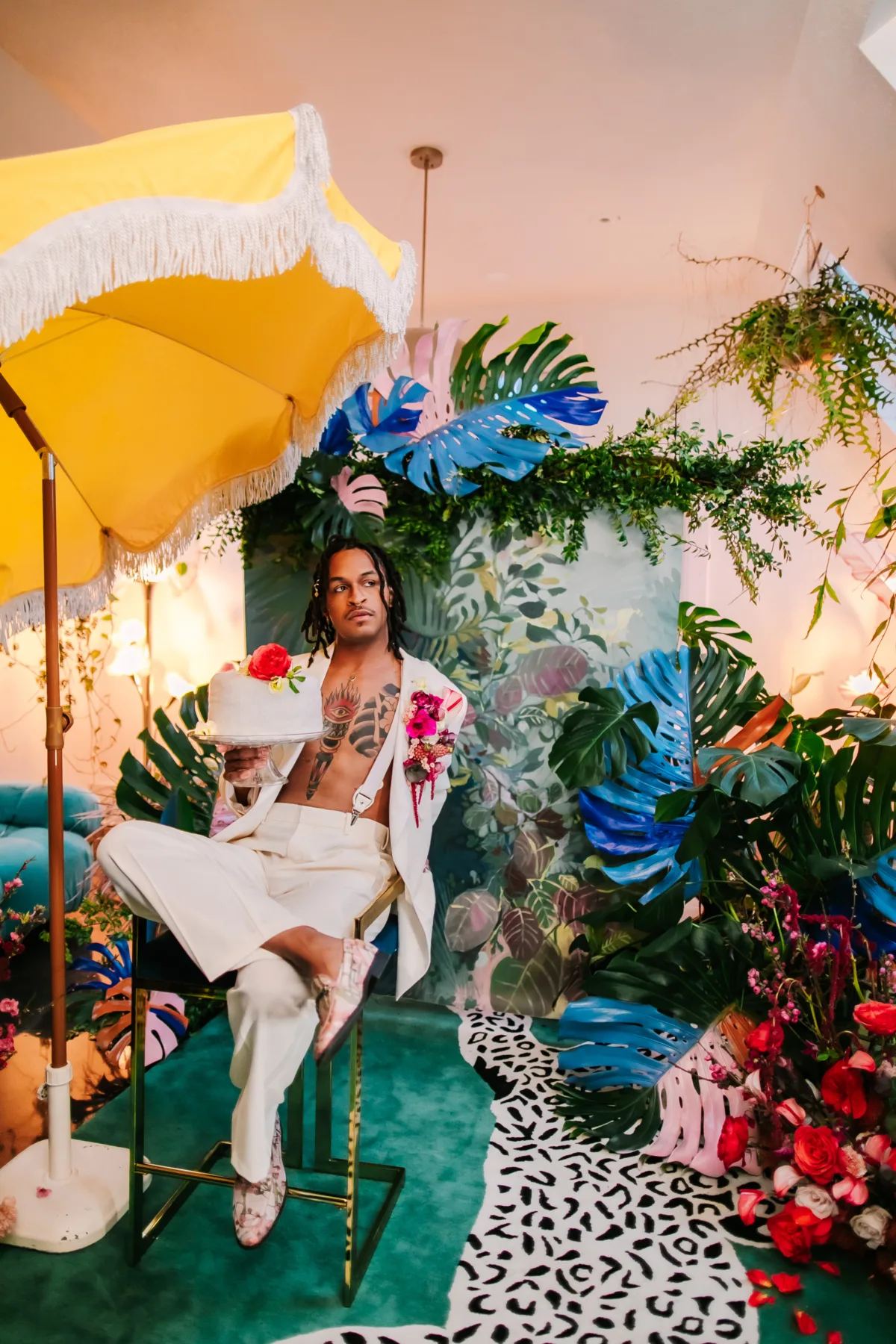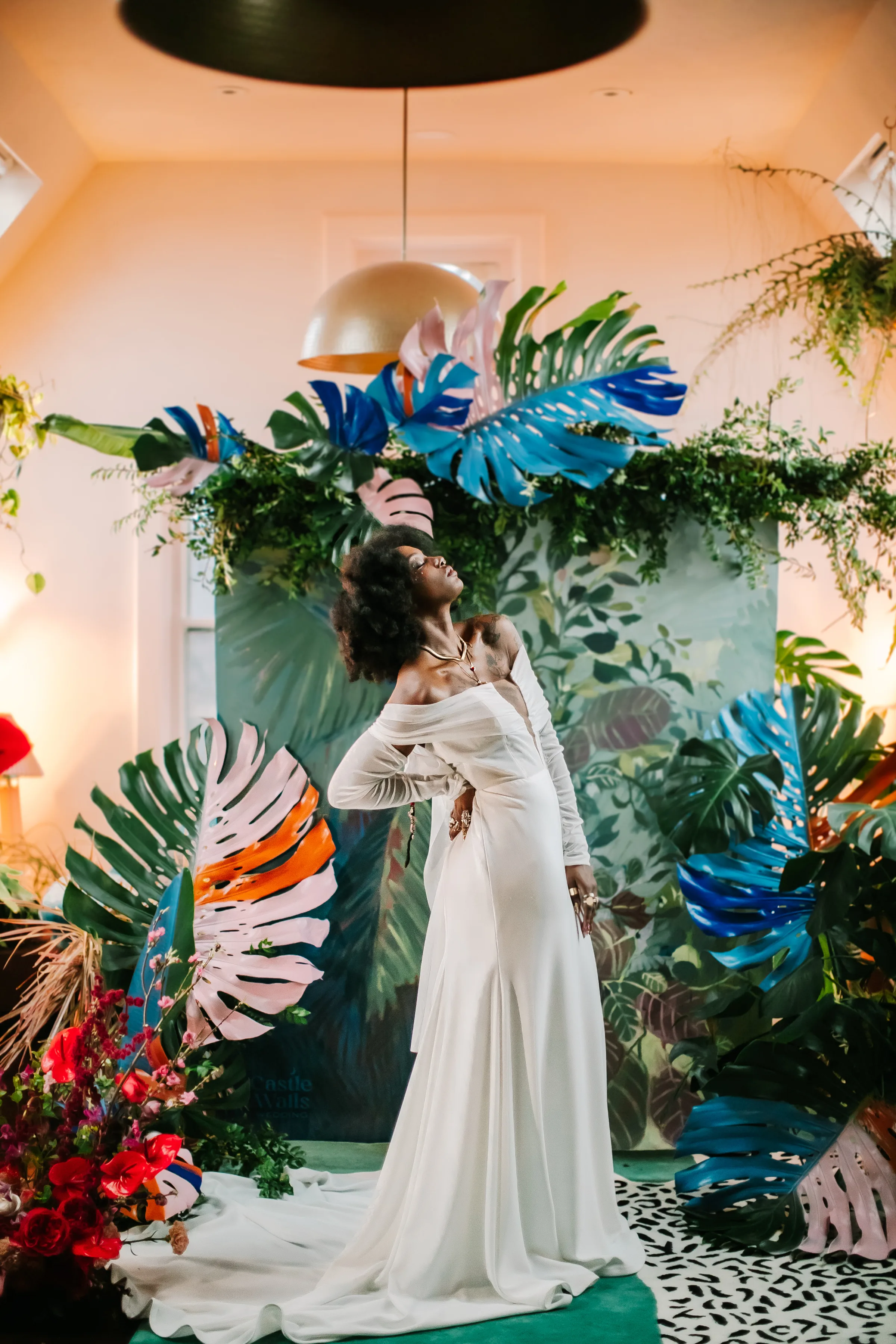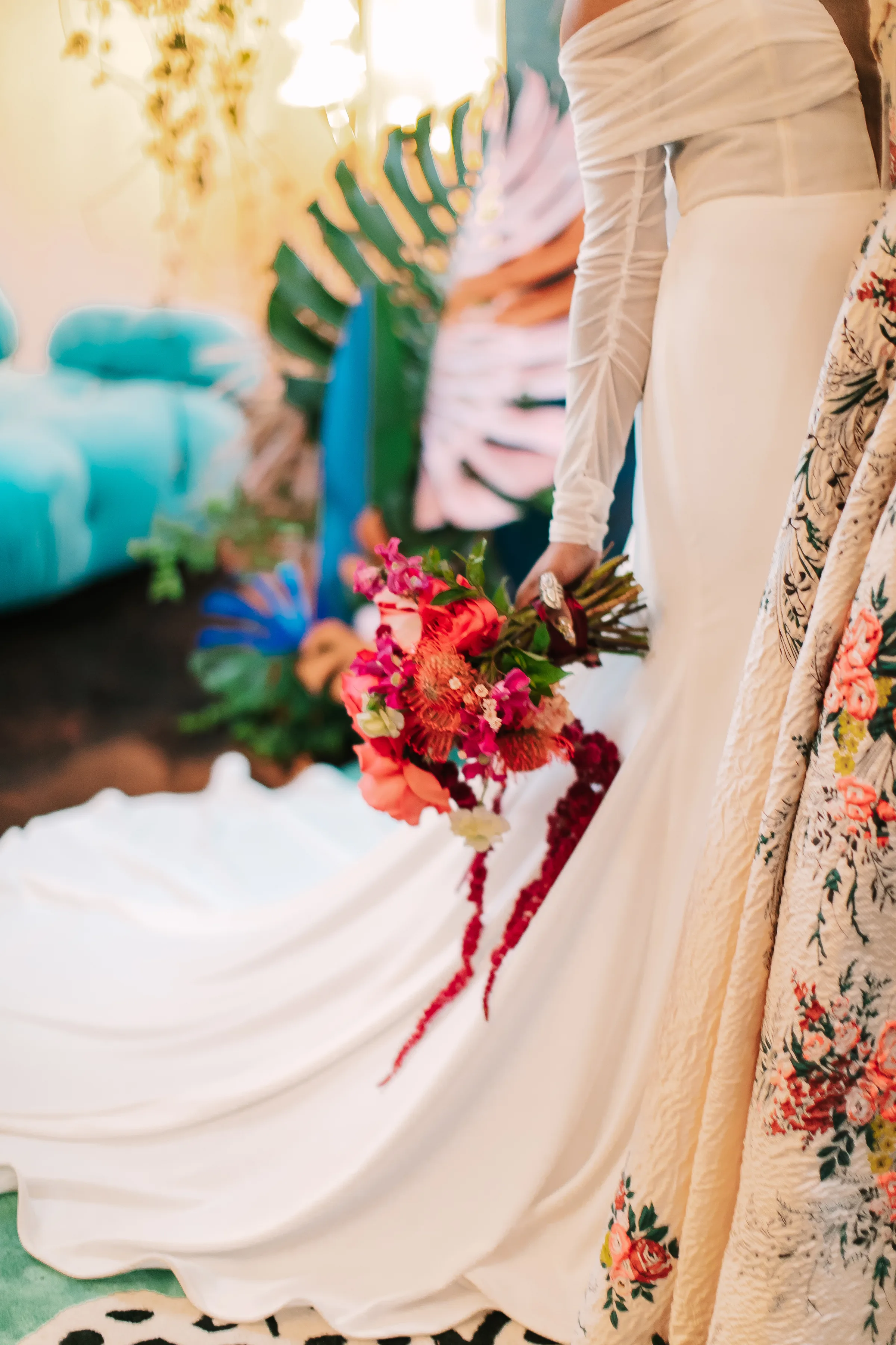 The couple debuted a second look alongside artful cocktails from Nomadic Beverage Co., then headed back to the tropical setting for portraits beneath a yellow tasseled umbrella.