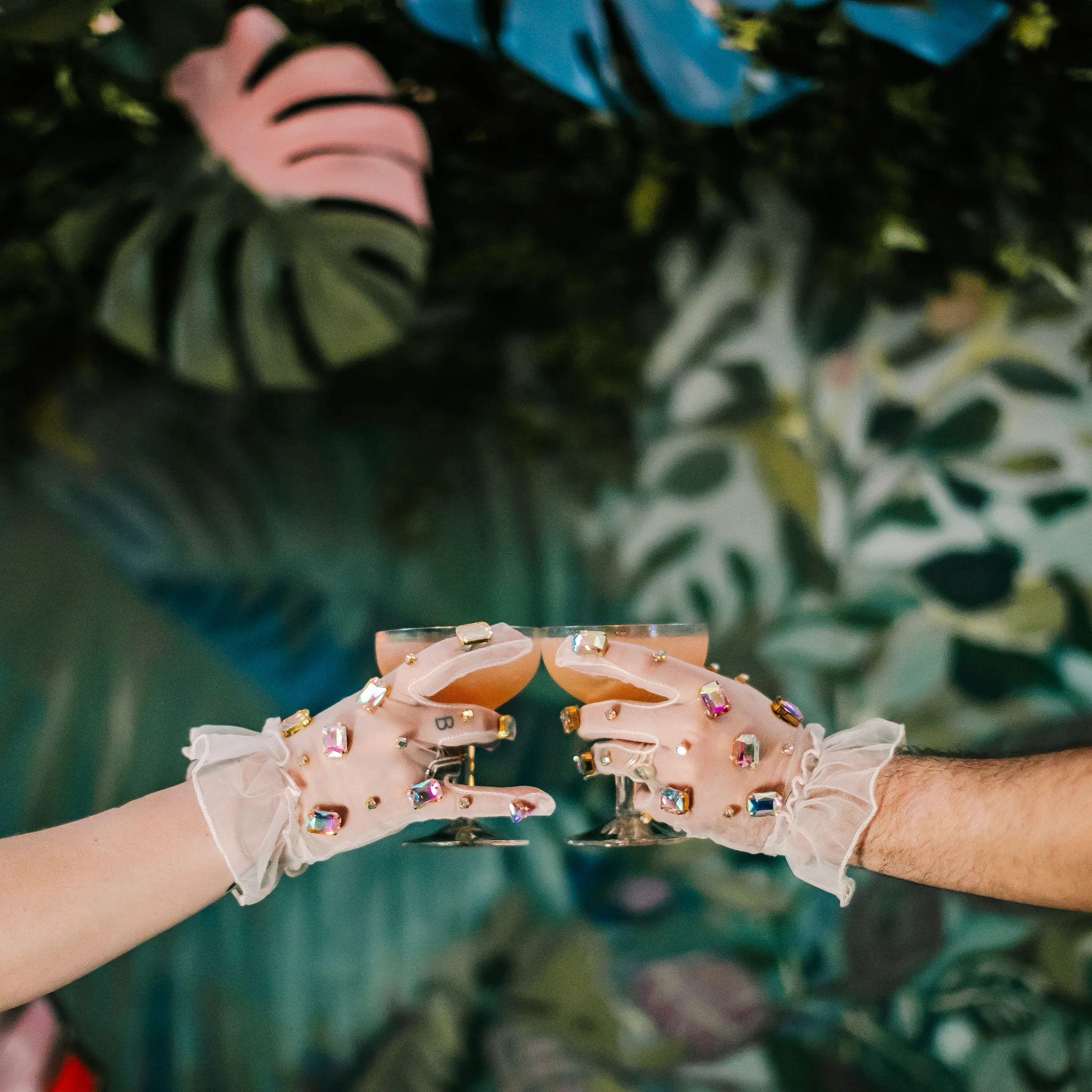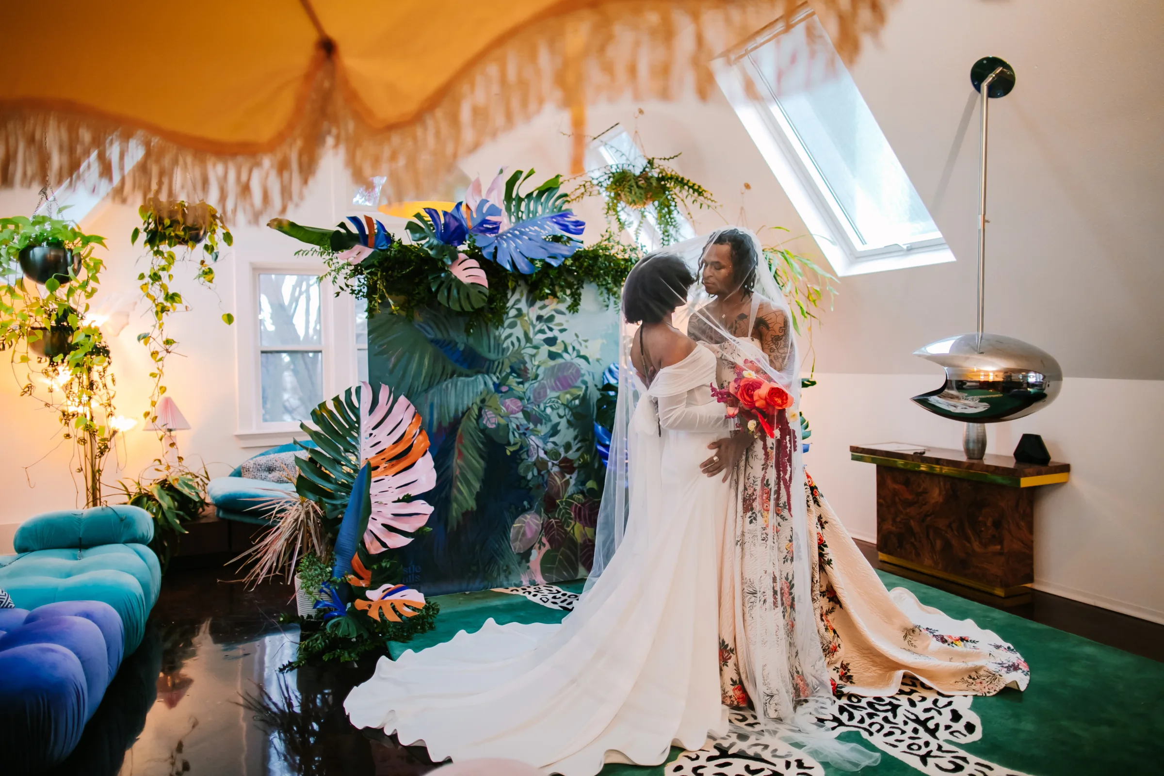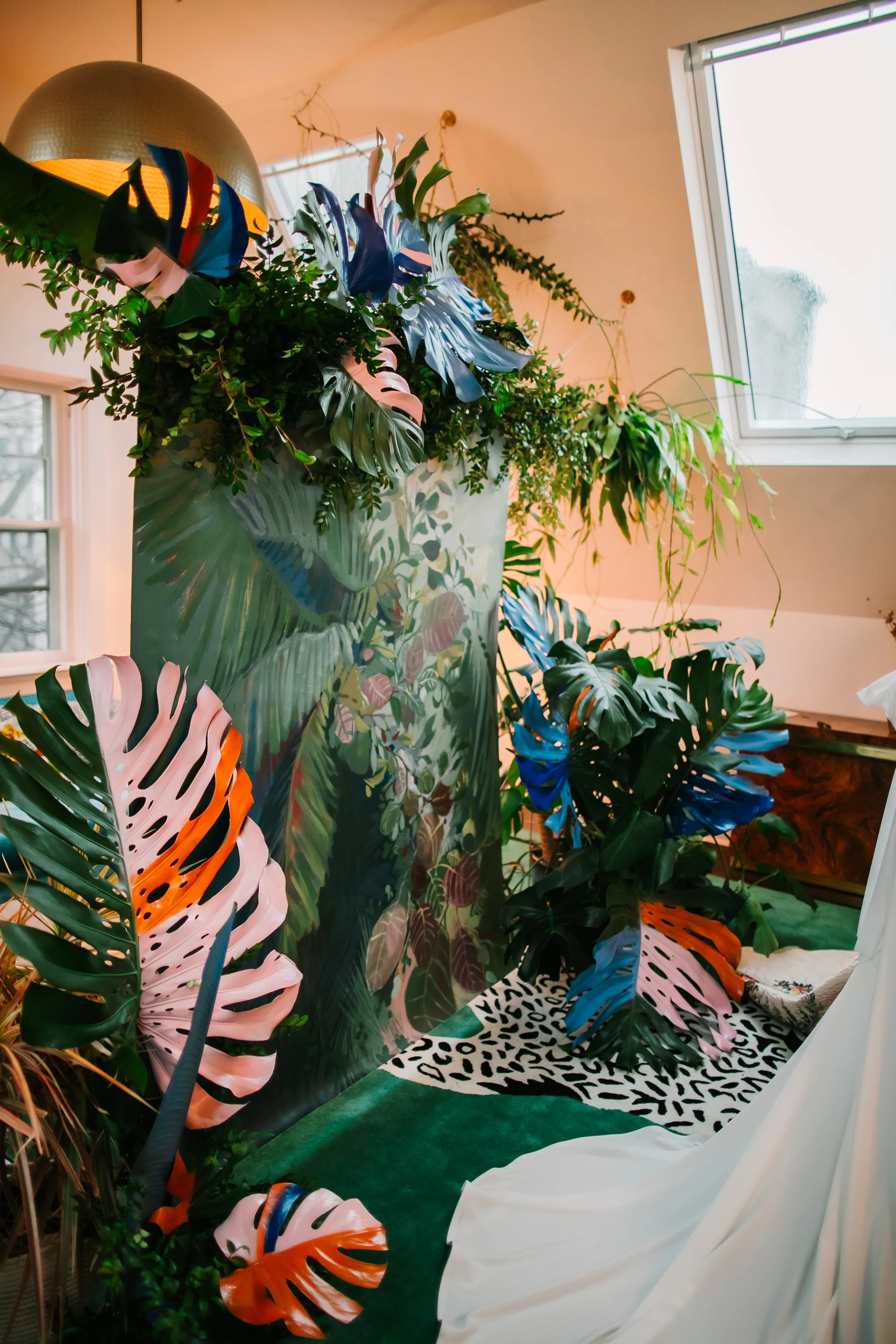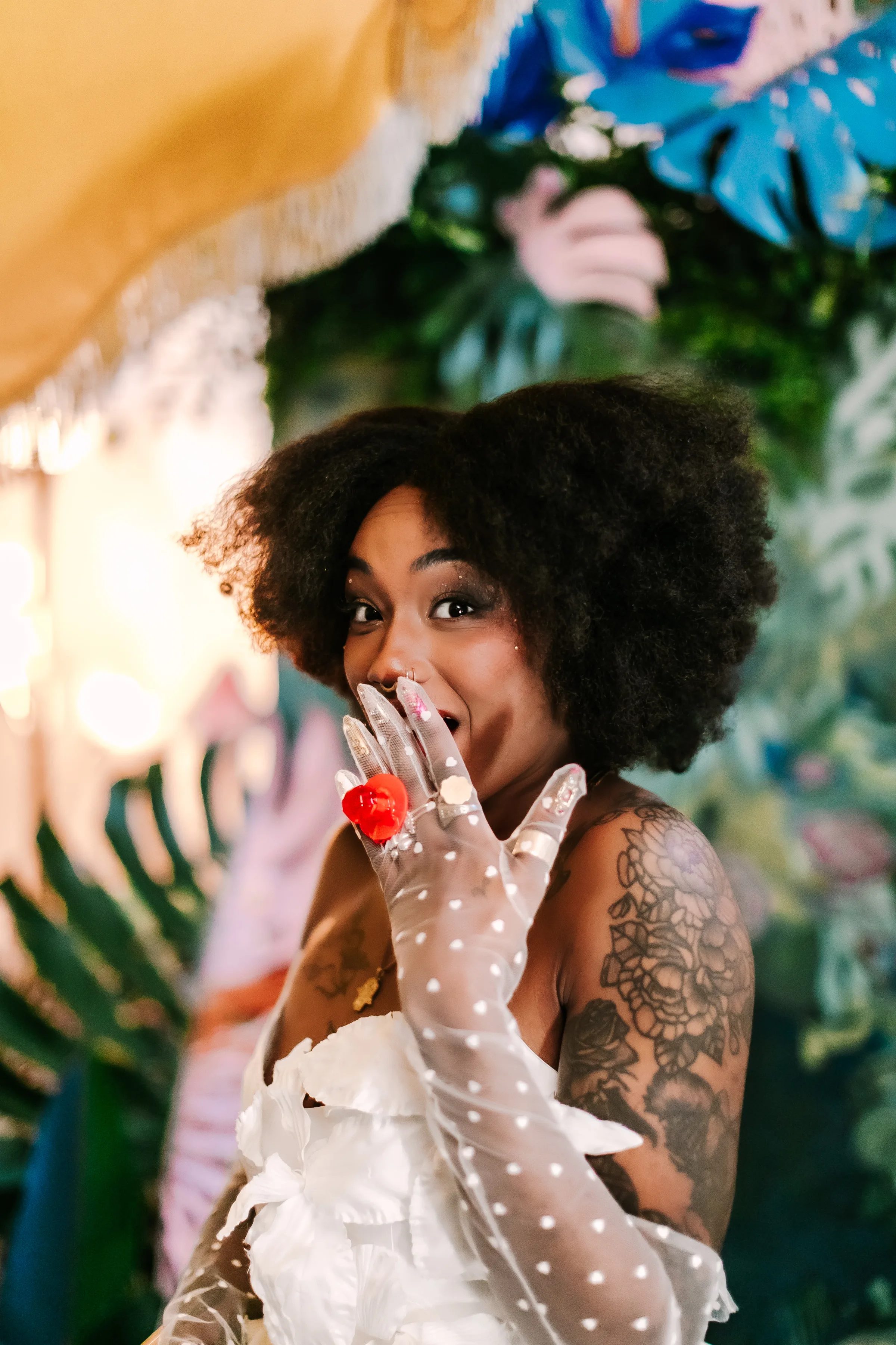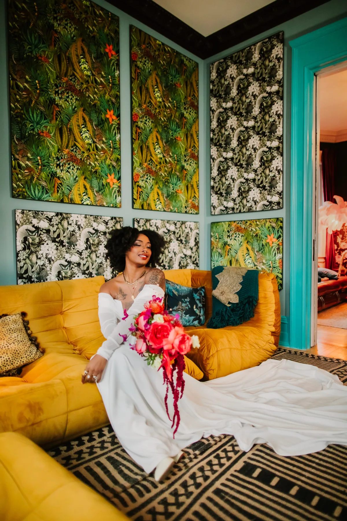 The couple debuted a second look alongside artful cocktails from Nomadic Beverage Co., then headed back to the tropical setting for portraits beneath a yellow tasseled umbrella.