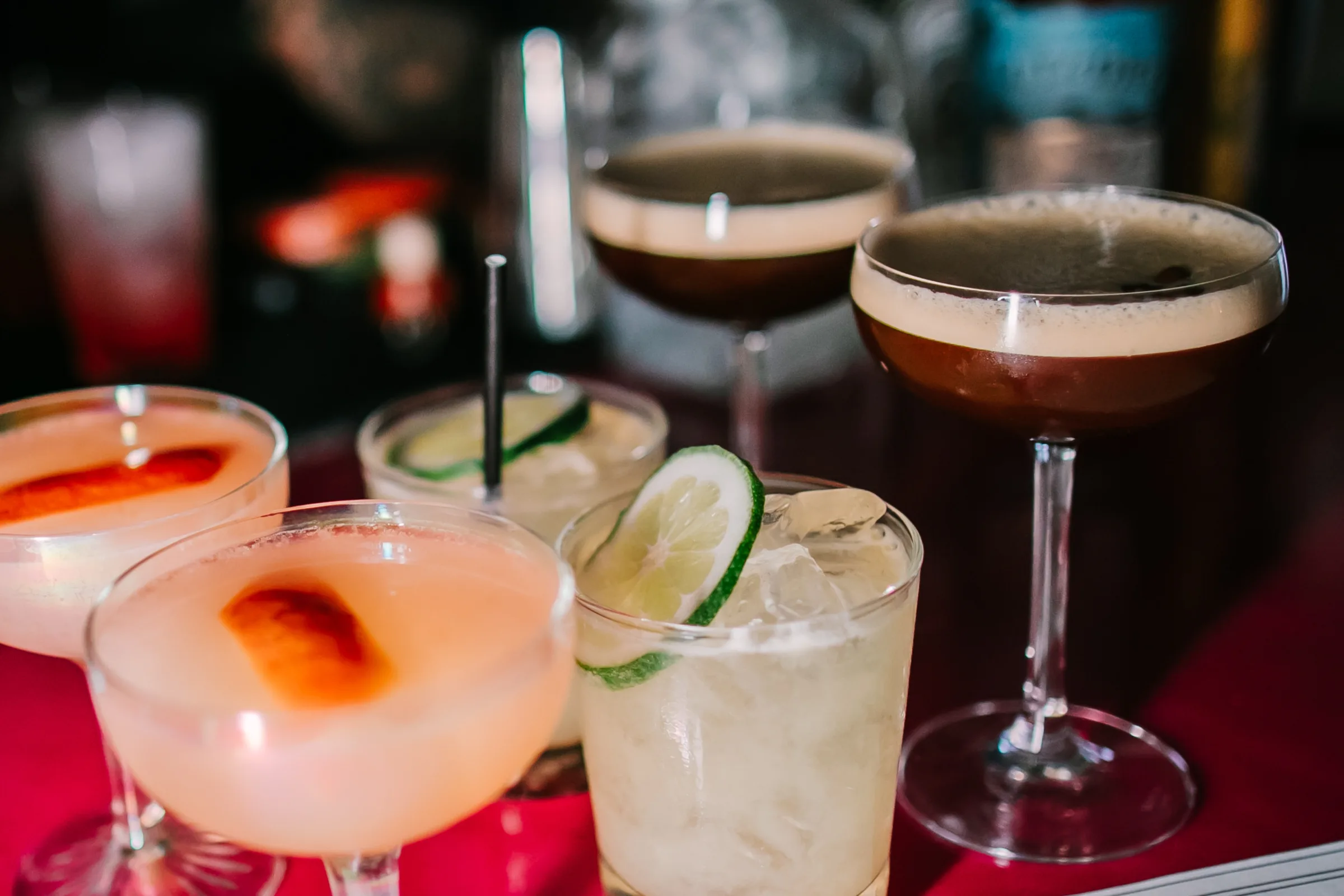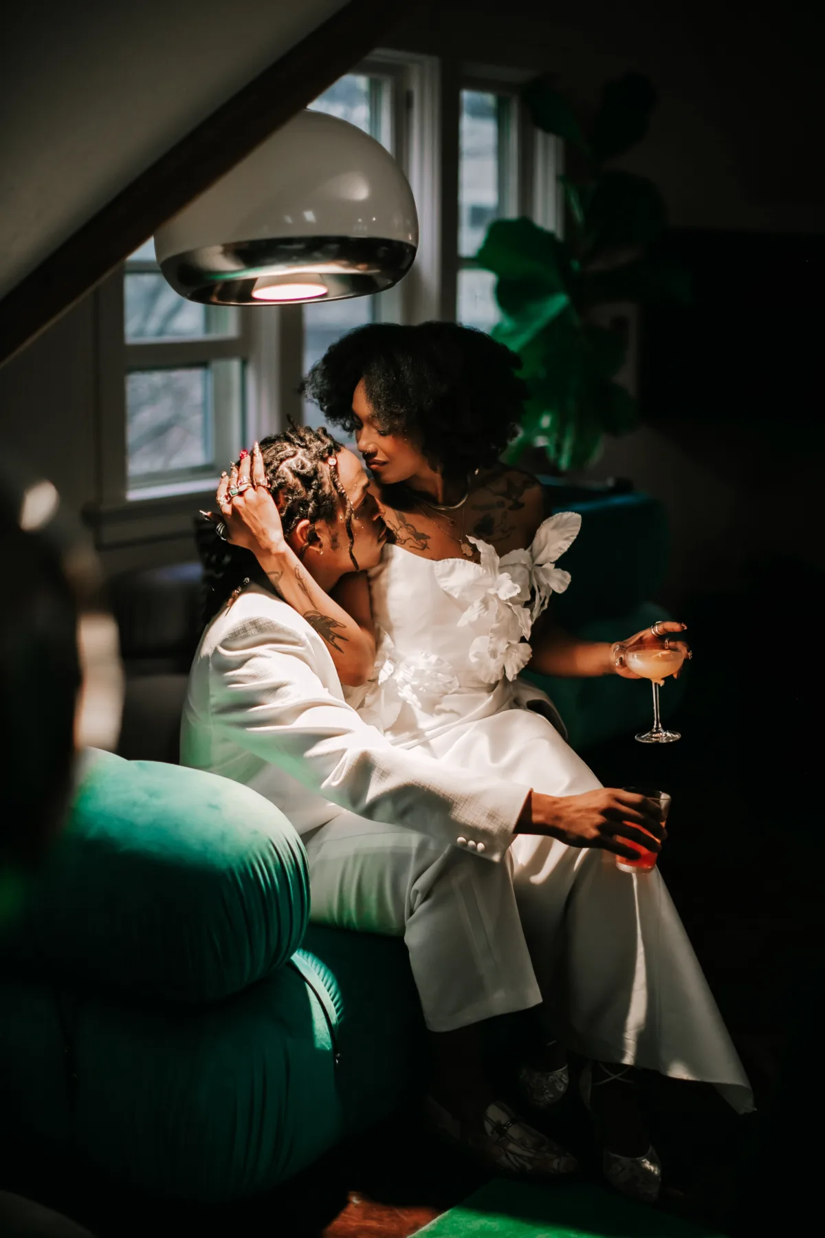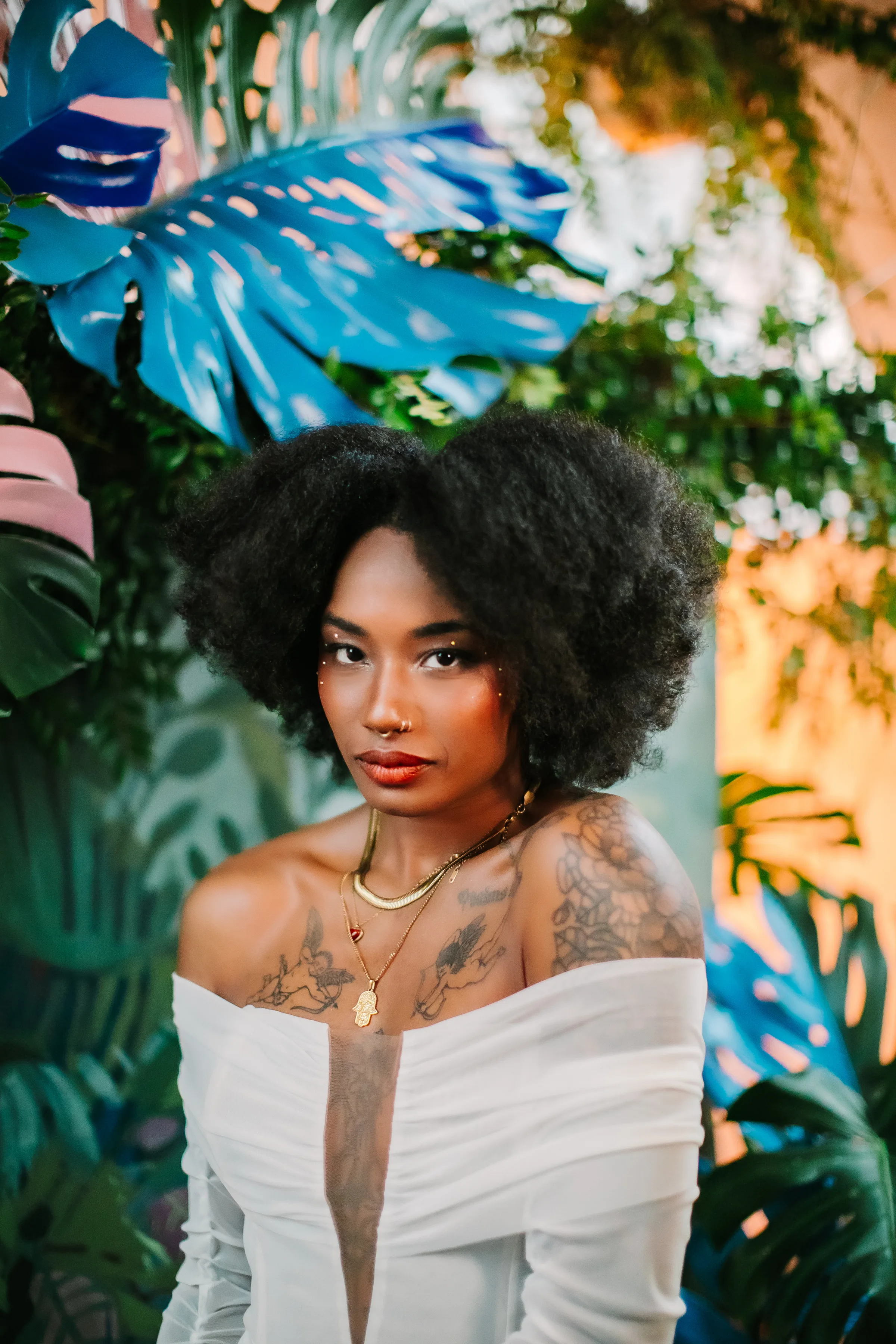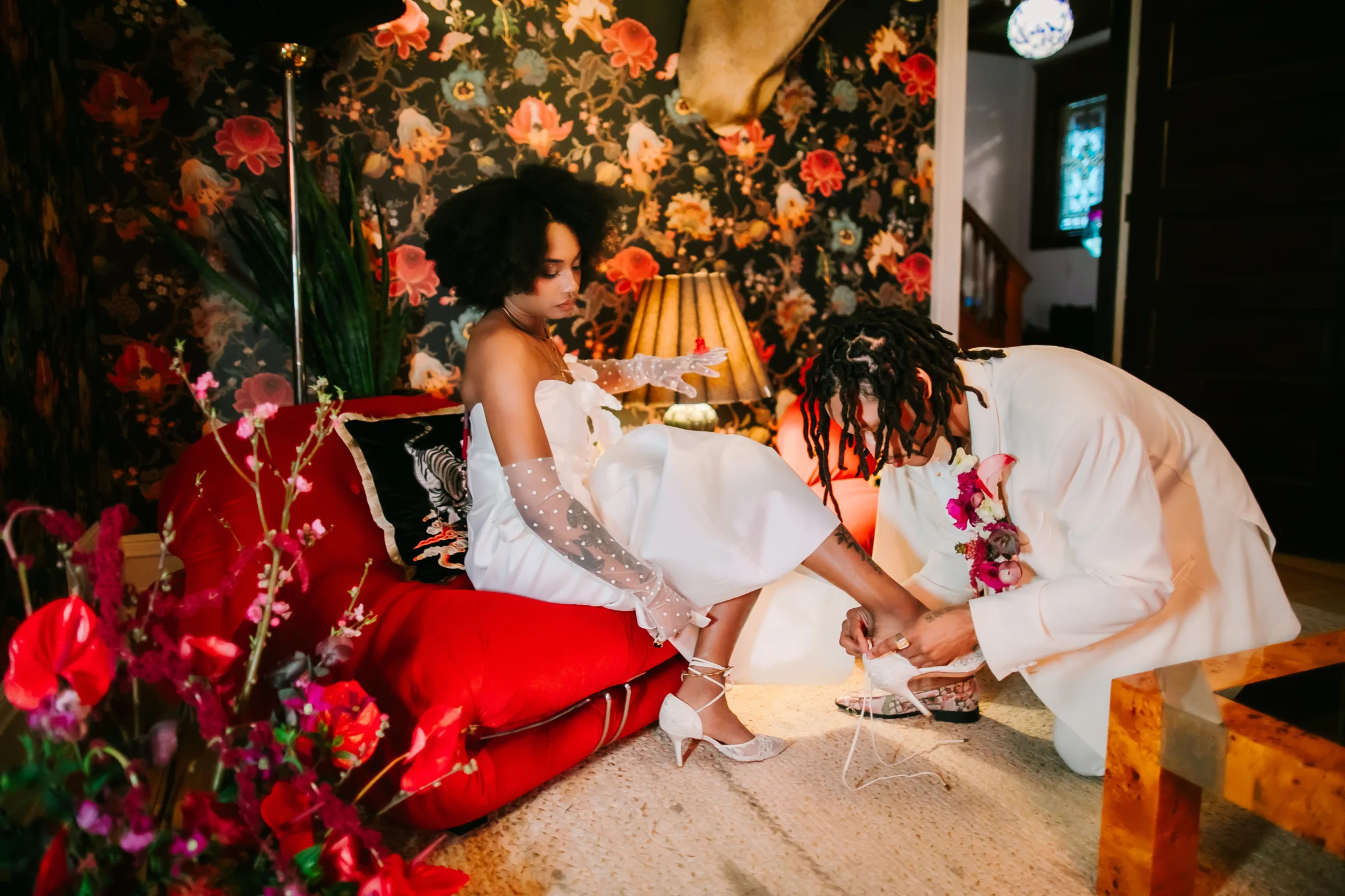 The couple debuted a second look alongside artful cocktails from Nomadic Beverage Co., then headed back to the tropical setting for portraits beneath a yellow tasseled umbrella.
