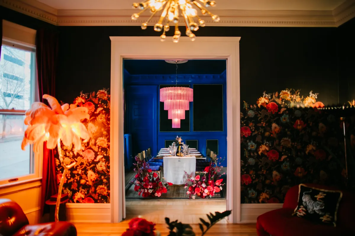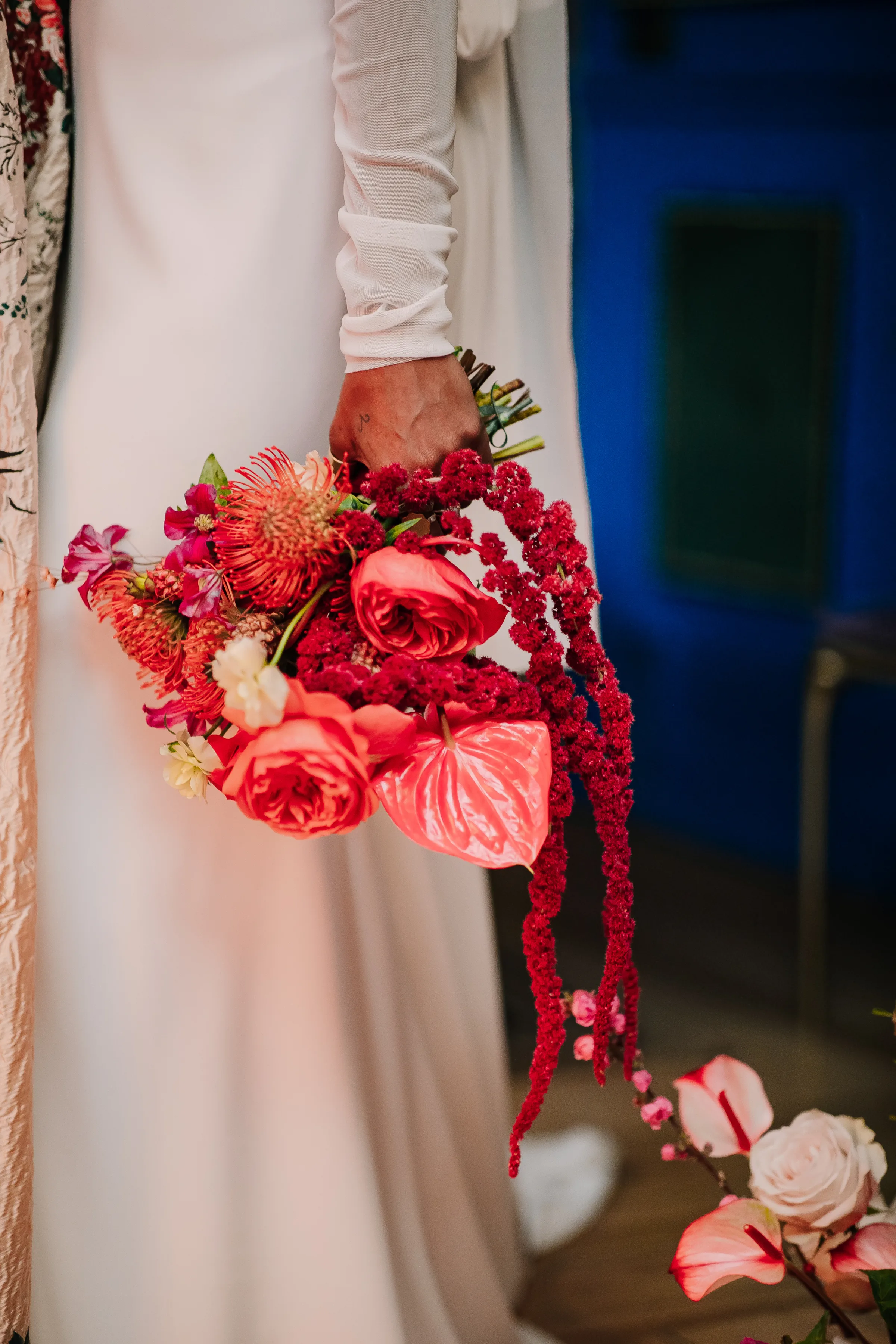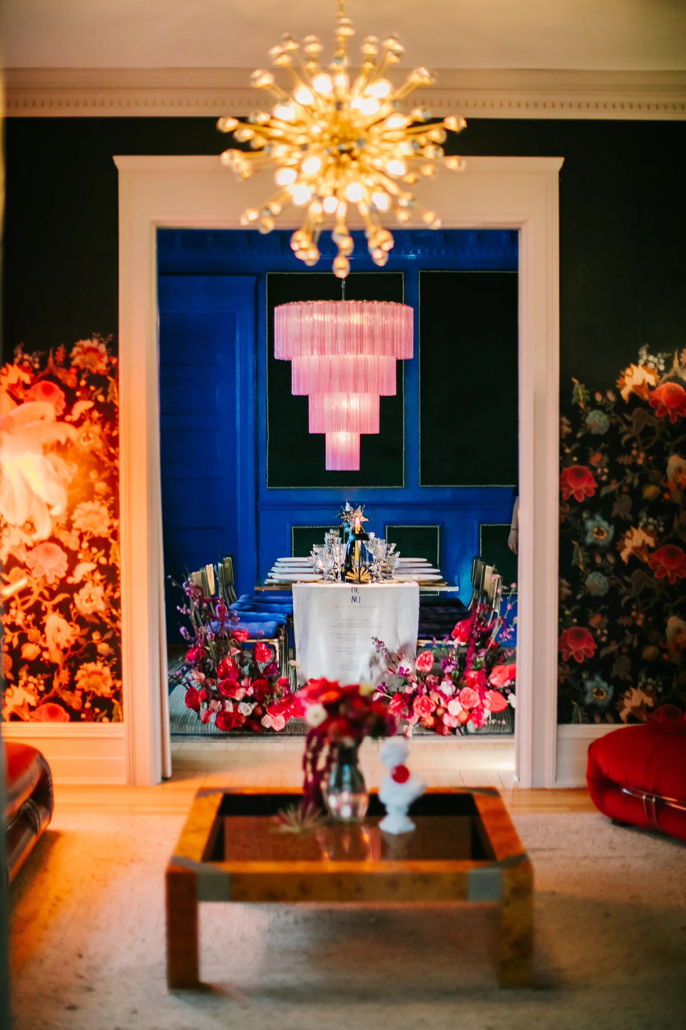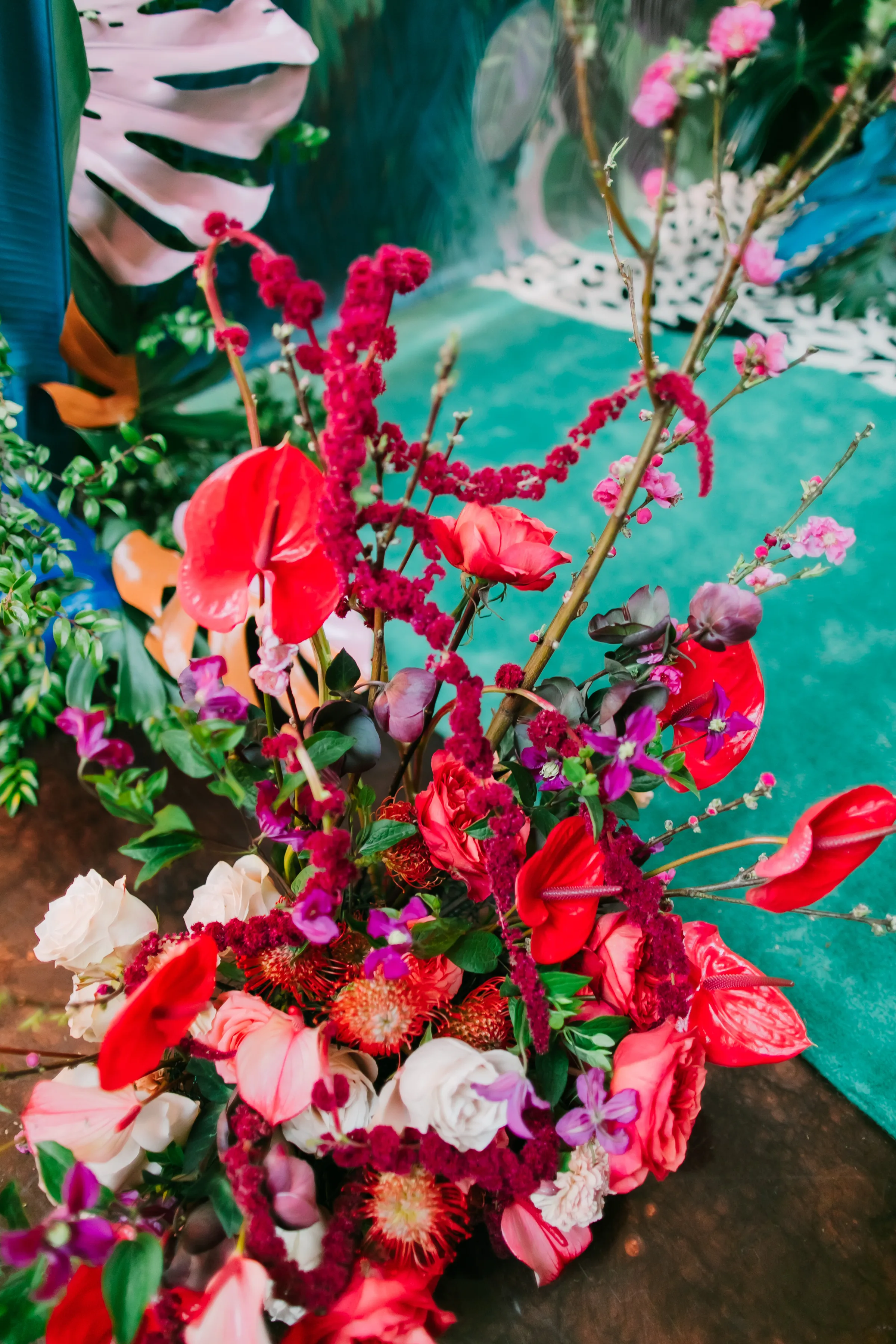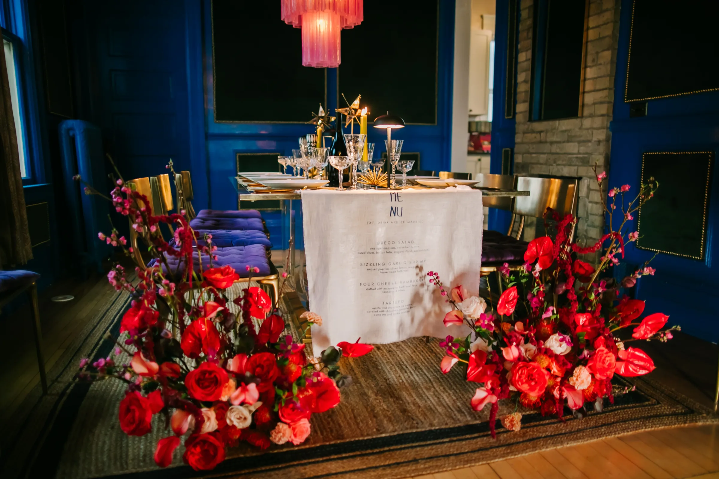 The tablescape came alive in saturated shades of red, blue, and gold. Lollipop Media Designs anchored the design with a draped linen table and thoughtfully styled menu, surrounded by lush arrangements from Unordinary Omen. Bold red, blush, and pink blooms—including roses, cascading amaranthus, anthuriums, lilies, pincushion protea, and cherry blossom branches—created a layered, lively piece.