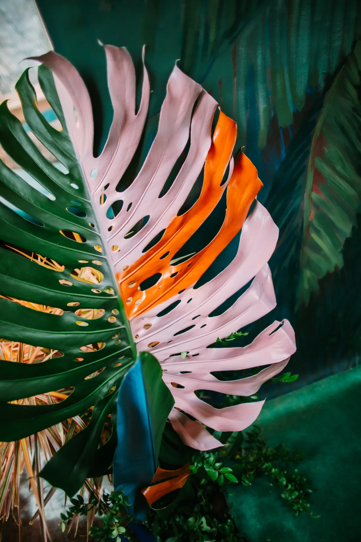 Miriam Events Co partnered with O&B Photo Co to bring the vision to life, with Miriam Events Co leading the design and O&B Photo Co documenting every detail. The opening scene unfolded before a tropical hand-painted backdrop by Castle Walls Wedding Decor, framed by vibrant florals and painted palm leaves from Unordinary Omen.