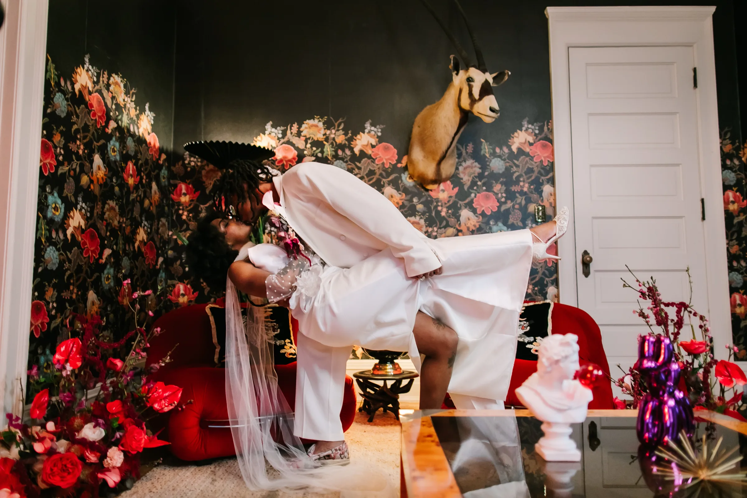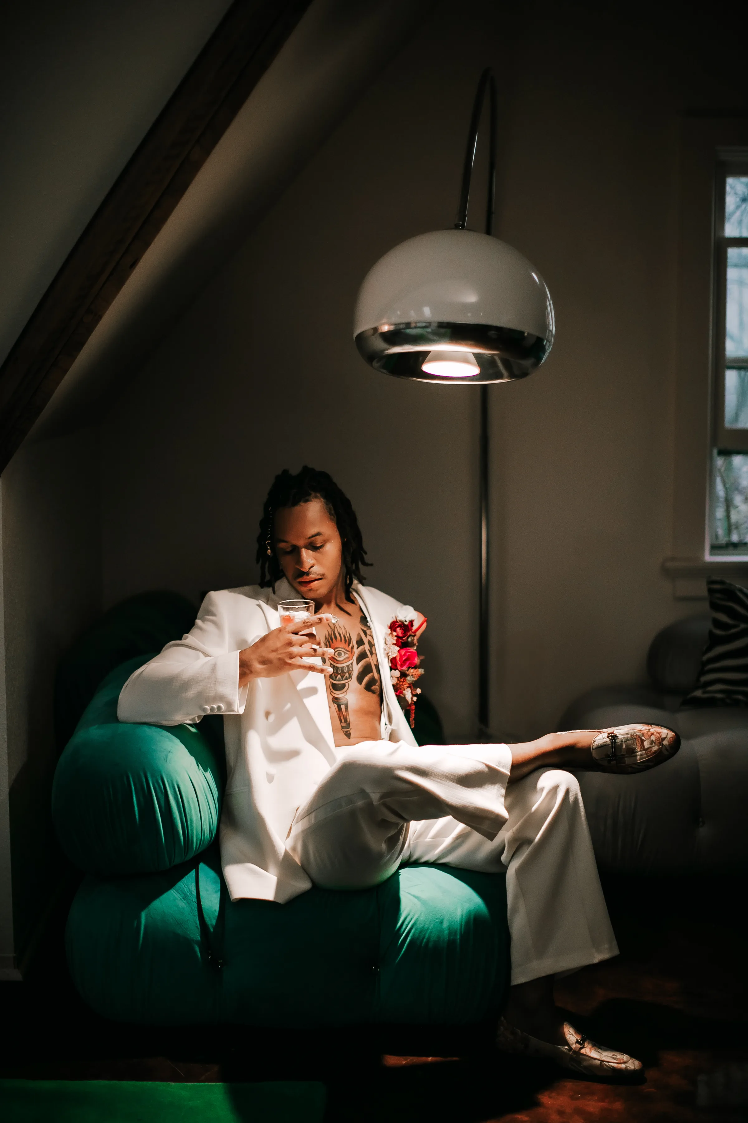 The groom’s second ensemble reimagined the traditional suit with an oversized jacket worn open and layered over bare skin, styled with crisp white trousers held by suspenders. A floral boutonniere and patterned dress shoes added vibrant, personality-filled pops of color to complete the look.