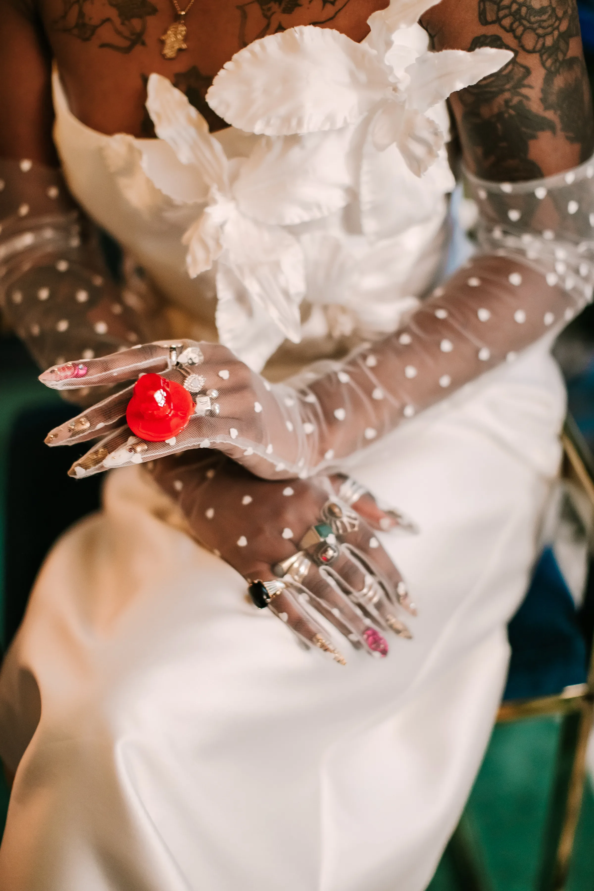 The bride wowed with sultry smoky eyes, luminous highlights, softly flushed cheeks, and a bold red lip from Lotus Artistry. Delicately placed rhinestones framed her eyes for a touch of drama, while custom press-on nails by Nair Fairy 414 and layers of gold jewelry added the perfect finishing details.