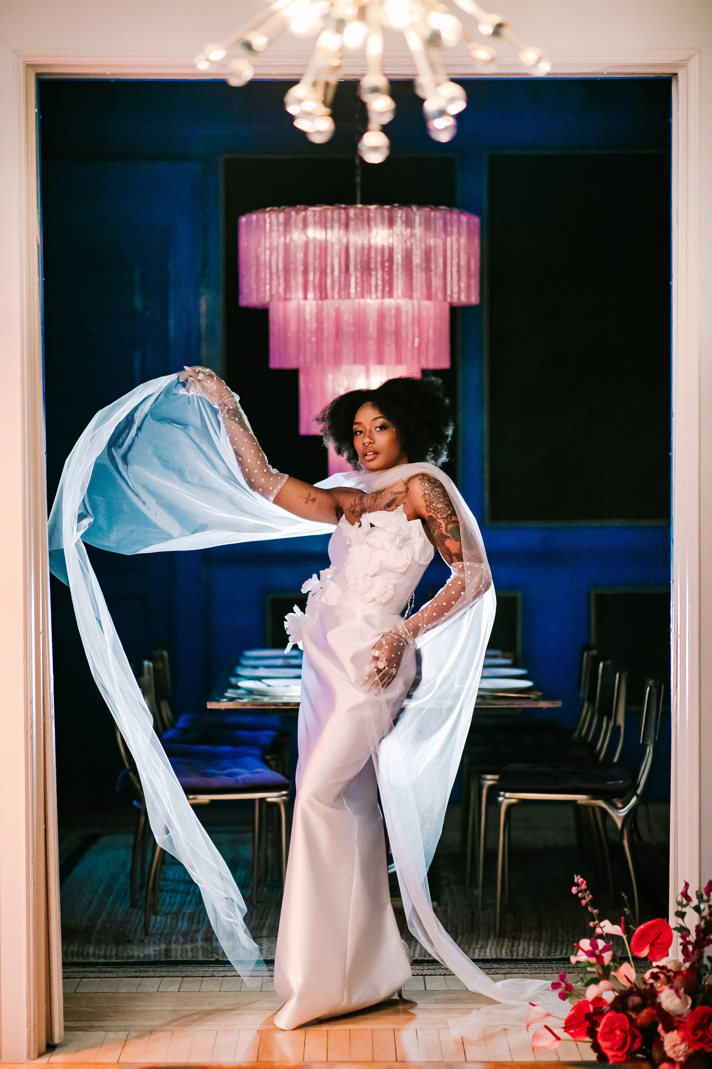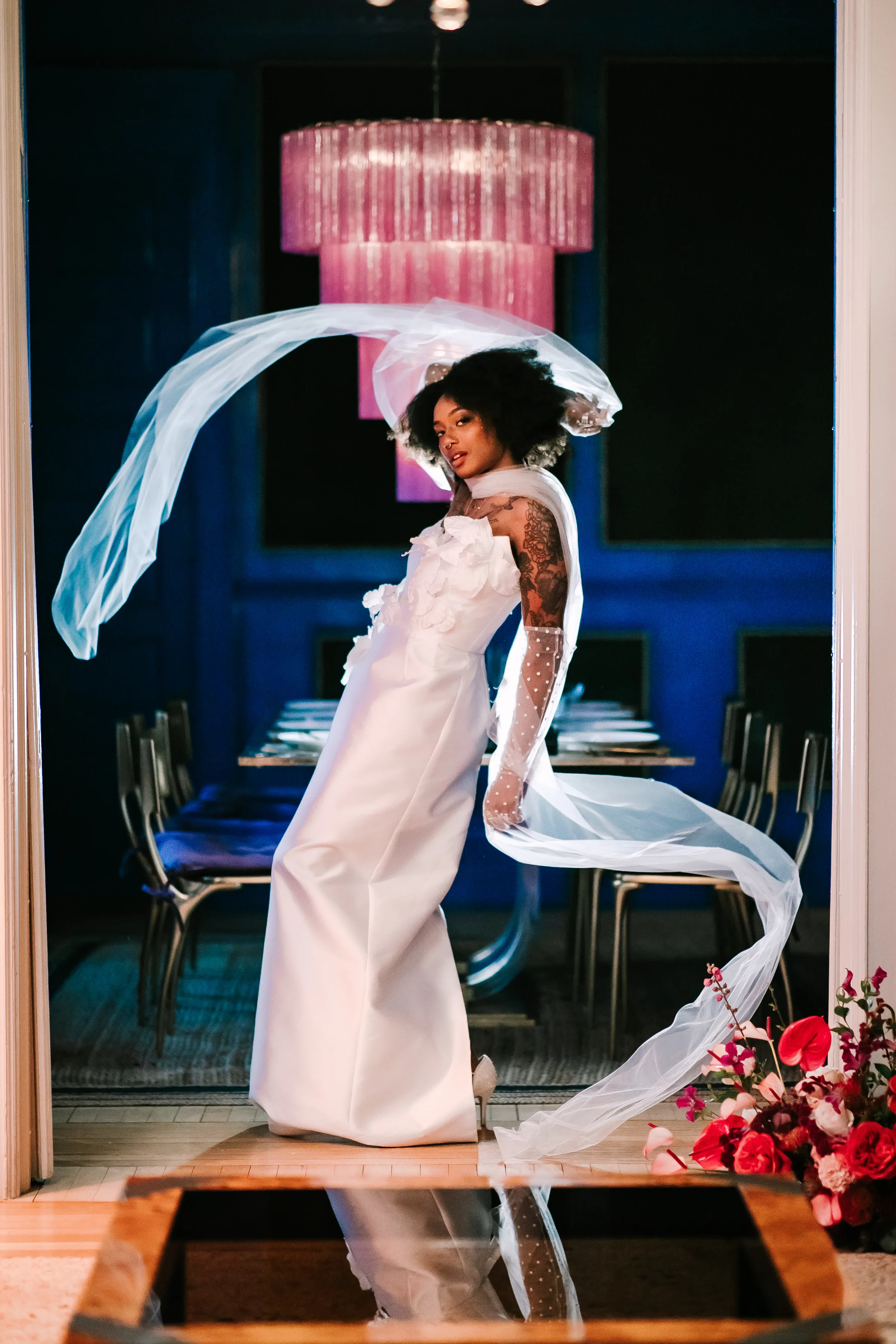 For her second look, the bride stepped into another standout gown from Strike Bridal Bar. This dress was a statuesque, strapless satin design featuring a chic cat-eye neckline and asymmetrical floral appliqués sweeping across the bodice. She paired it with sheer tulle rhinestone gloves and a skinny scarf, creating effortless movement and drama in every frame.