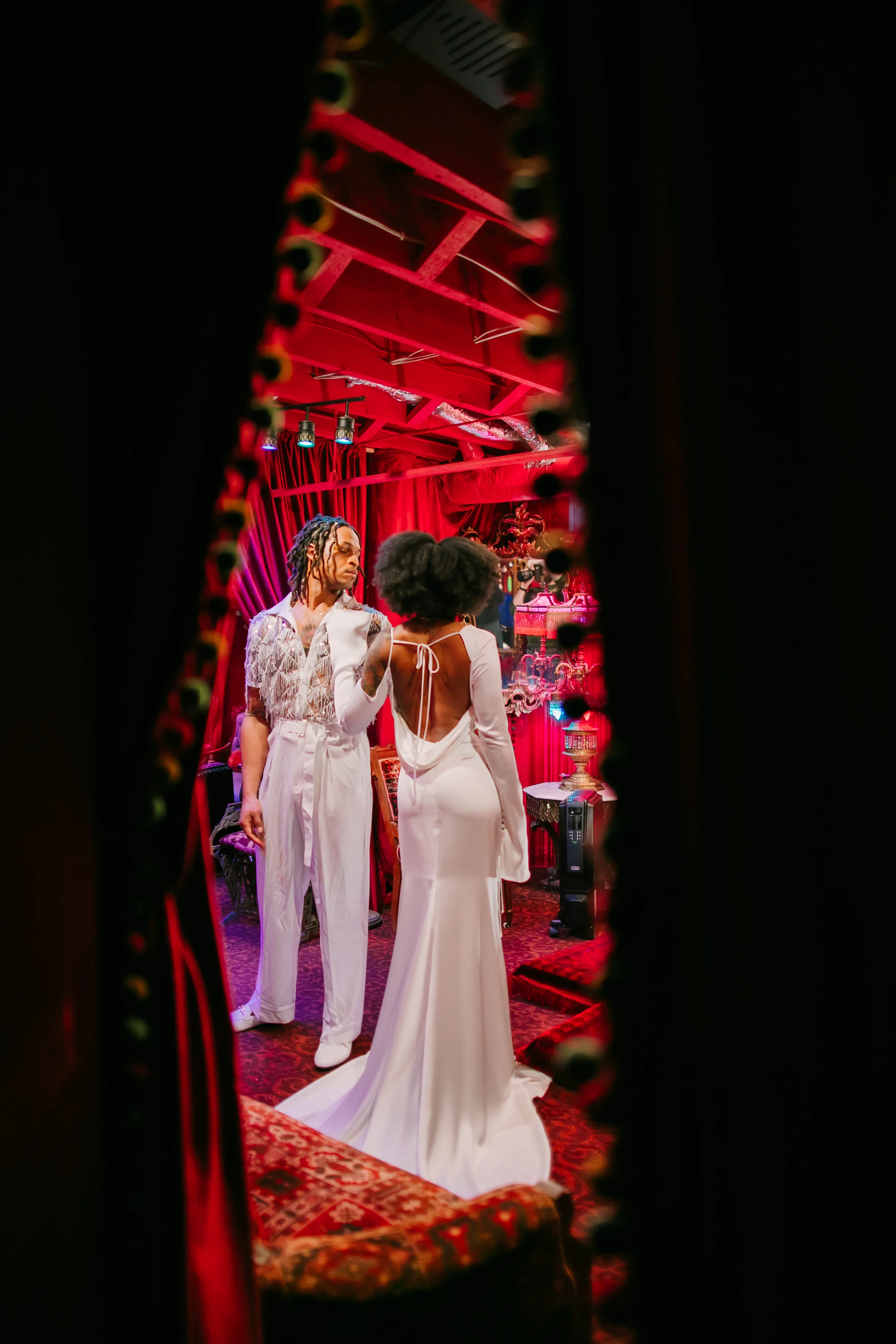 The bride’s last look featured a satin, asymmetrical gown with one long sleeve, one cold-shoulder detail, and a draped open-cowl back finished with a strappy bow. The groom complemented in tailored linen trousers paired with a tasselled, sheer sequined button-up that shimmered under the glow of the space.