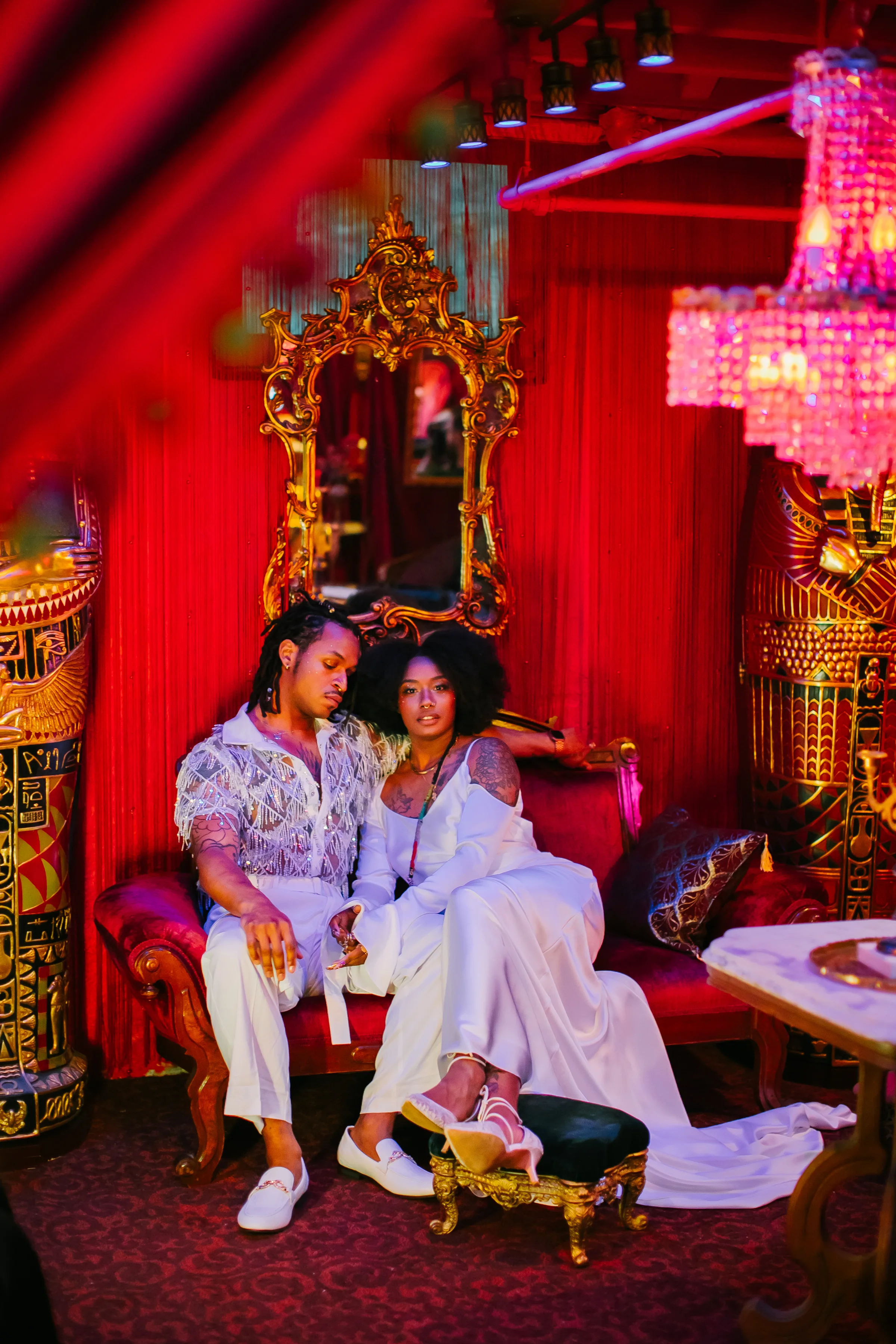 For one final scene, the couple moved into a richly styled red setting layered with patterned floors, antique furnishings, warm ambient lighting, and ornate, Egyptian-inspired details.