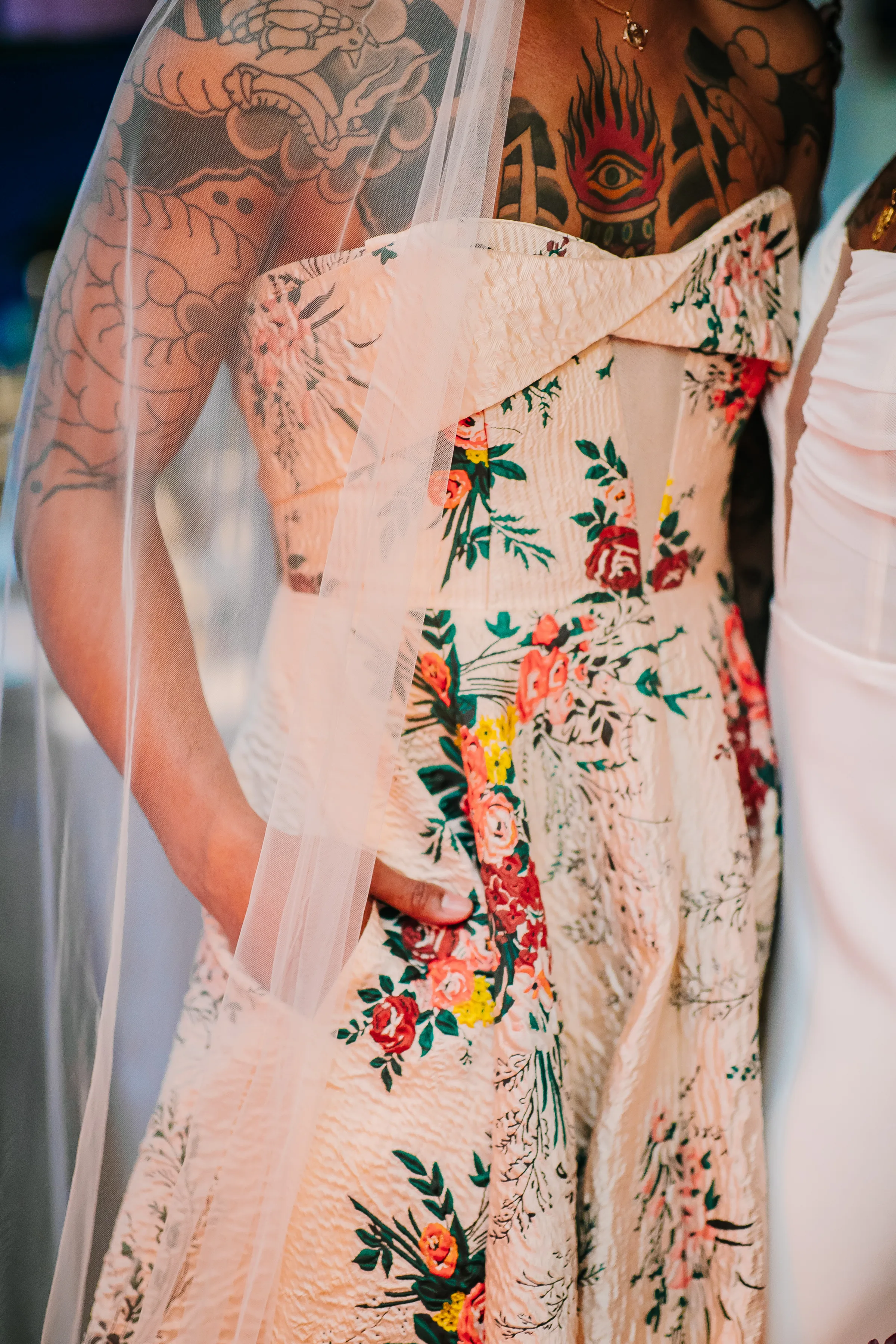 The groom’s gown made an equally striking statement, highlighting rich color and texture. Designed in a soft blush crepe, the strapless A-line silhouette featured a pleated bodice, illusion V-neckline, and full, sweeping skirt. Vibrant floral appliqués trailed across the fabric from bodice to hem, adding depth, artistry, and impact.