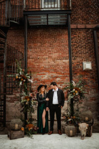 Creating a separate reception look beautifully brings emerald elements into this wedding shoot. The groom balances the bride’s attire perfectly in his classic black pants, white button-down, and fitted windbreaker coat with a southwestern bolero tie. The bride’s geometric earrings carry on the modern style into her reception wear.