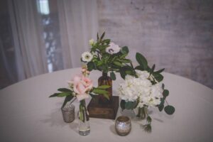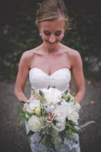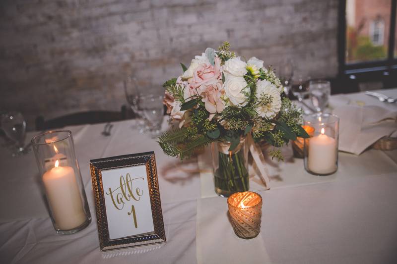 DESCRIBE YOUR WEDDING FLOWERS: Our flowers were mostly cream and blush-colored, with a few hints of plum and burgundy. The bouquets and centerpieces had plenty of greenery, which gave the arrangements a natural, whimsical look.