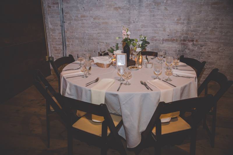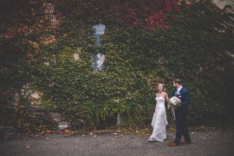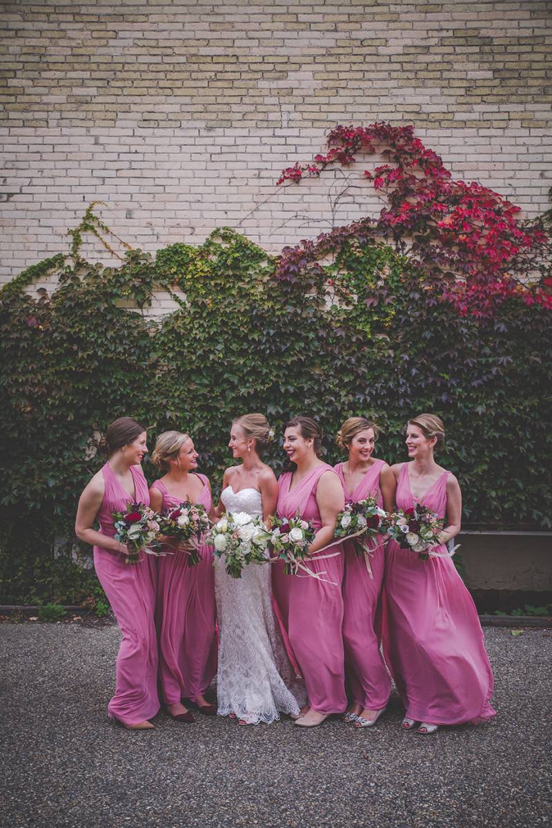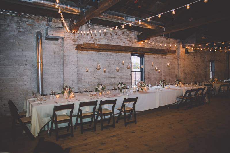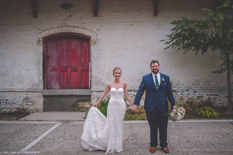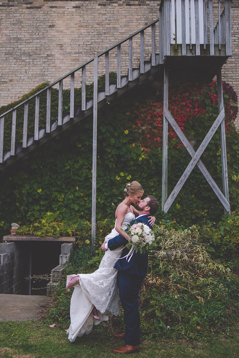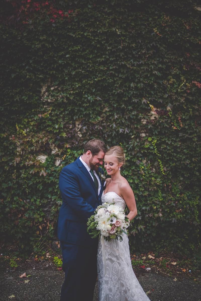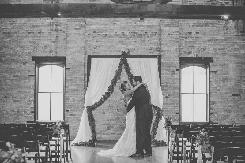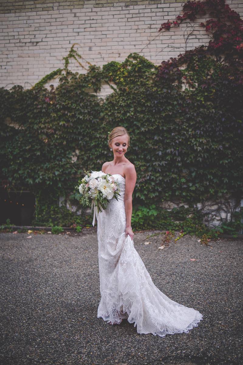 This industrial chic wedding is giving us all the feels today from East Elm Photography. Held at the stunning Lageret, an old tobacco warehouse in Stoughton, every curated detail is nothing but romantic, moody and whimsical. Including stunning dusty rose, plum, cream and sage blooms from Flora by Jamae and tables boasting with seeded eucalyptus, we can’t help but swoon over that arch with white draping and greenery.
