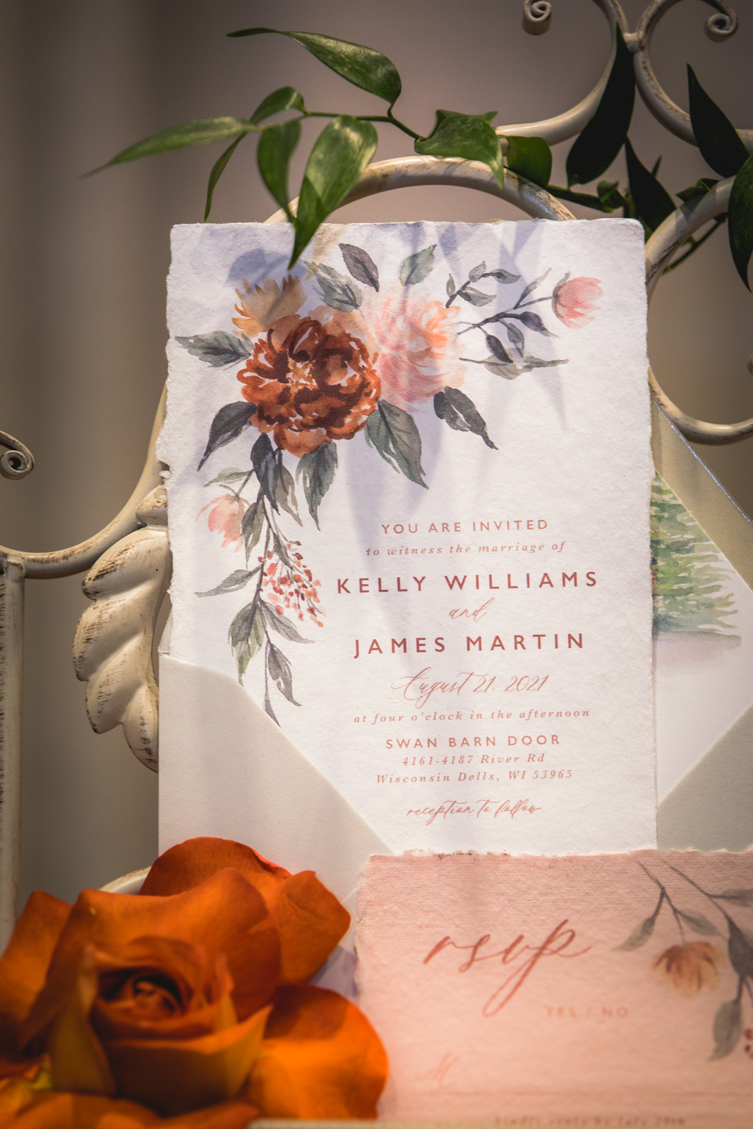 A wedding stationery boutique based in Wisconsin Dells, WI, Windswept Design Studio specializes in one-of-a-kind stationery that tells each couple’s unique love story on paper. Did you know every one of their invitation collections feature a whimsical watercolor style like this gorgeous one? Personalize your pieces with hand-painted details like venue illustrations or pet portraits to put your unique stamp on your wedding day stationery with them as well!