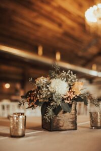 DESCRIBE YOUR WEDDING FLOWERS: We wanted to stick with the neutral colors, but have a small amount of “pop” in color. The flowers really complimented our wedding party colors. They consisted of: a mix of ivory football mums, peach garden roses, cream waxflower, and dusty miller. For the boutonnieres, we incorporated pheasant feathers, as both my husband and I are hunters.