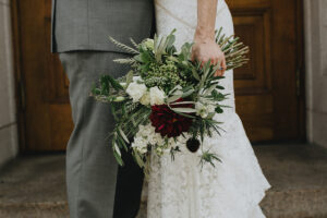 DESCRIBE YOUR WEDDING FLOWERS: They were beautiful, mostly white and red hues with lots of greenery. We wanted to choose seasonal flowers, so we waited until closer to the wedding to make selections. That was about the time when our baby was born, so we left the choices up to our florist, which turned out to be the best decision. She really knows her work!