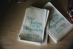 WERE THERE ANY PERSONAL TOUCHES OR DIY ELEMENTS? We live out of state and were in the process of adopting our little girl during the planning (she was born six weeks before the wedding) so we couldn’t devote much time to small details. Our wedding planner, Sarah Davidson, did a fantastic job of helping us choose the details that matched our personalities and pulling it all together. For our cake topper, Mark’s mother had little peg dolls painted to match our wedding attire, including a smaller one that looked like our daughter in her blue and lace dress. She also created a sweet candy table with custom bags so our guests could take candy home.