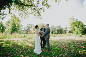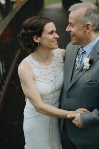 WHAT WAS YOUR FAVORITE MOMENT FROM YOUR WEDDING? We had the ceremony under an old tree in Tenney Park and Mark carried our six-week-old daughter in during the processional. We had an uncle act as the officiant and asked a brother-in-law to write and give a reading, which was so thoughtful that it brought us to tears.