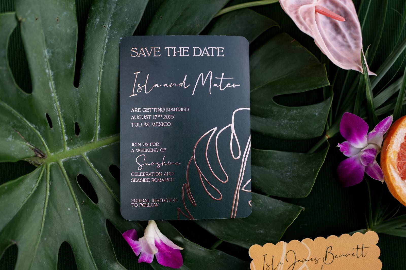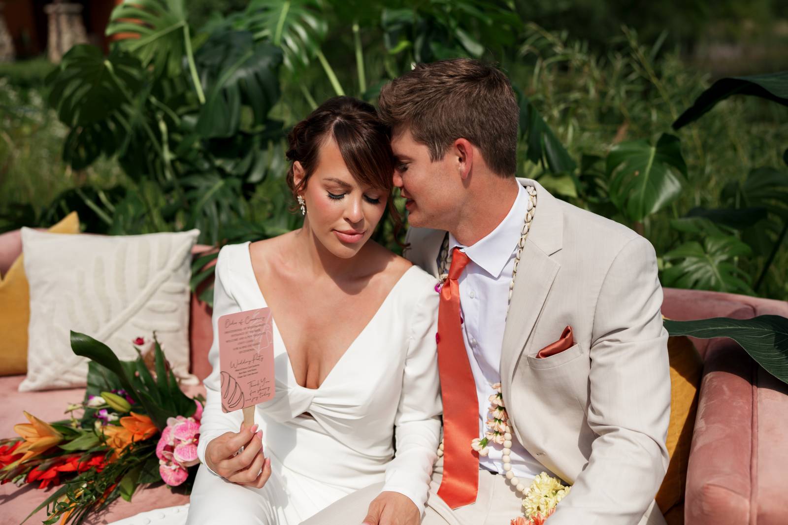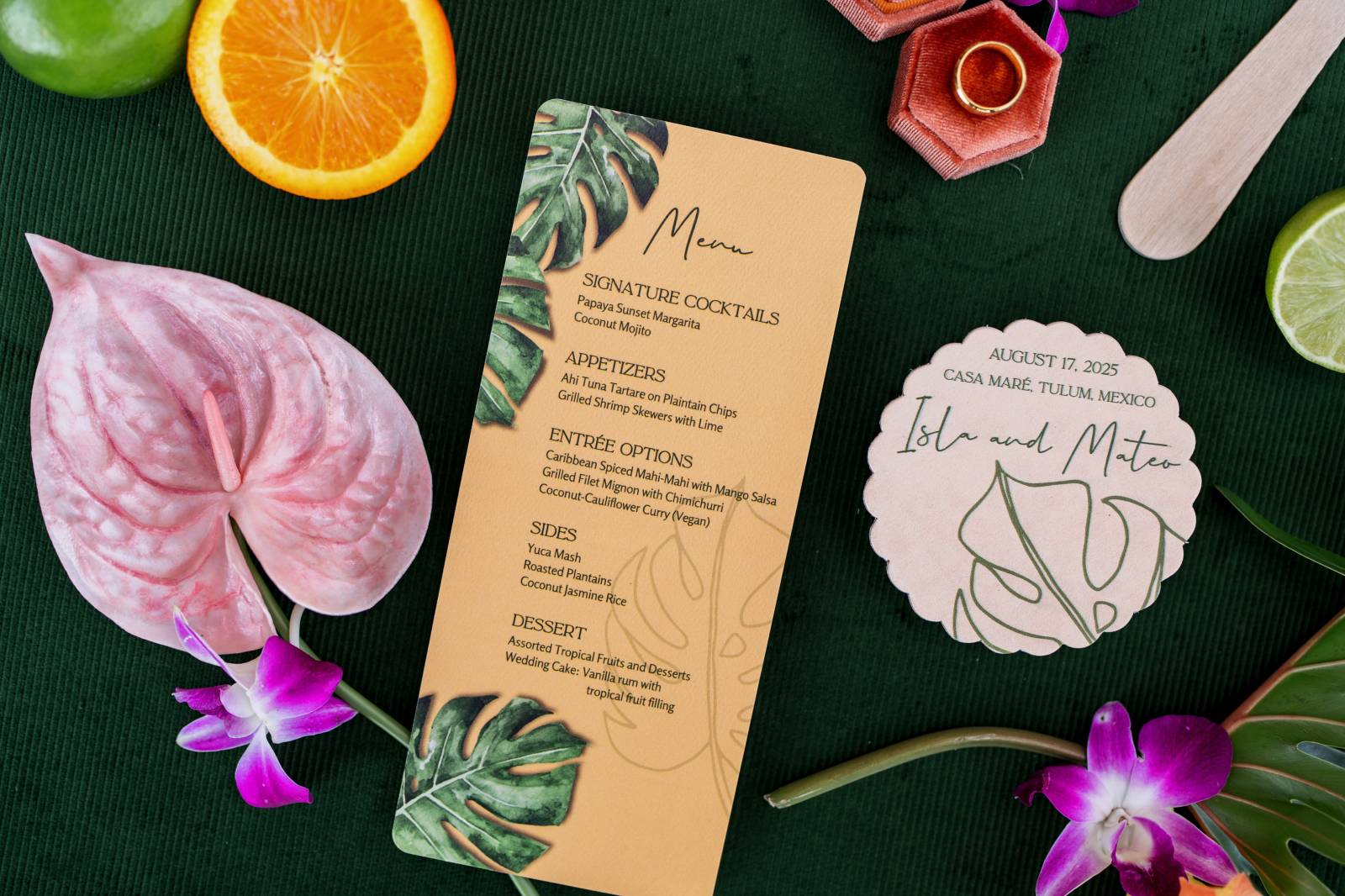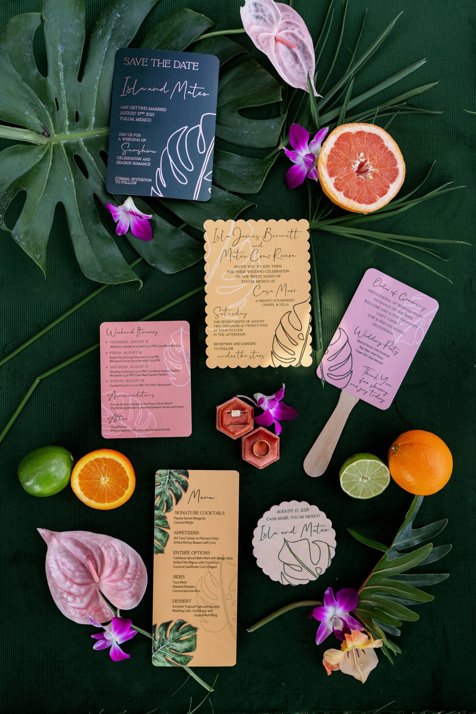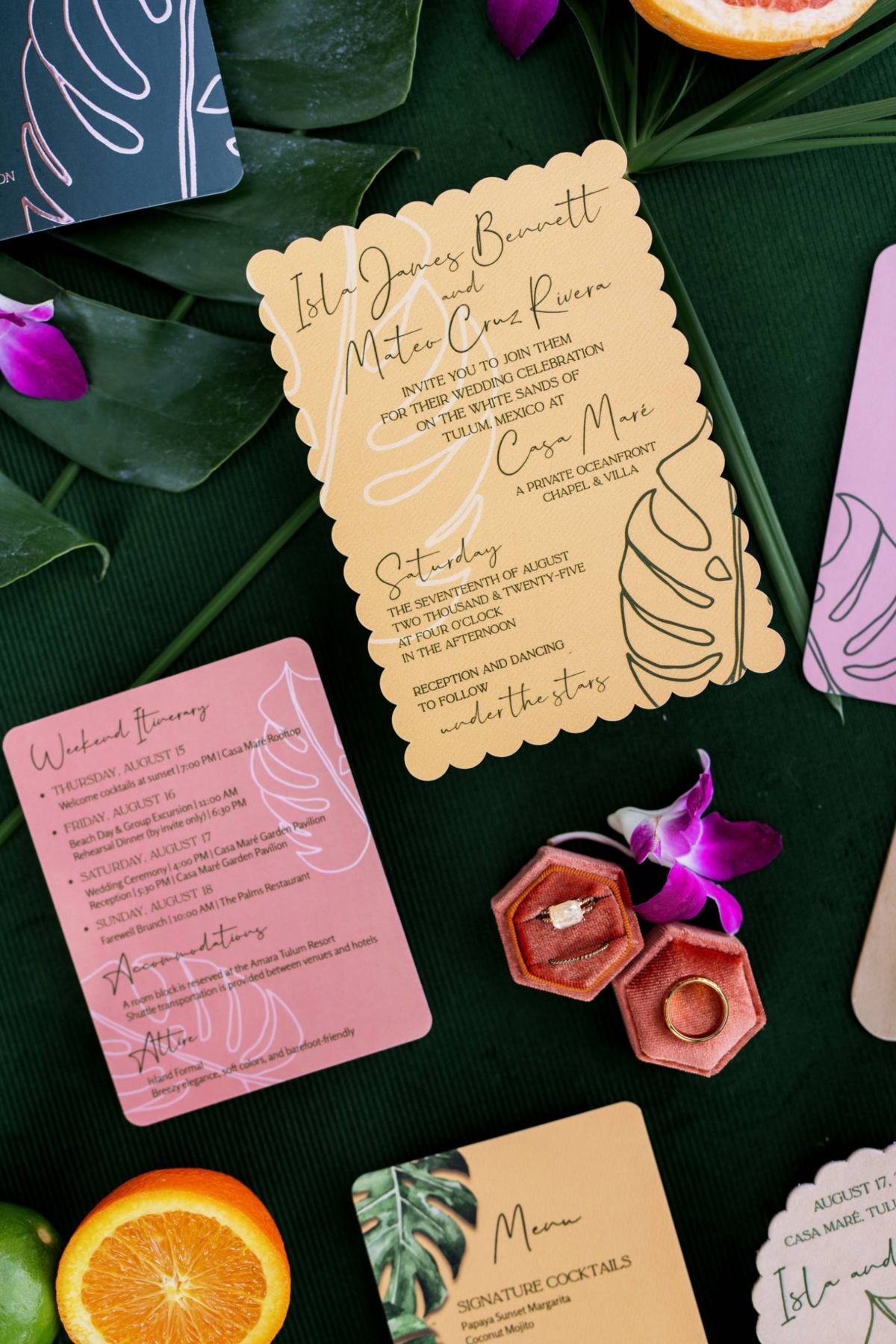The Bride’s Secretary created a custom stationery suite inspired by palm trees, set within a rich, tropical color palette. The rectangular pieces varied in size and shape, in shades of peach, pink, mango, and green. A handwritten, modern script font paired with an elegant serif across the printed pieces, which included an invitation, save-the-date, details card, welcome sign, coaster, menu, and ceremony program that doubled as a fan for guests.