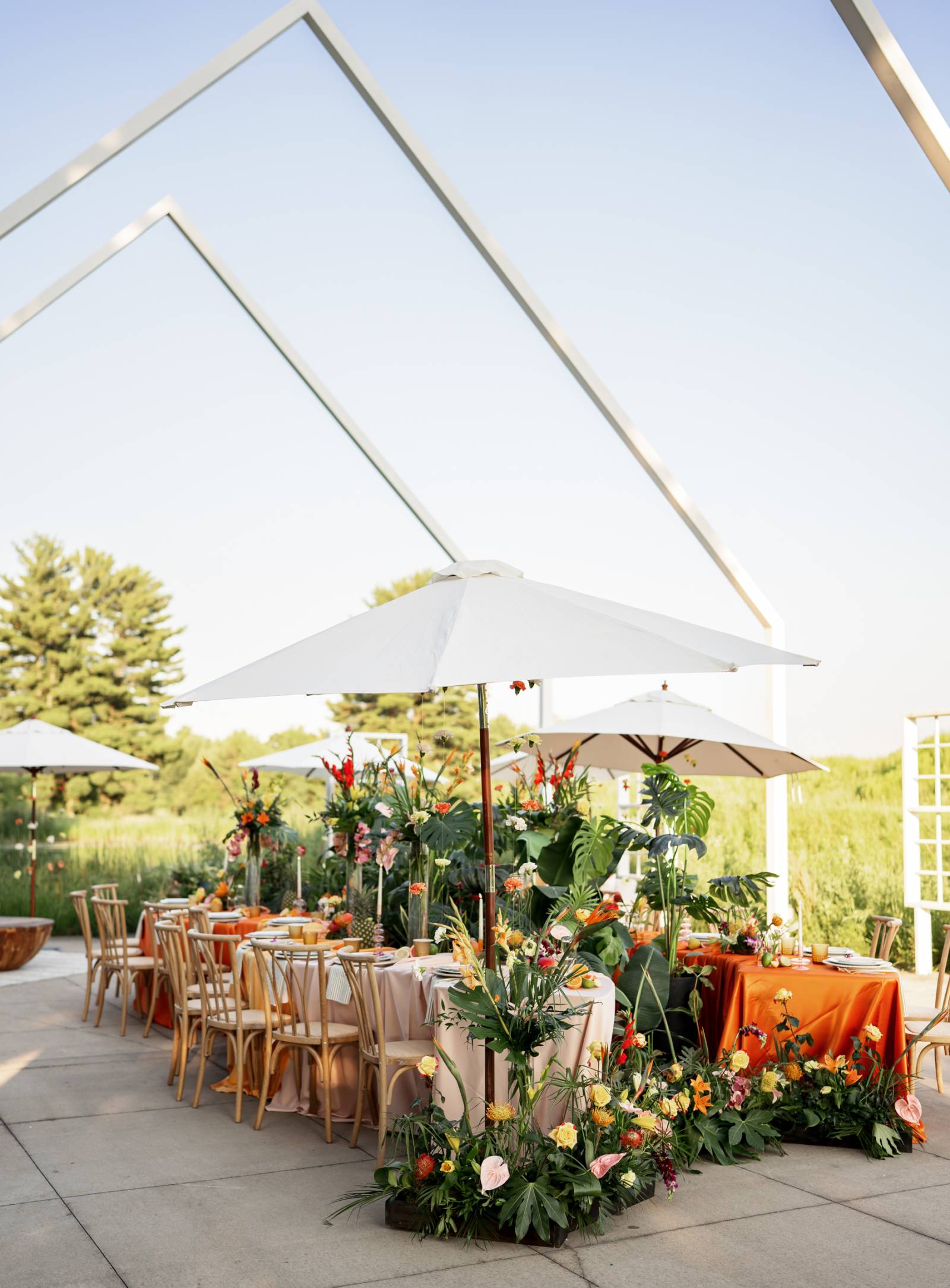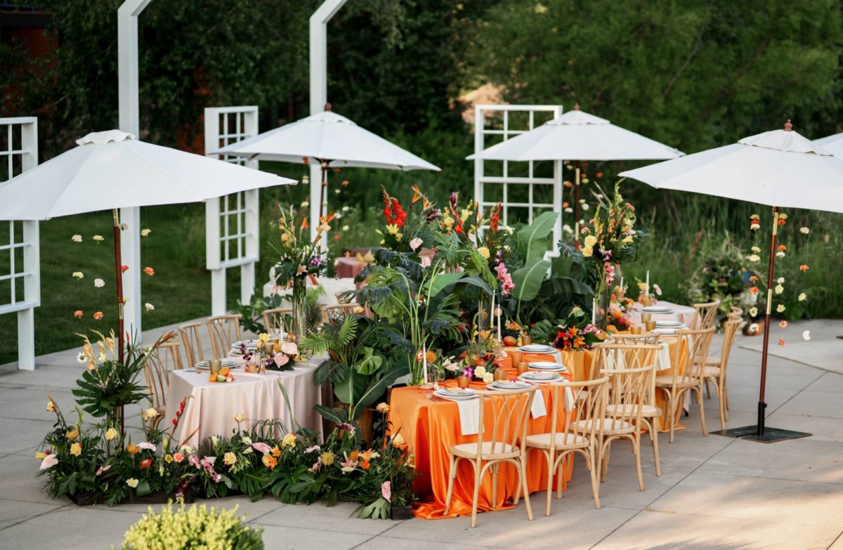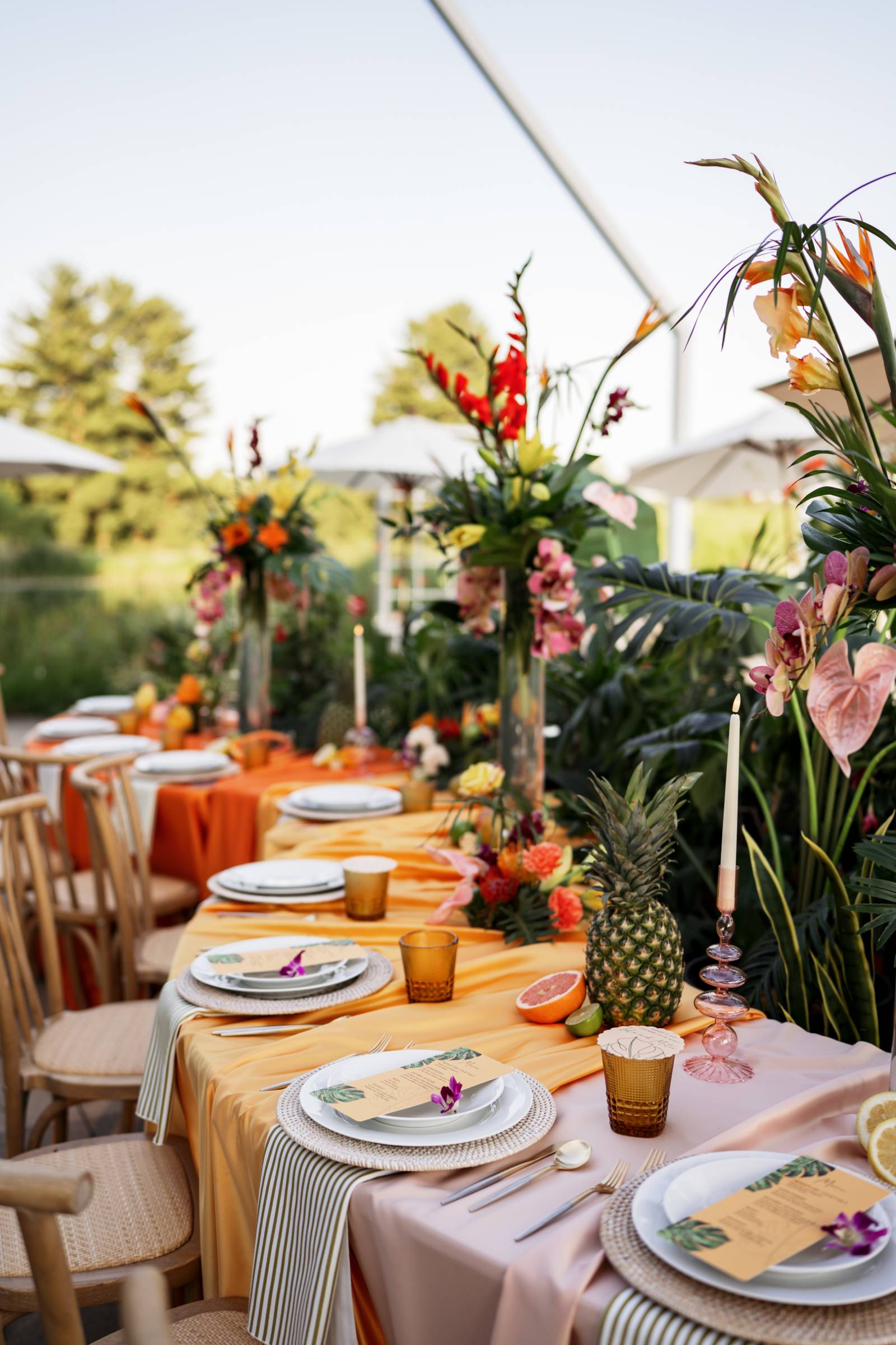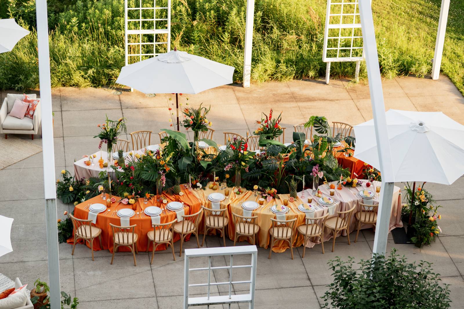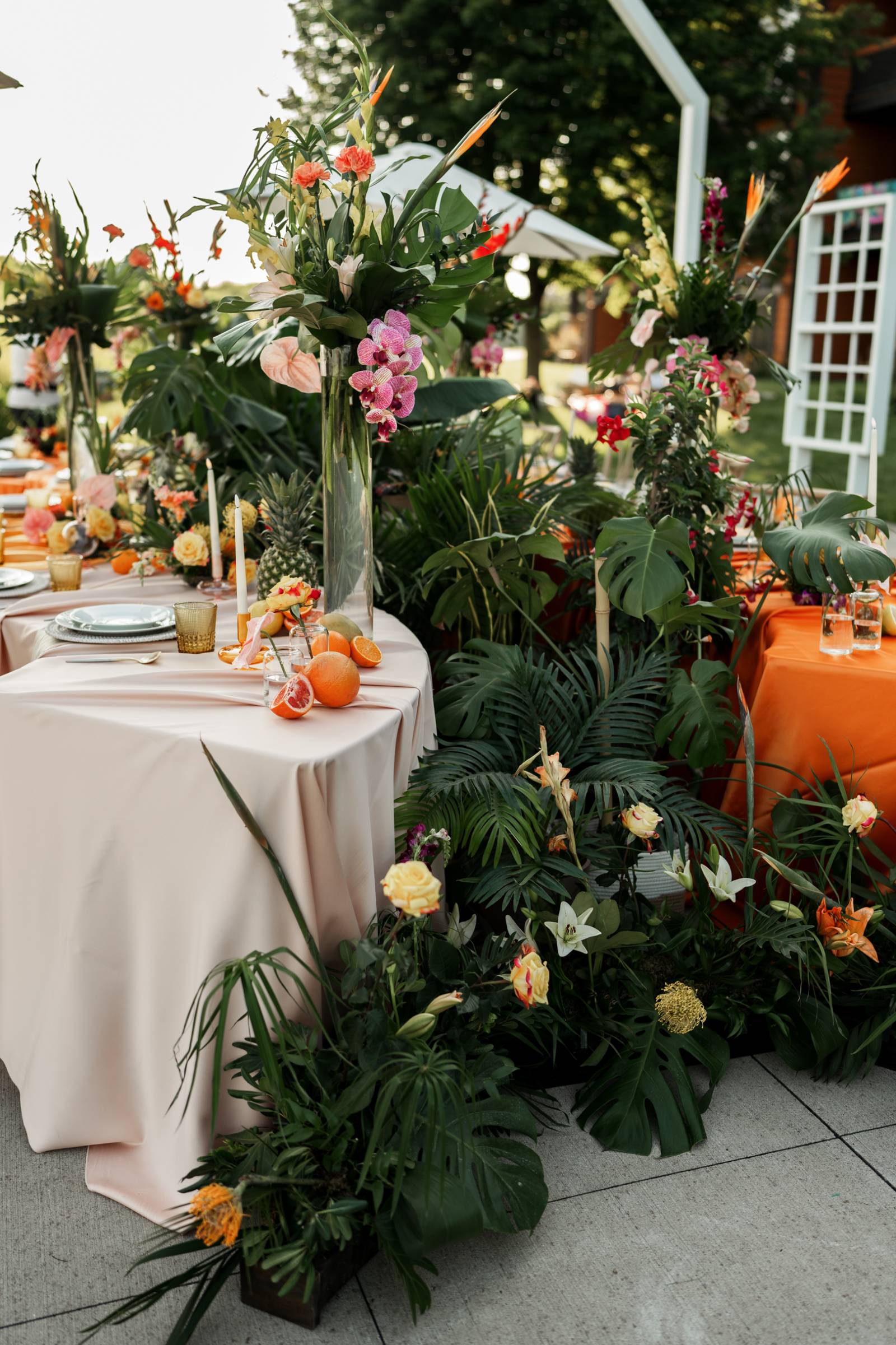 Two serpentine tables mirrored each other at the reception setup, with tablecloths arranged in an ombré pattern from bold orange to tan. A large, tropical centerpiece decorated the space between them, with more greenery and florals spilling onto either side. The setup was shaded by large umbrellas, featuring whimsically strung blooms.
