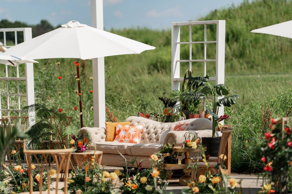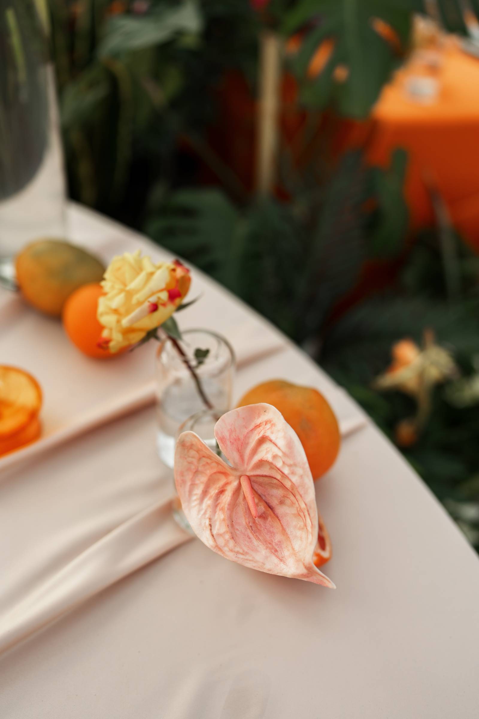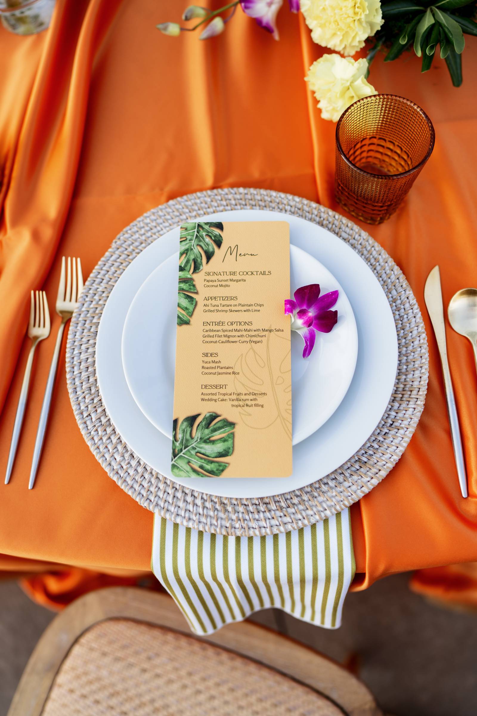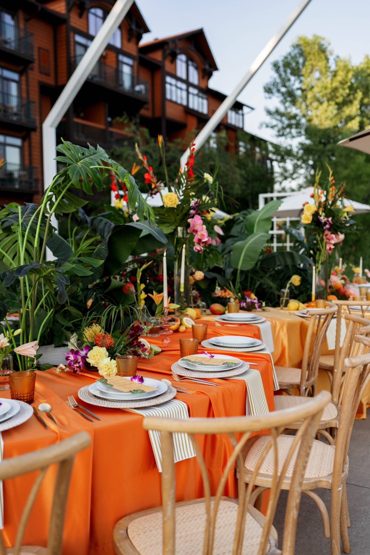 Two serpentine tables mirrored each other at the reception setup, with tablecloths arranged in an ombré pattern from bold orange to tan. A large, tropical centerpiece decorated the space between them, with more greenery and florals spilling onto either side. The setup was shaded by large umbrellas, featuring whimsically strung blooms.