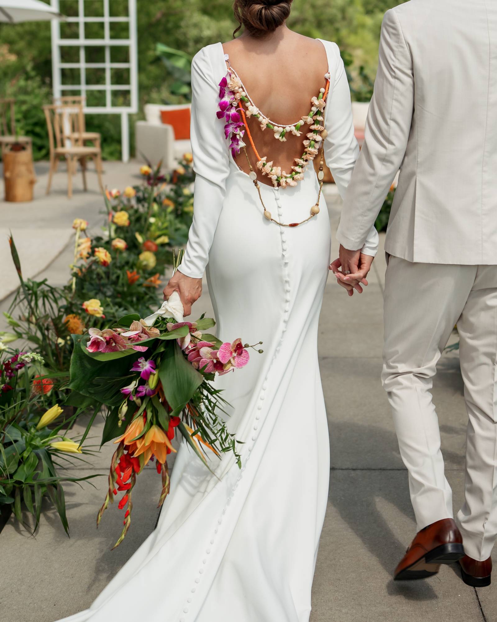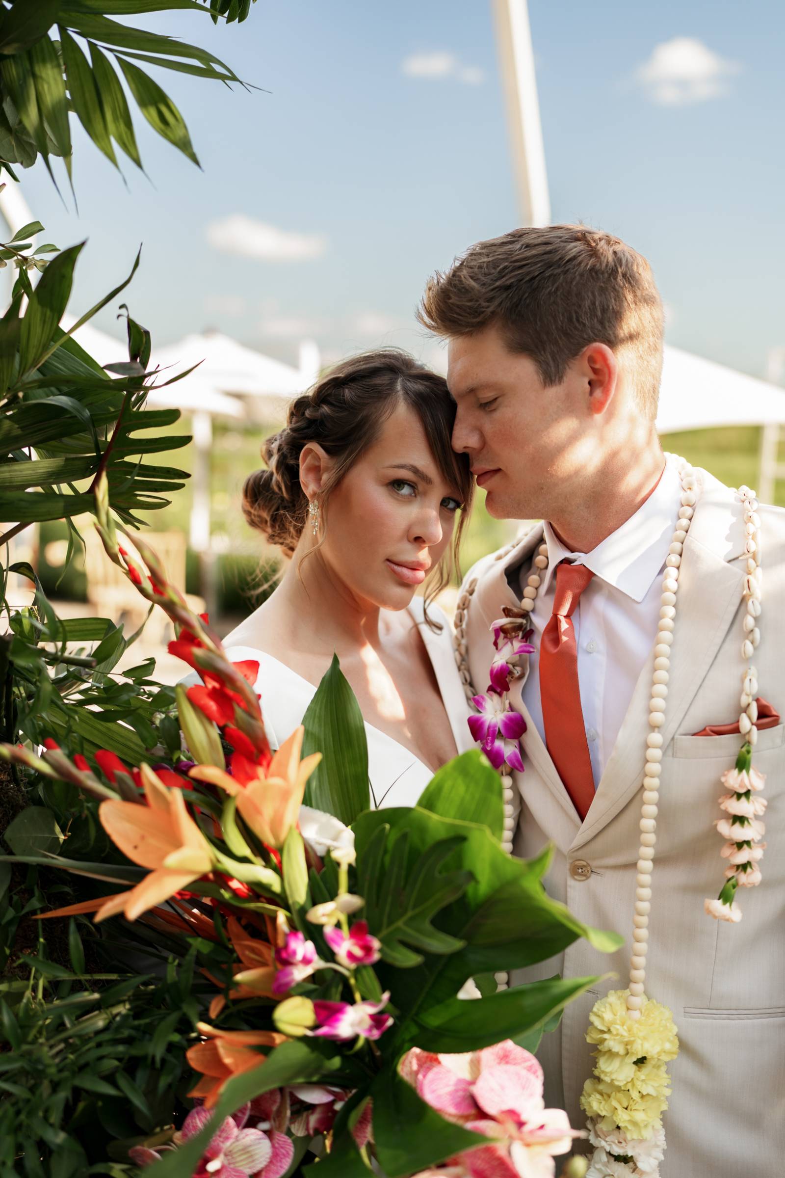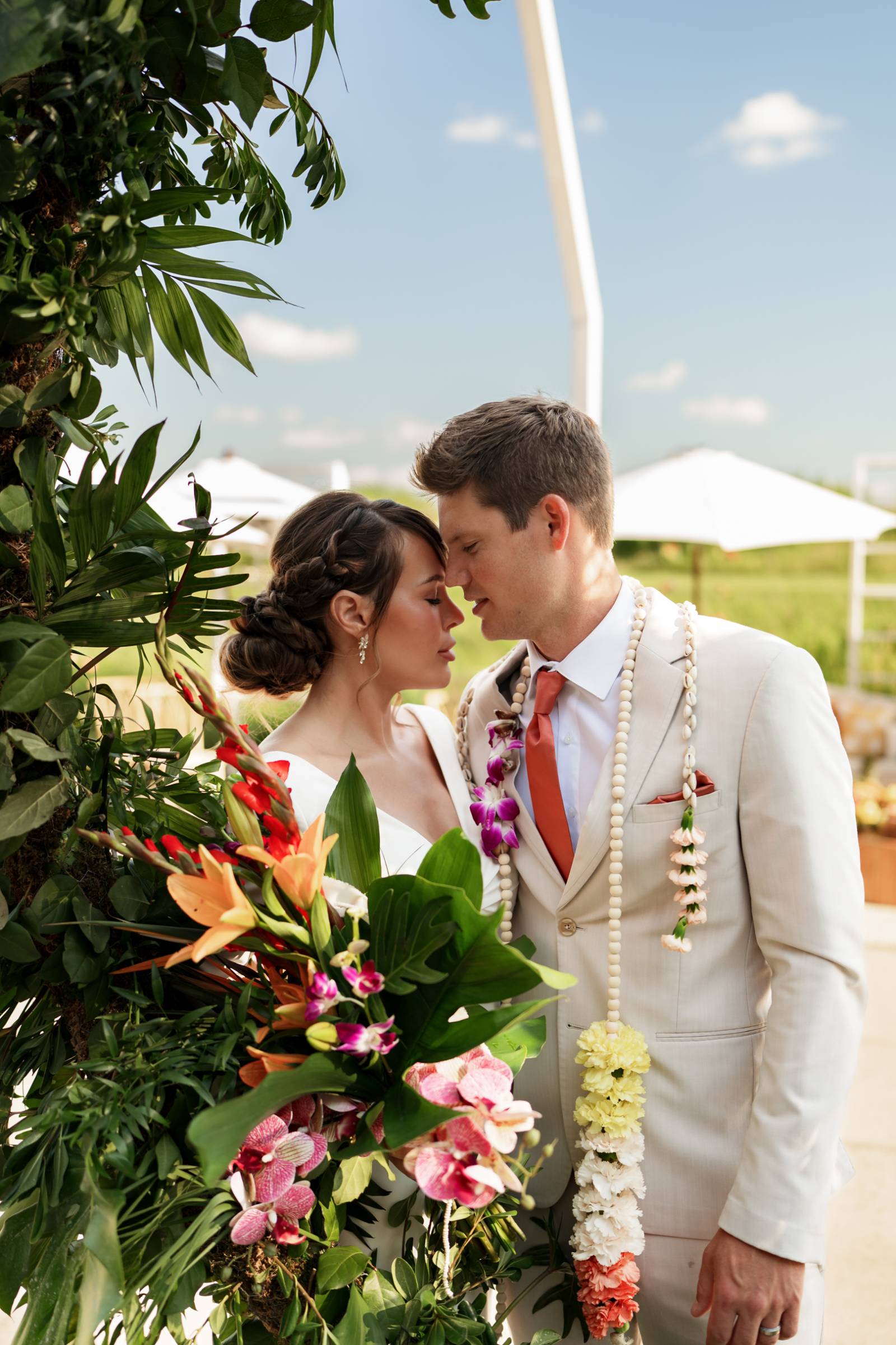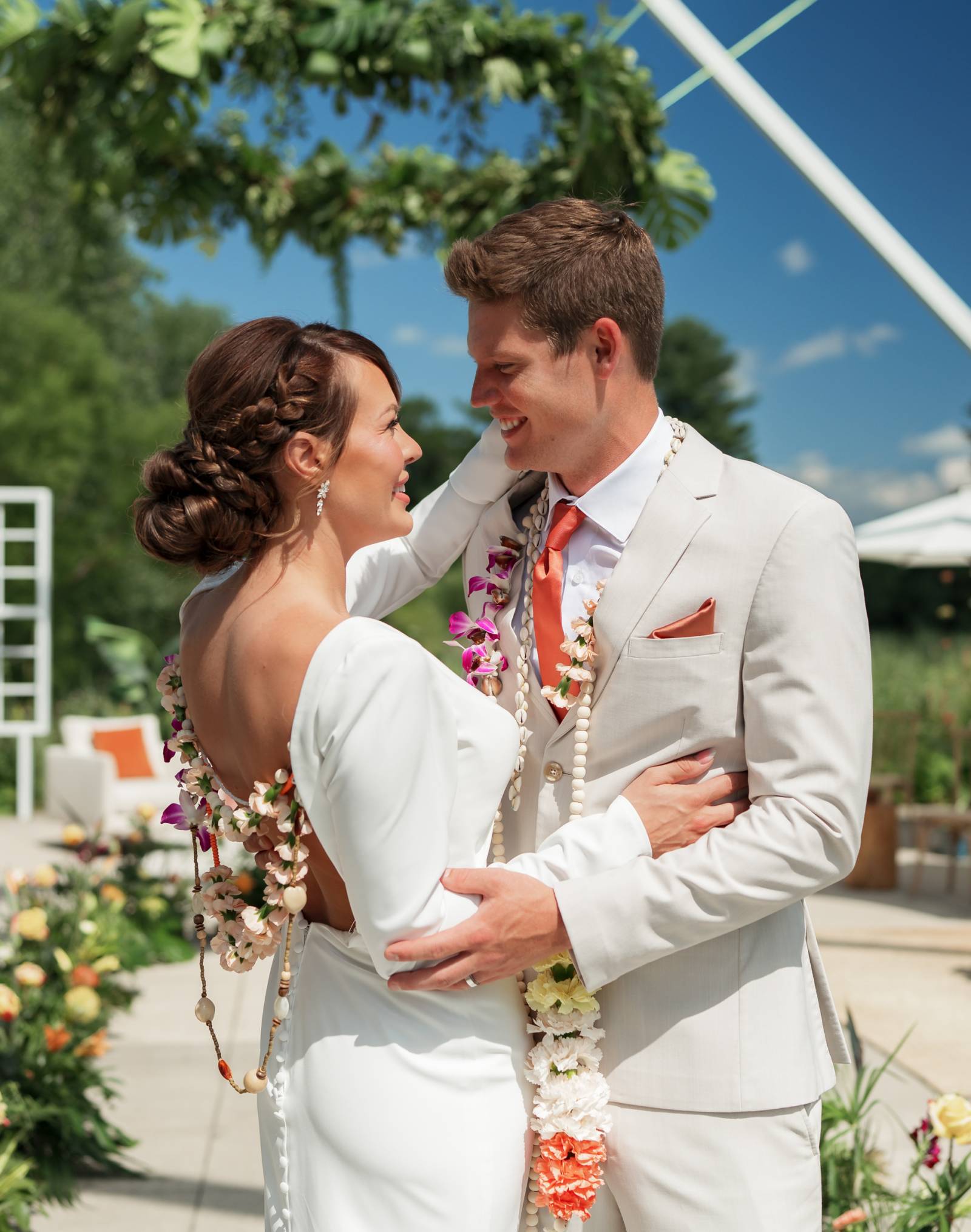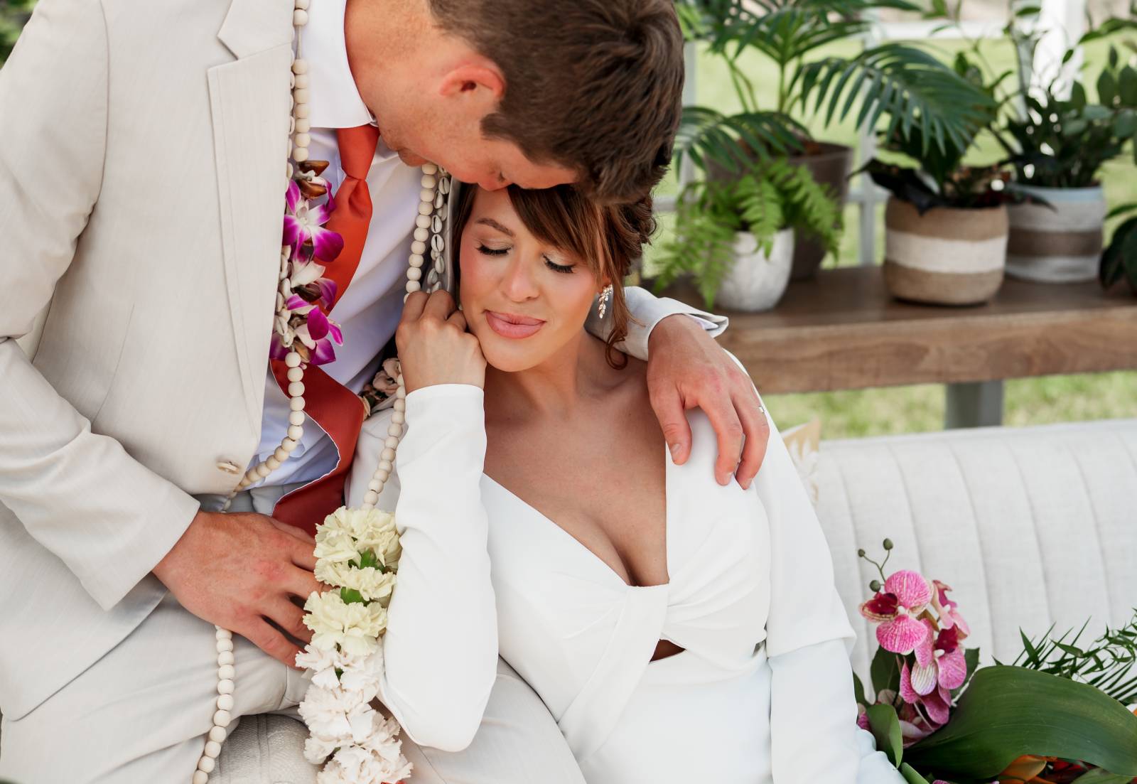 The bride’s long-sleeve gown was a blend of classic and modern, featuring simple, luxurious fabric, minimal details, and a keyhole tie front. The open-back design was perfect for floral and beaded draping reminiscent of a lei. Beta Blue Beauty provided hair and makeup artistry, styling the bride’s hair into a voluminous, braided bun and side-swept bangs. Her makeup accentuated her healthy tan, with soft, arched brows, striking cheekbones, and glowy highlighter.