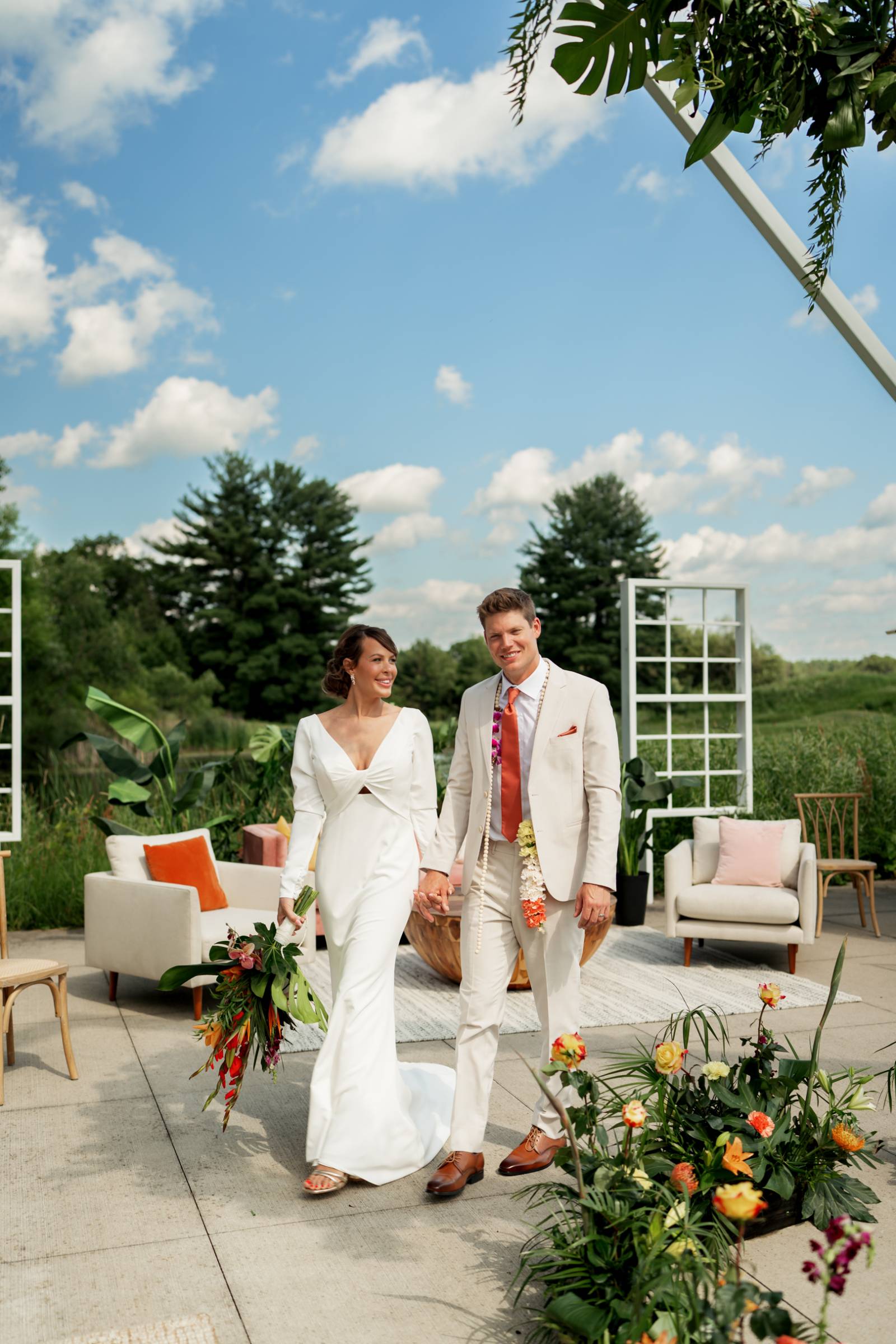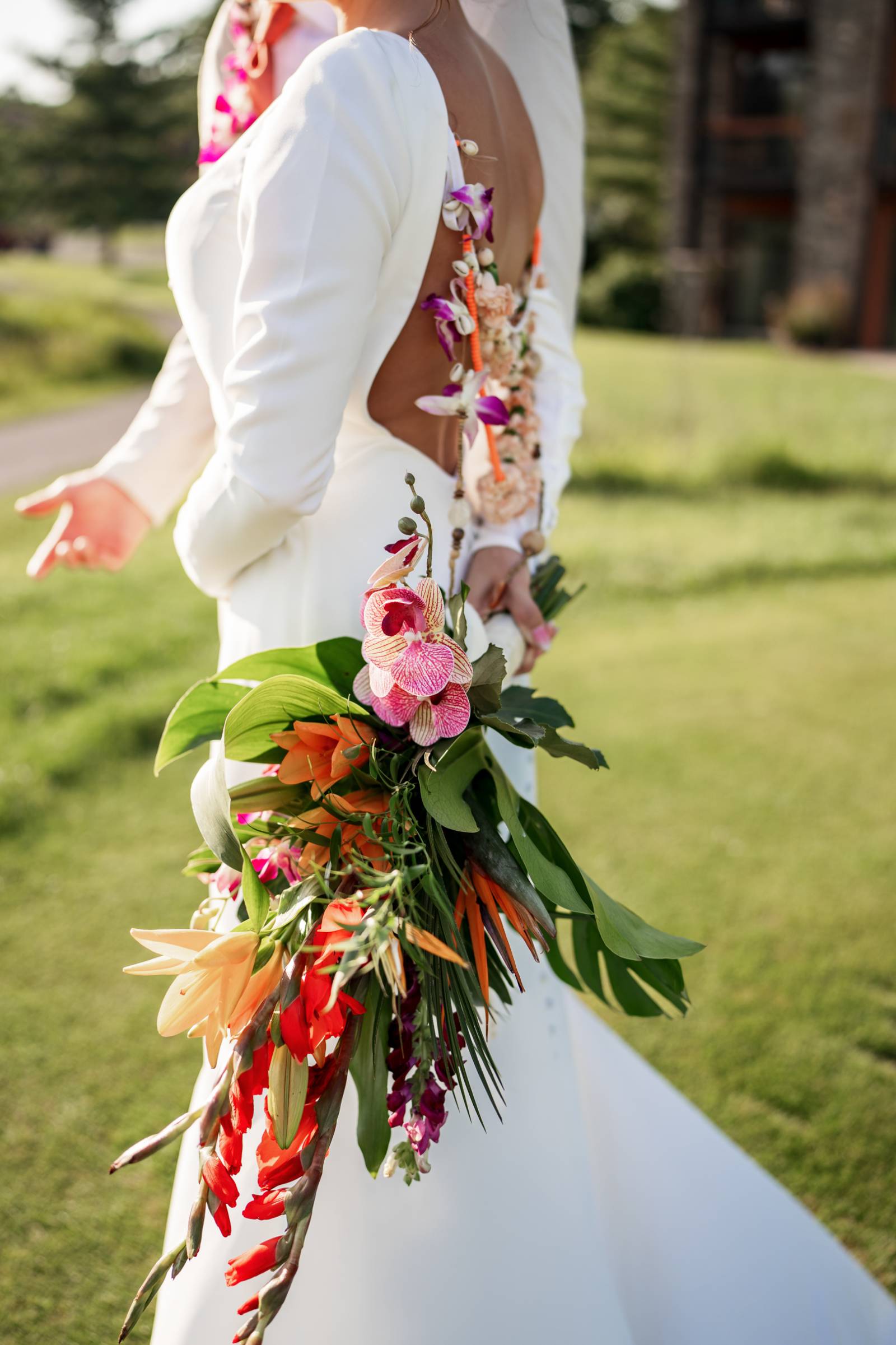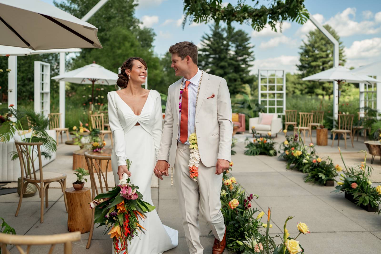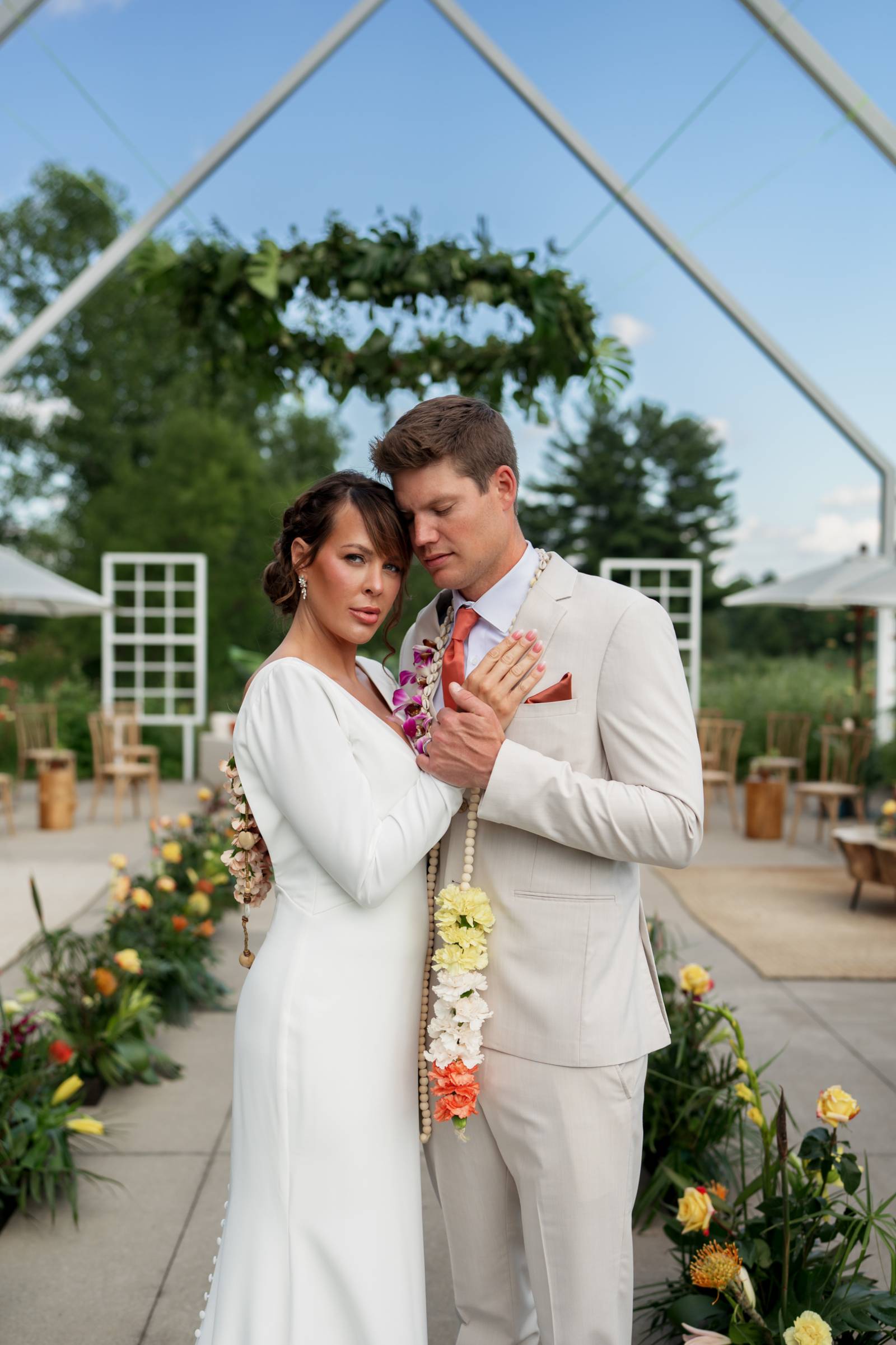 The bride’s long-sleeve gown was a blend of classic and modern, featuring simple, luxurious fabric, minimal details, and a keyhole tie front. The open-back design was perfect for floral and beaded draping reminiscent of a lei. Beta Blue Beauty provided hair and makeup artistry, styling the bride’s hair into a voluminous, braided bun and side-swept bangs. Her makeup accentuated her healthy tan, with soft, arched brows, striking cheekbones, and glowy highlighter.