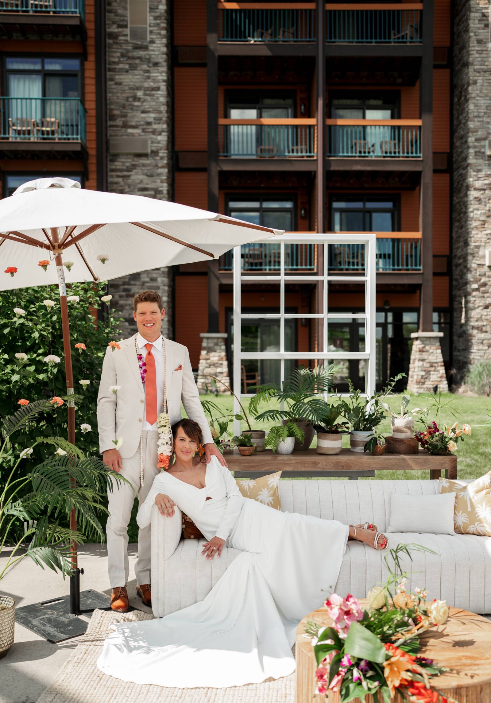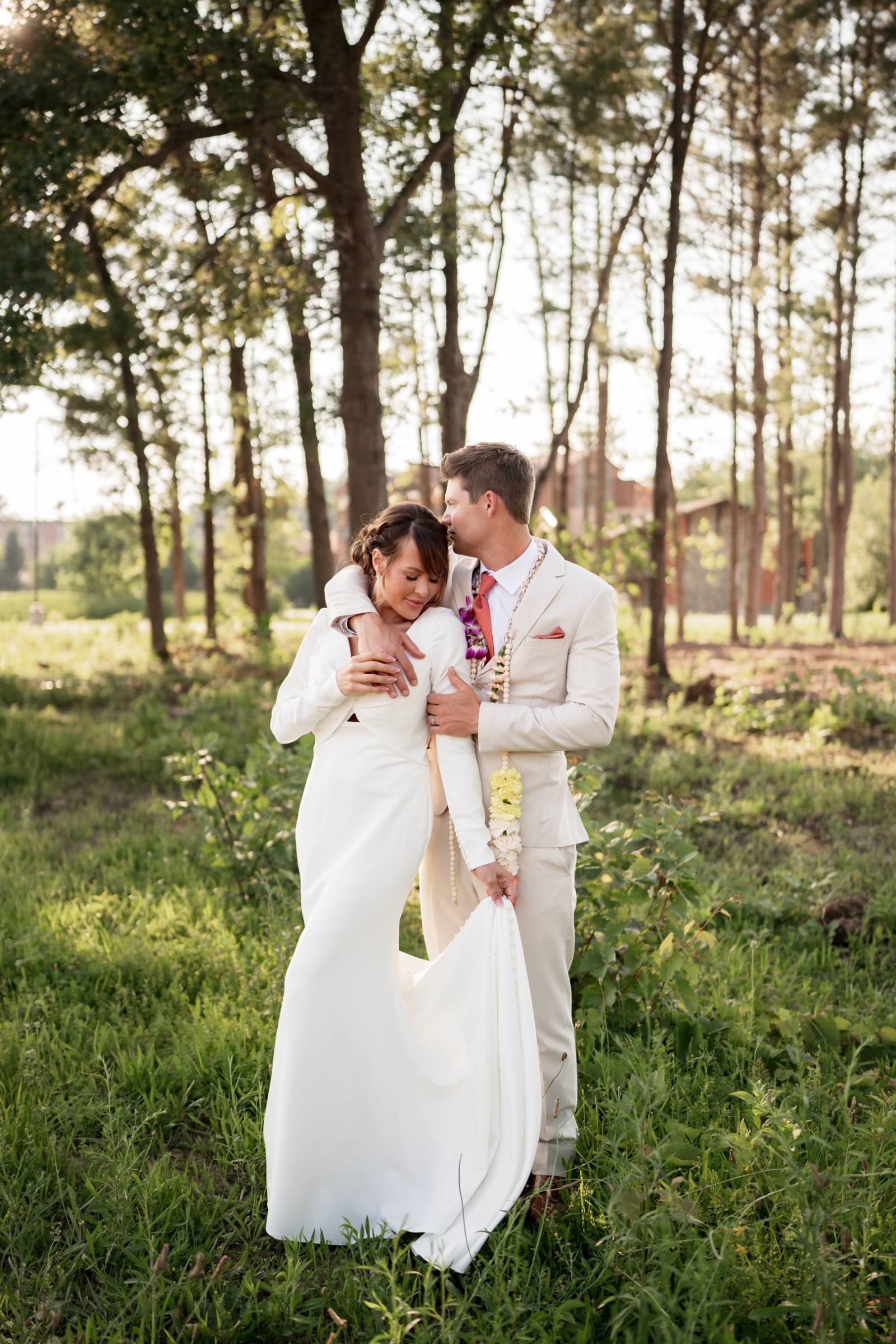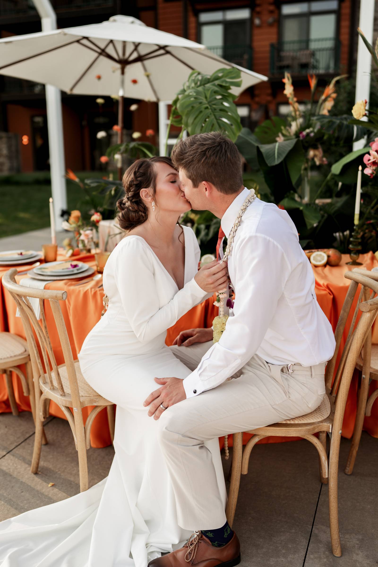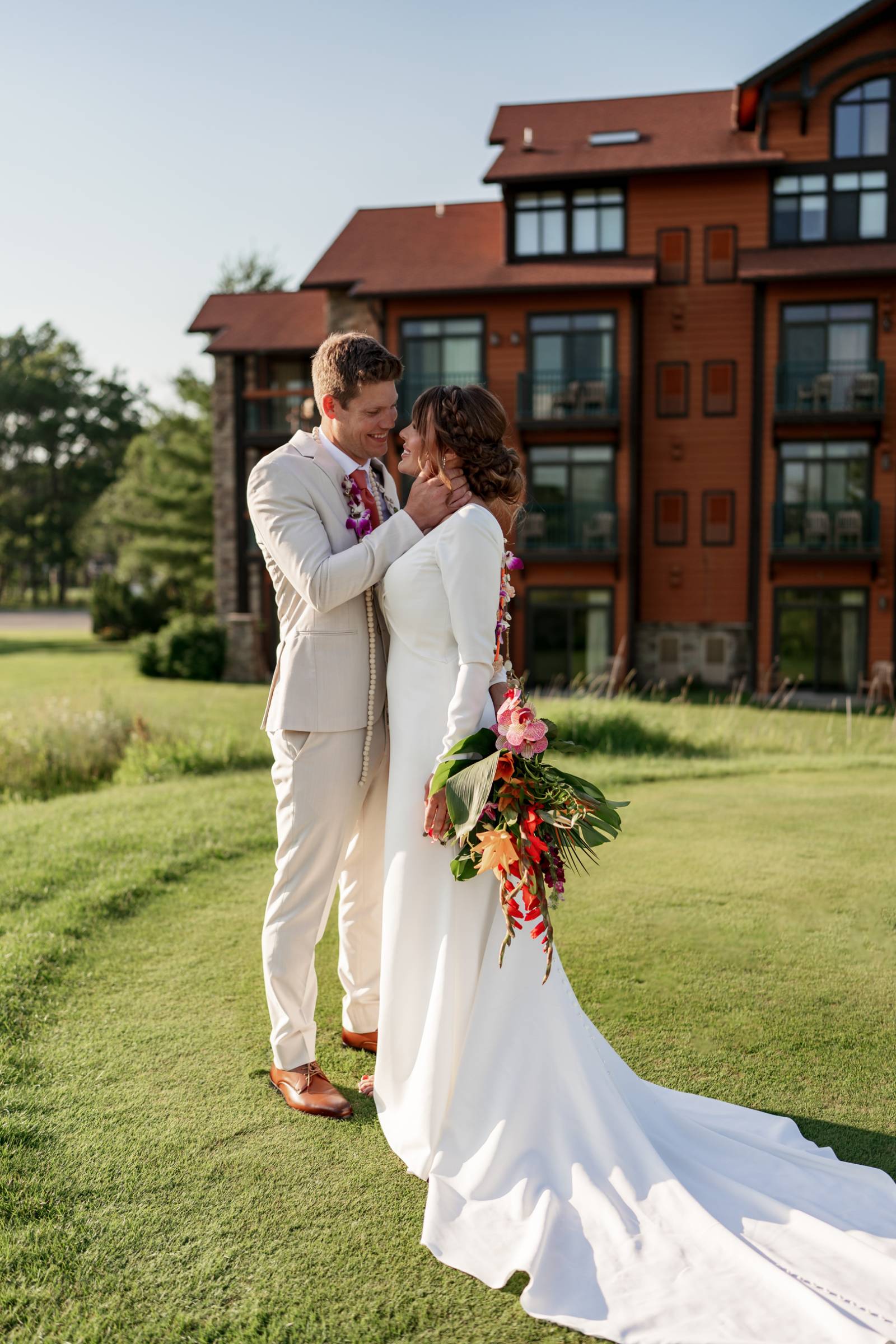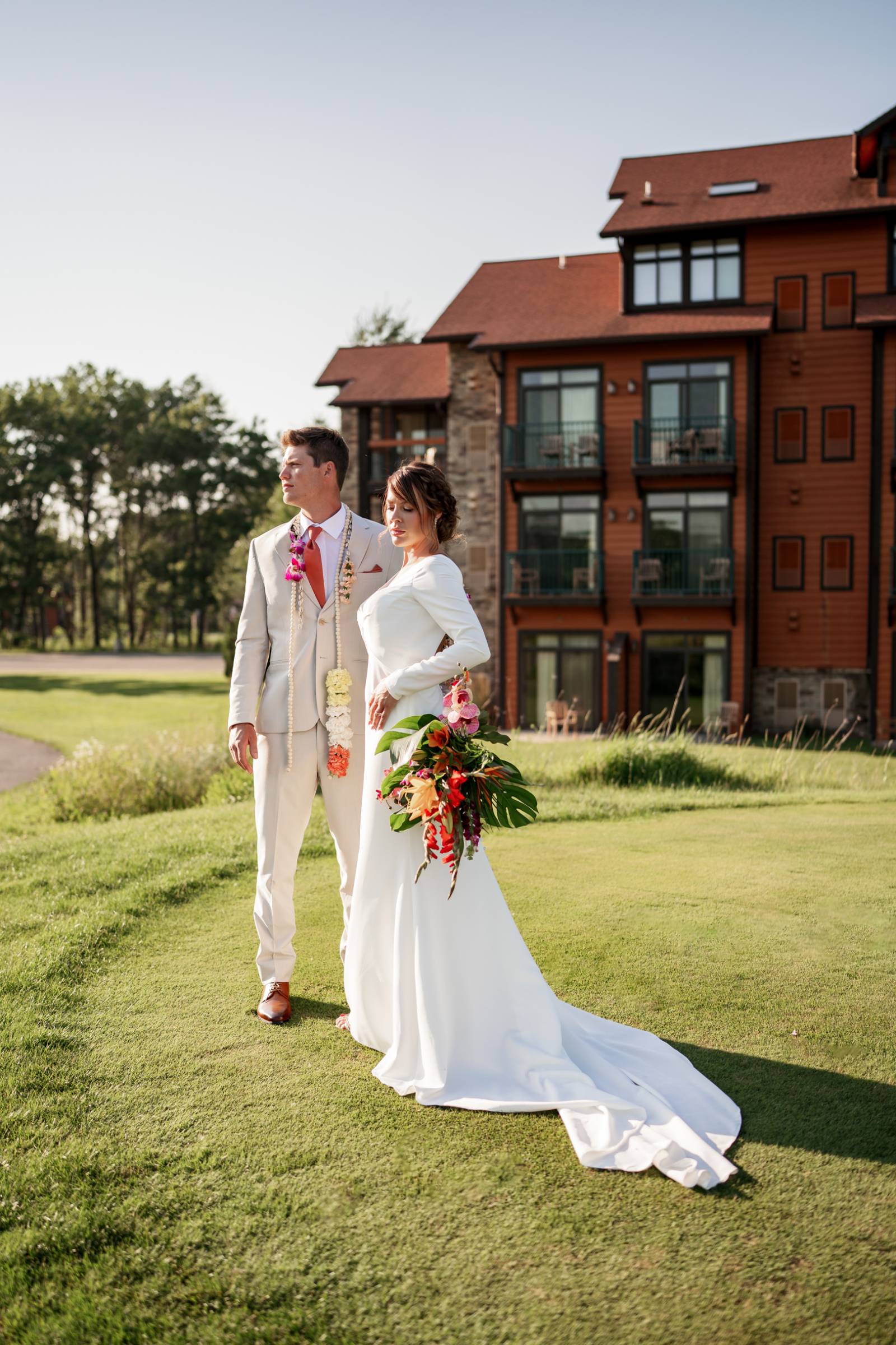 The bride’s long-sleeve gown was a blend of classic and modern, featuring simple, luxurious fabric, minimal details, and a keyhole tie front. The open-back design was perfect for floral and beaded draping reminiscent of a lei. Beta Blue Beauty provided hair and makeup artistry, styling the bride’s hair into a voluminous, braided bun and side-swept bangs. Her makeup accentuated her healthy tan, with soft, arched brows, striking cheekbones, and glowy highlighter.