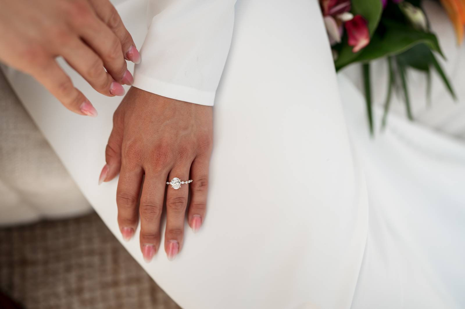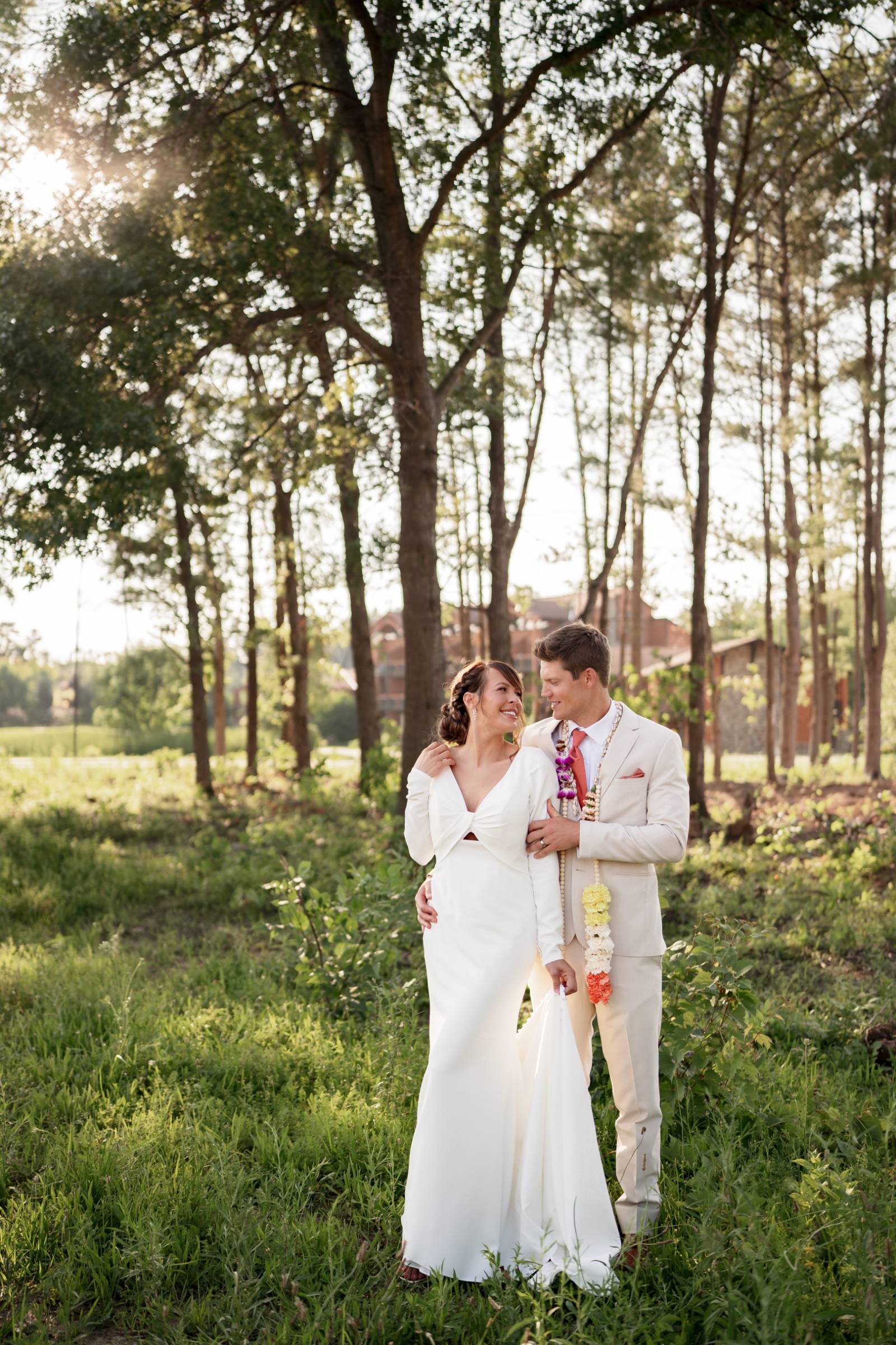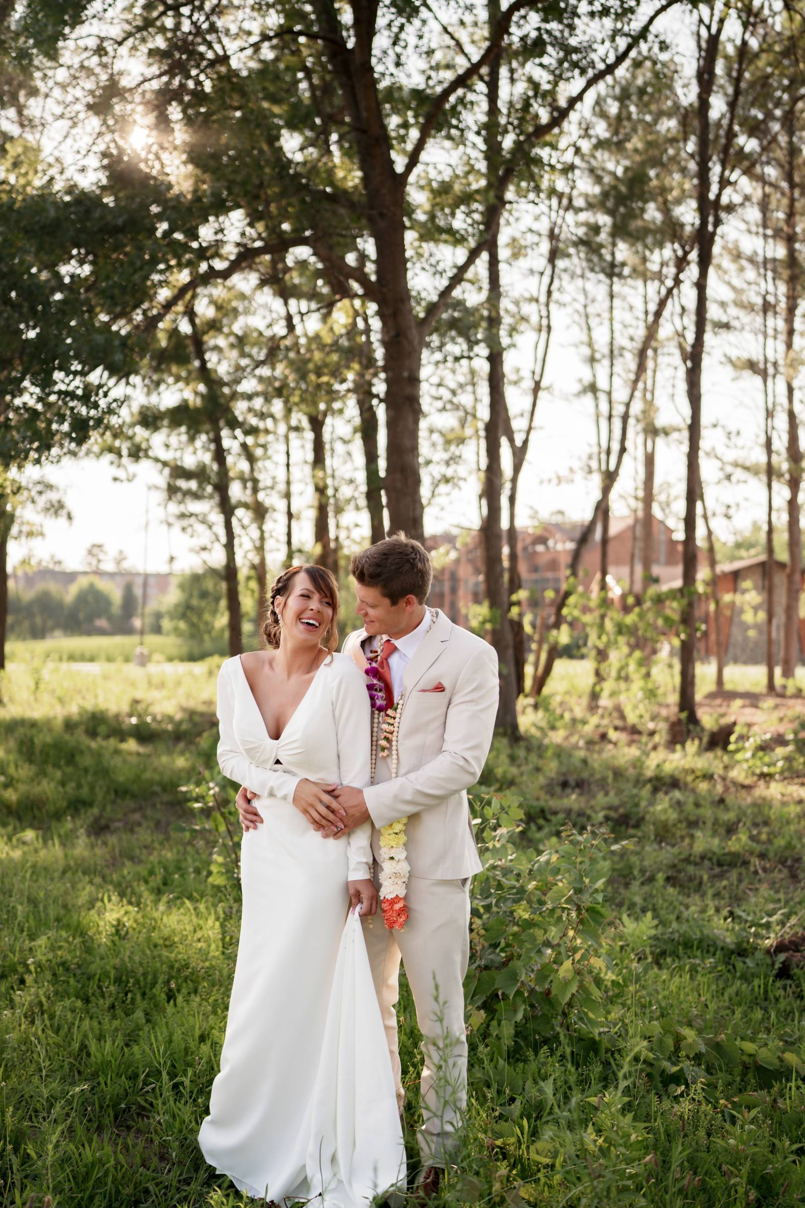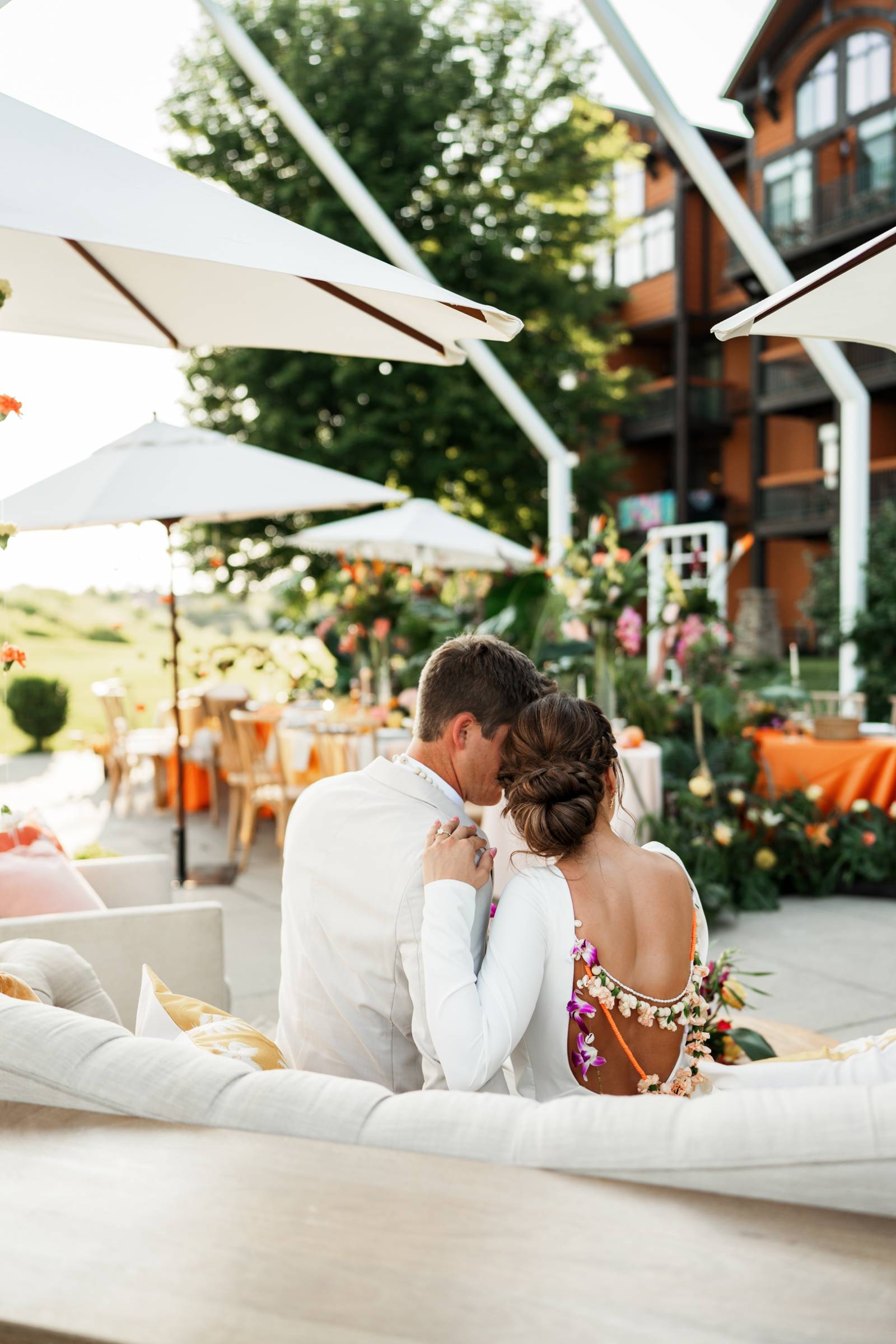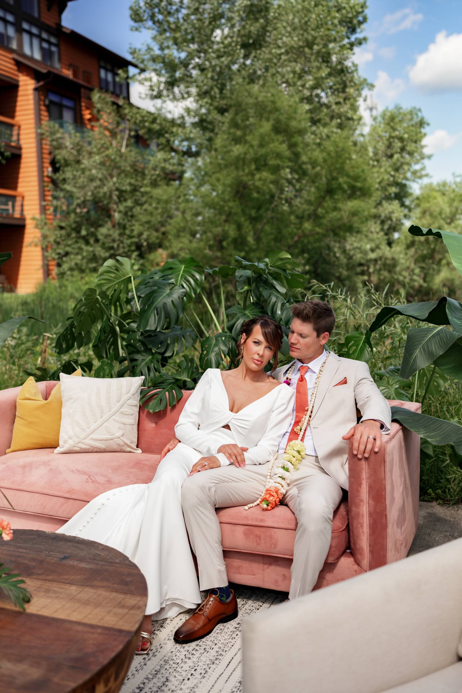 The bride’s long-sleeve gown was a blend of classic and modern, featuring simple, luxurious fabric, minimal details, and a keyhole tie front. The open-back design was perfect for floral and beaded draping reminiscent of a lei. Beta Blue Beauty provided hair and makeup artistry, styling the bride’s hair into a voluminous, braided bun and side-swept bangs. Her makeup accentuated her healthy tan, with soft, arched brows, striking cheekbones, and glowy highlighter.