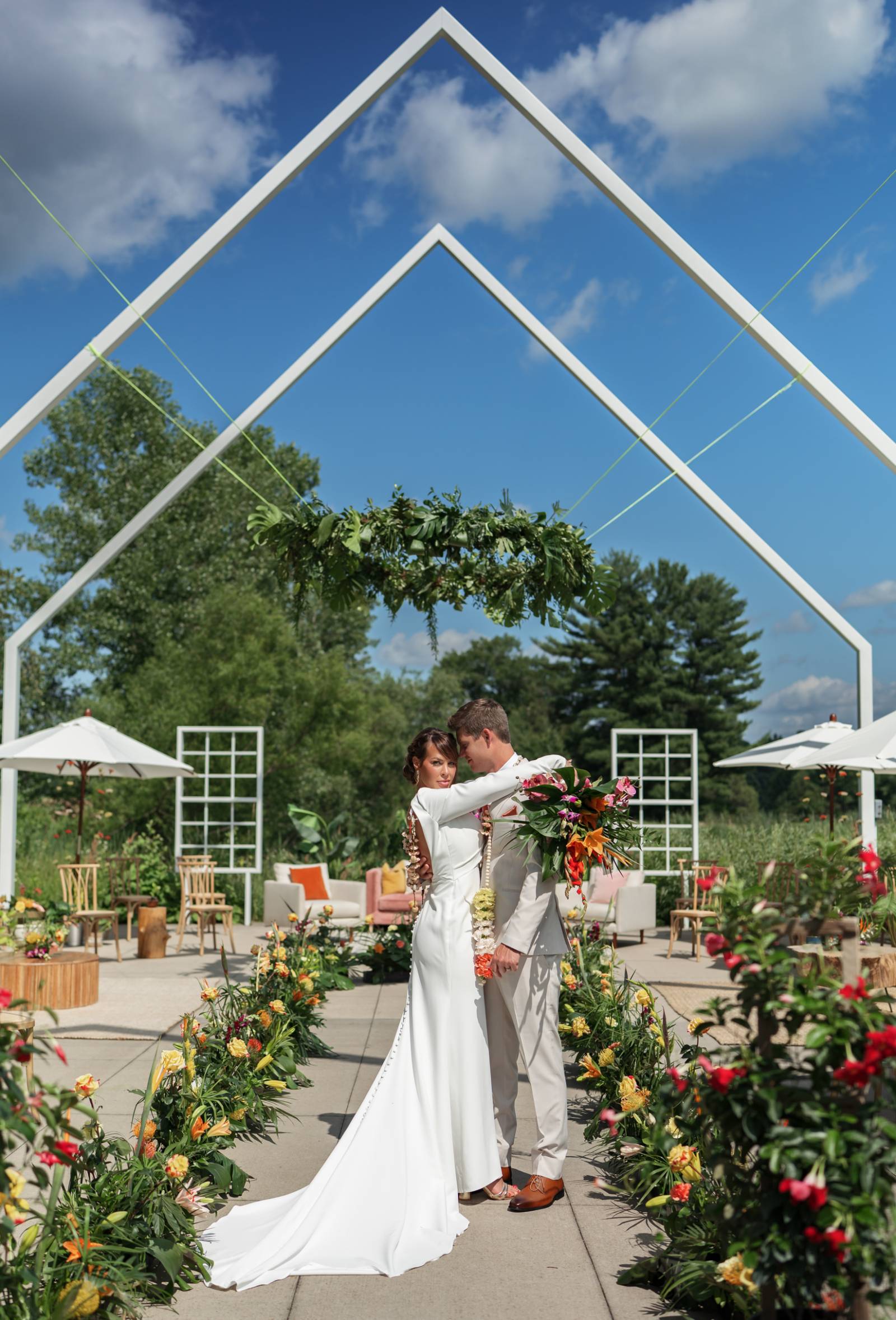 Flowers and greenery lined the ceremony aisle, set beneath an oversized wreath suspended from the open-air arches. The couple wore fashions from Brides N’ Belles, further accessorized by B-Style Floral.
