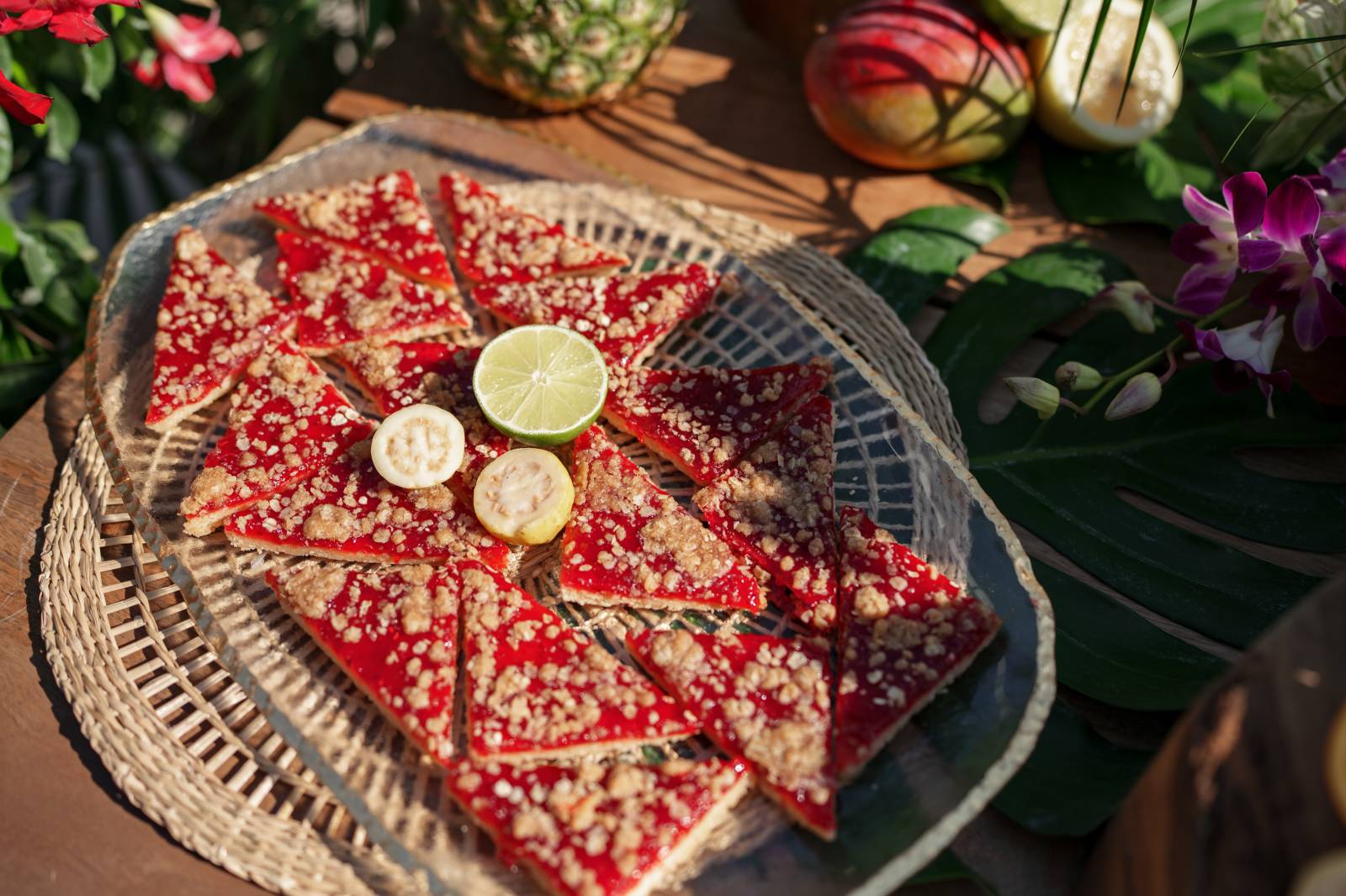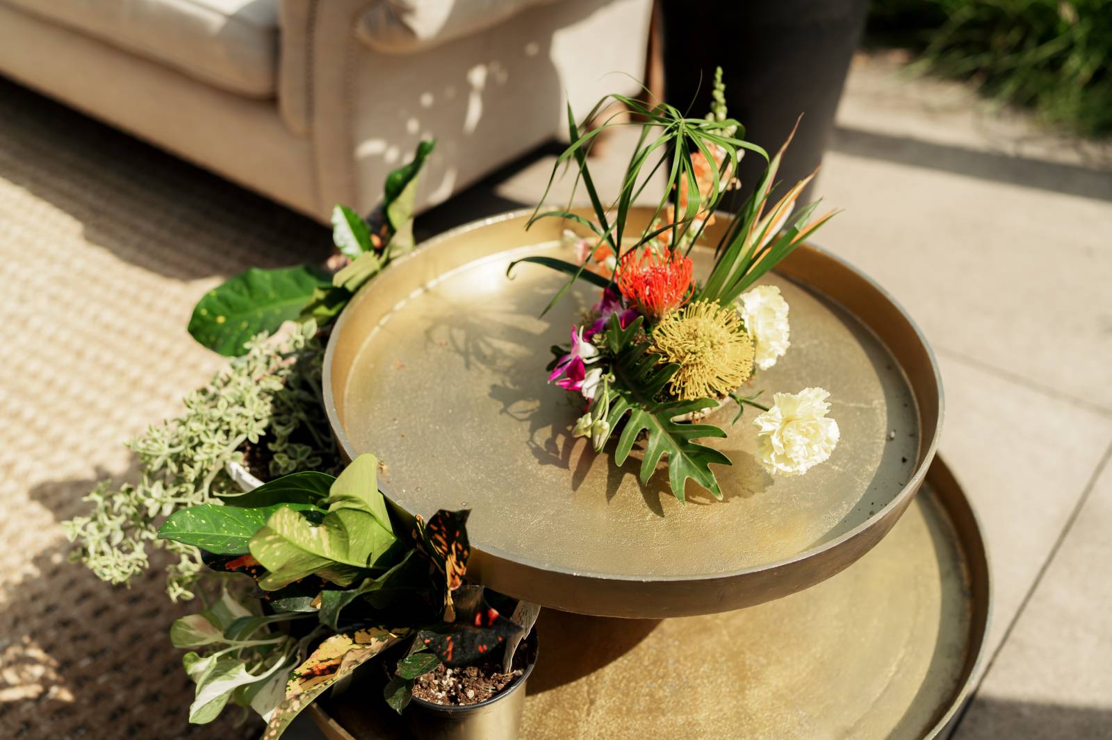 Rentals from Event Essentials and florals from B-Style Floral helped set every scene, from the lounges to the ceremony backdrop, tablescape, and dessert table. Blooms included birds of paradise, lilies, anthuriums, orchids, carnations, gladiolus, snapdragons, and pincushion proteas. Plentiful greenery framed the bold palette, with textures from aspidistra leaves, palms, monstera, umbrella palm, Italian ruscus, and xanadu leaves.